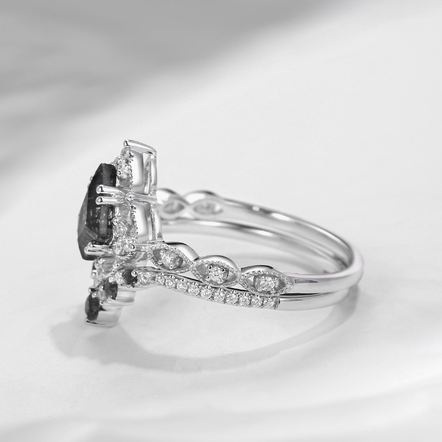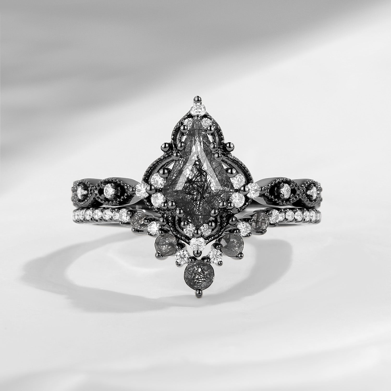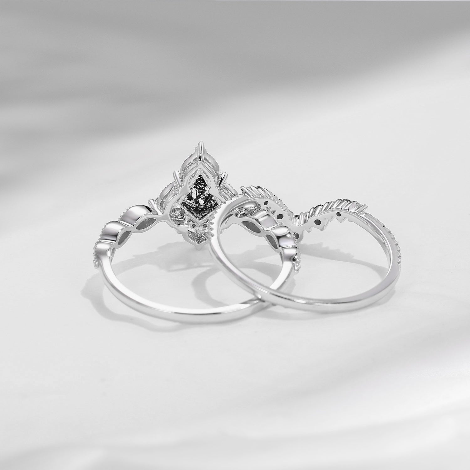 Crescent Moon | Coffin Cut Black Rutilated Quartz Engagement Ring Set 2pcs - Infinity Galaxy