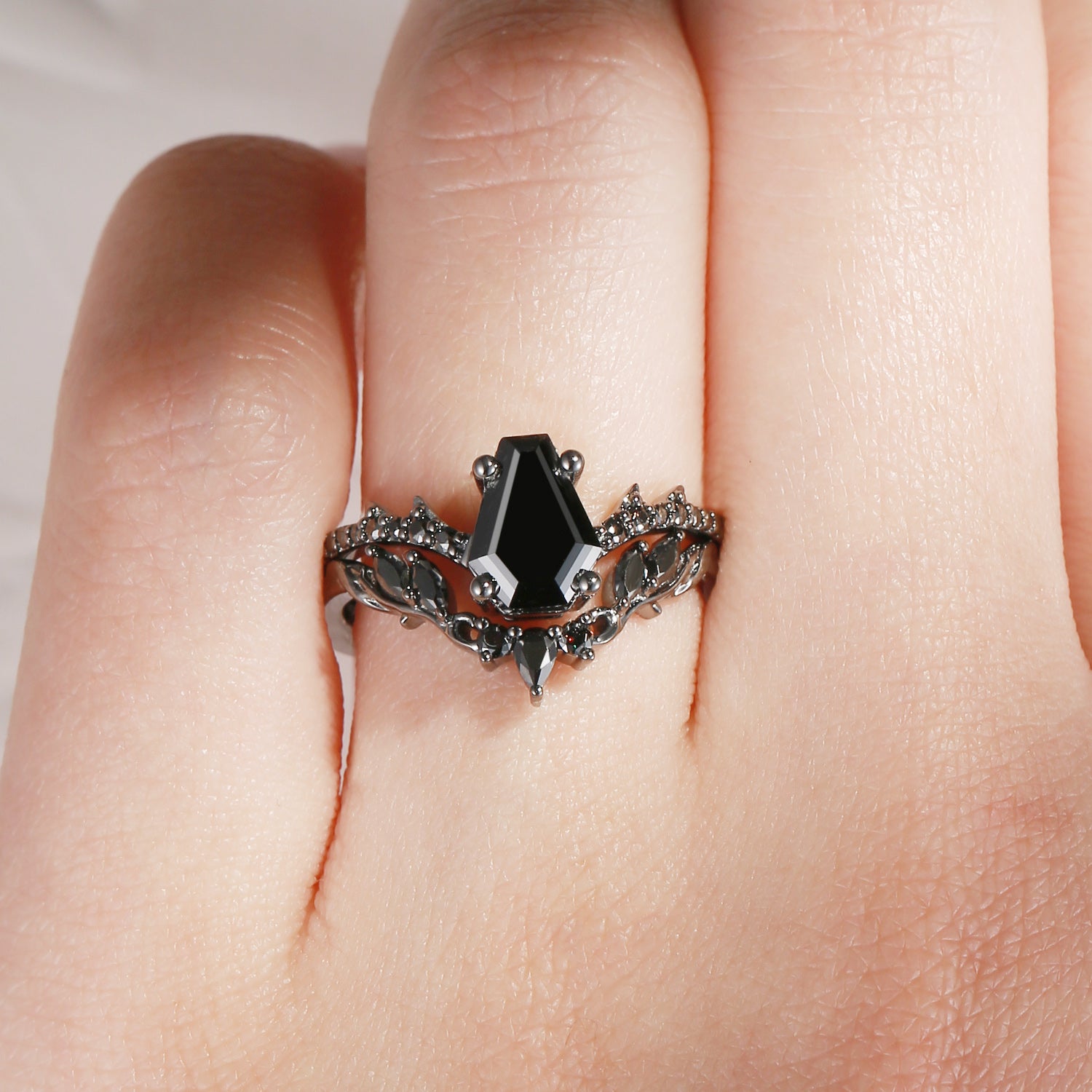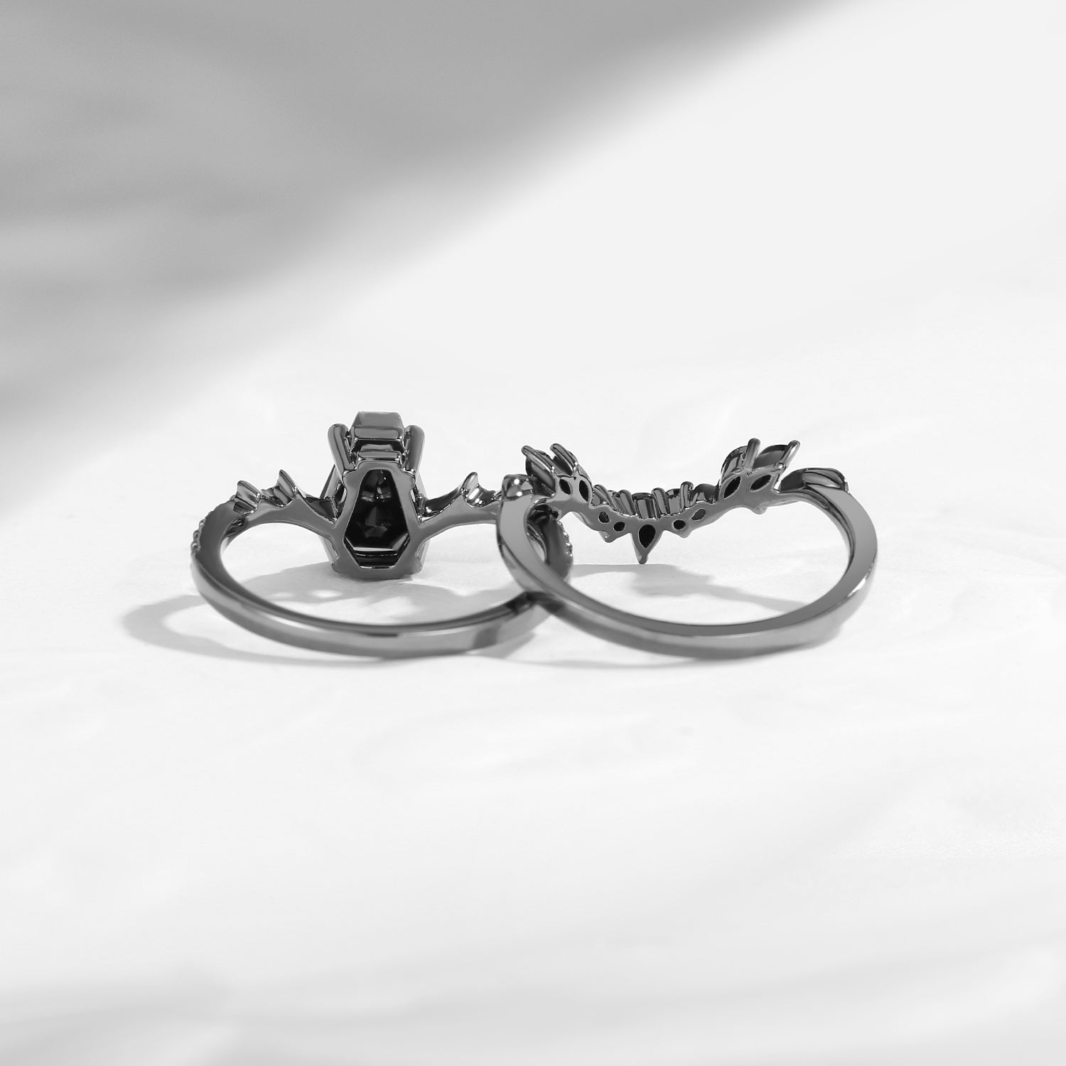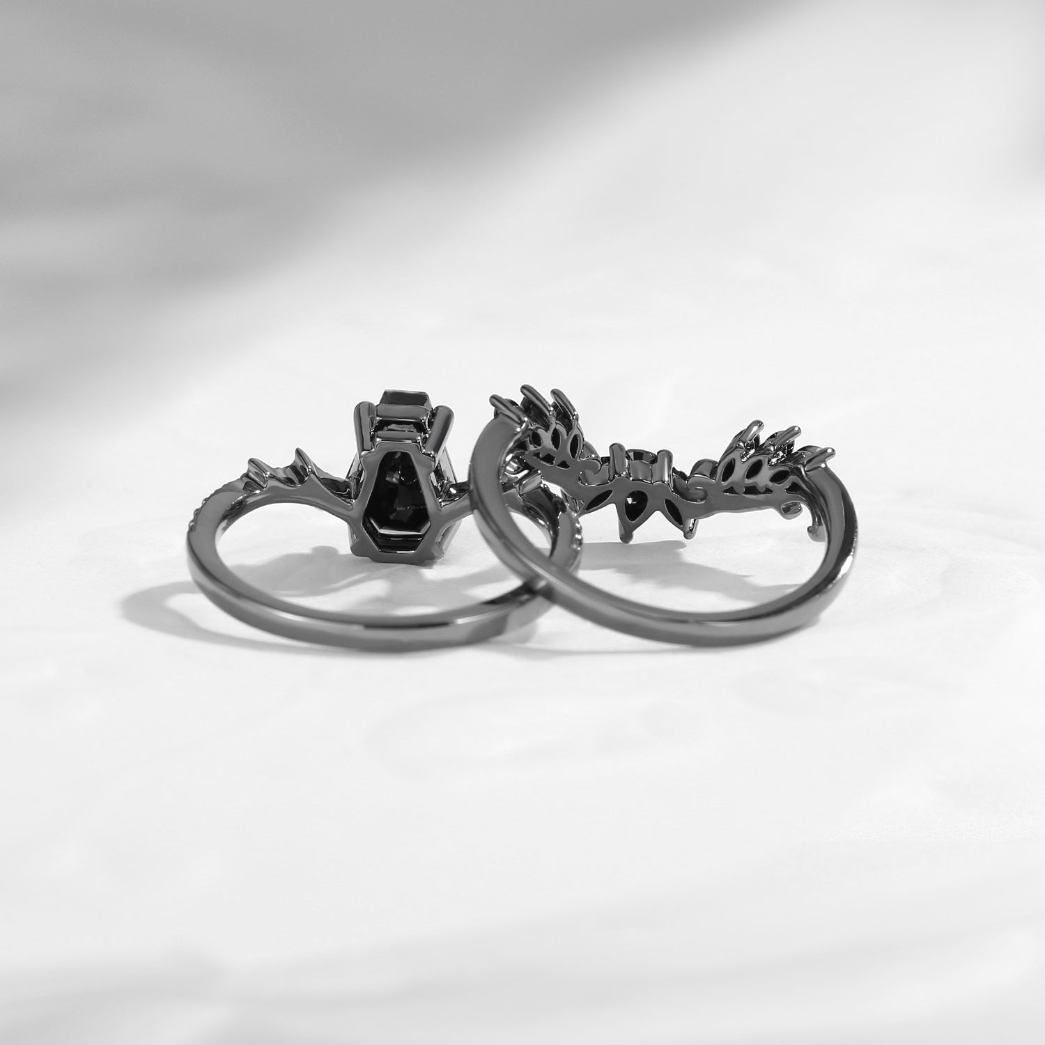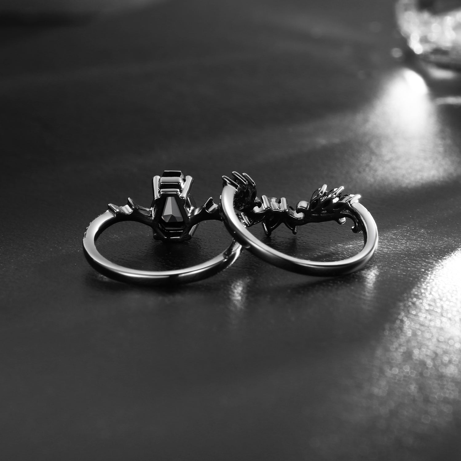 Gothic Style Coffin Black Moissanite Vine And Thorns Engagement Ring 2pcs