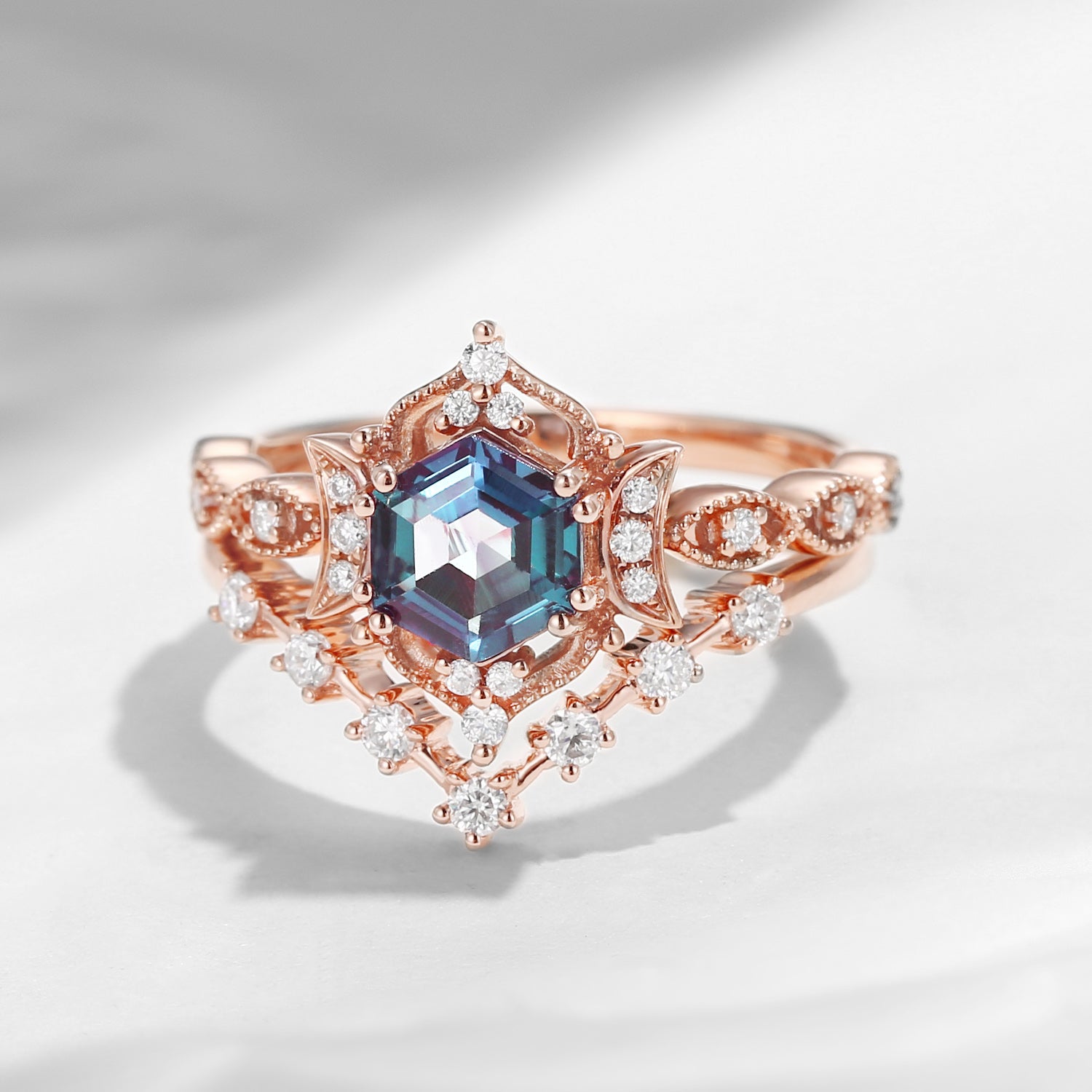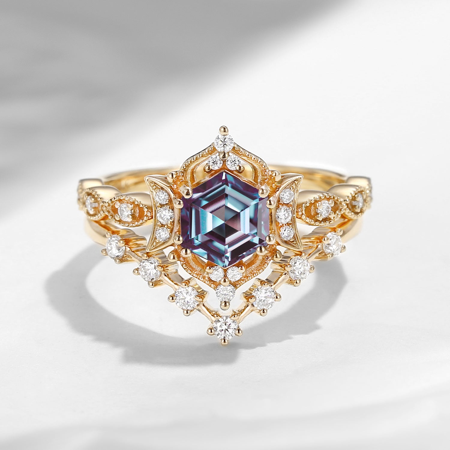 Crescent Moon | Unique Hexagon Lab Alexandrite Galaxy Wedding Ring Set 2PCS