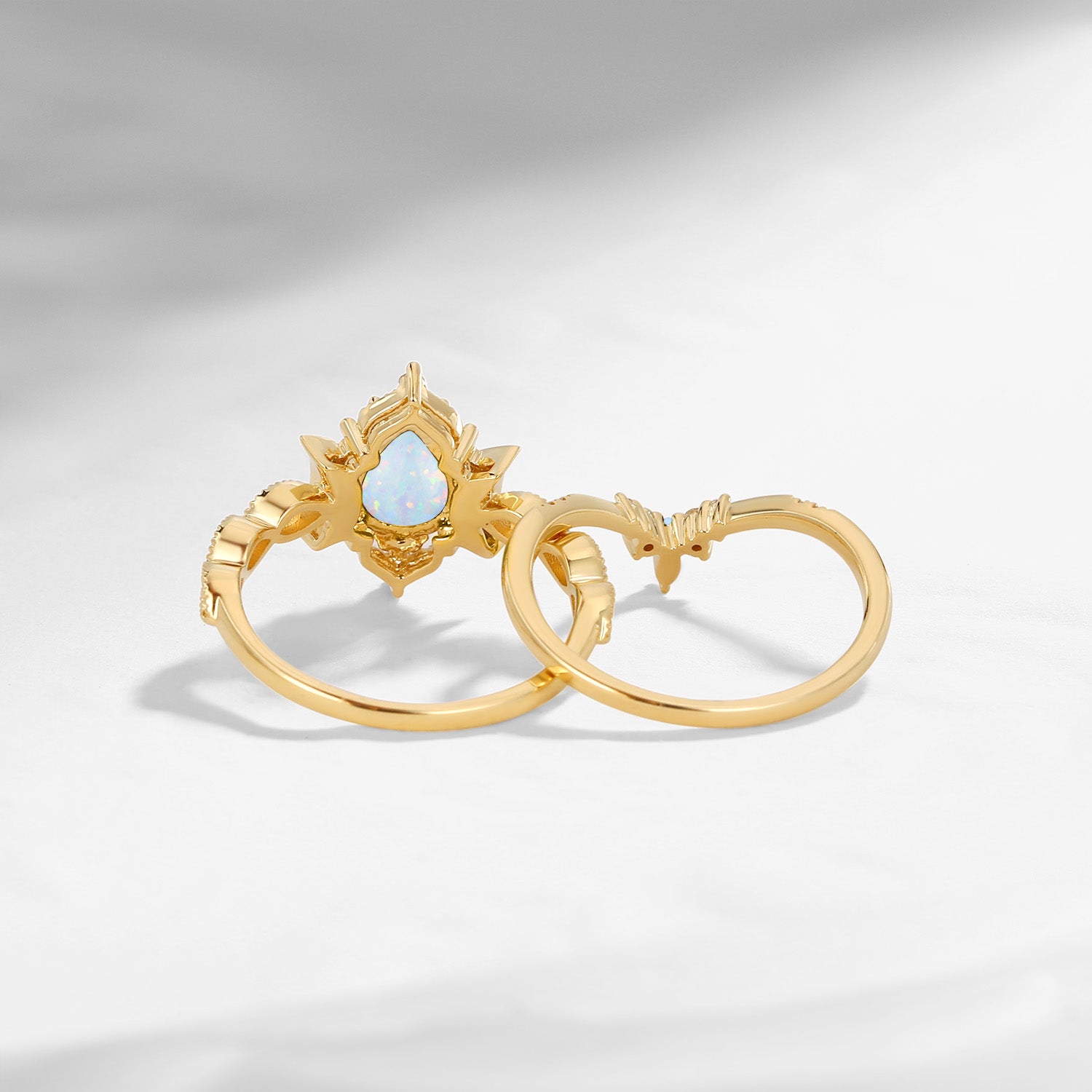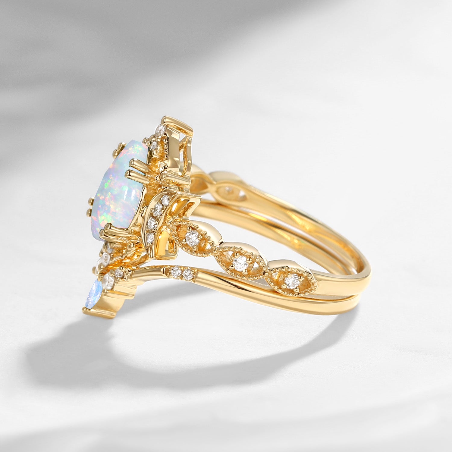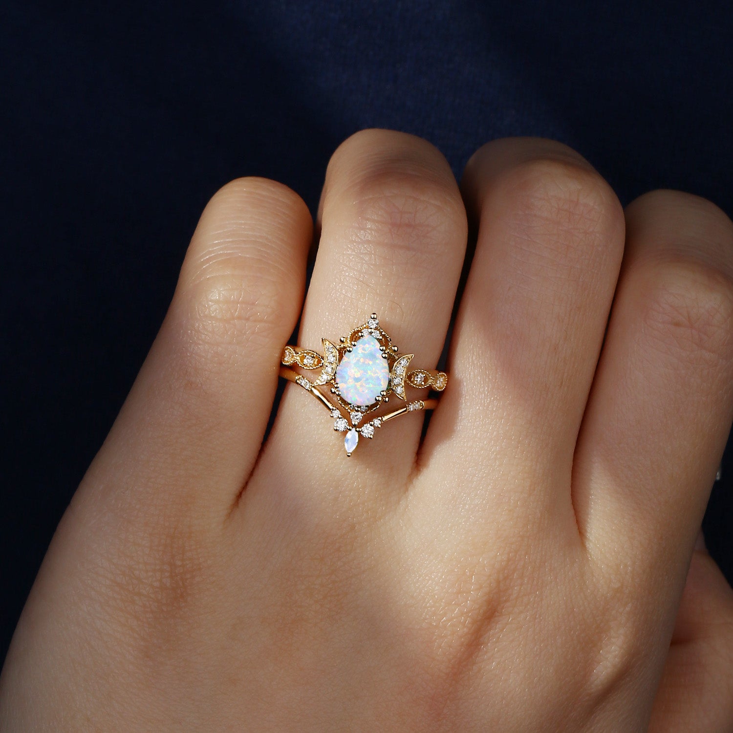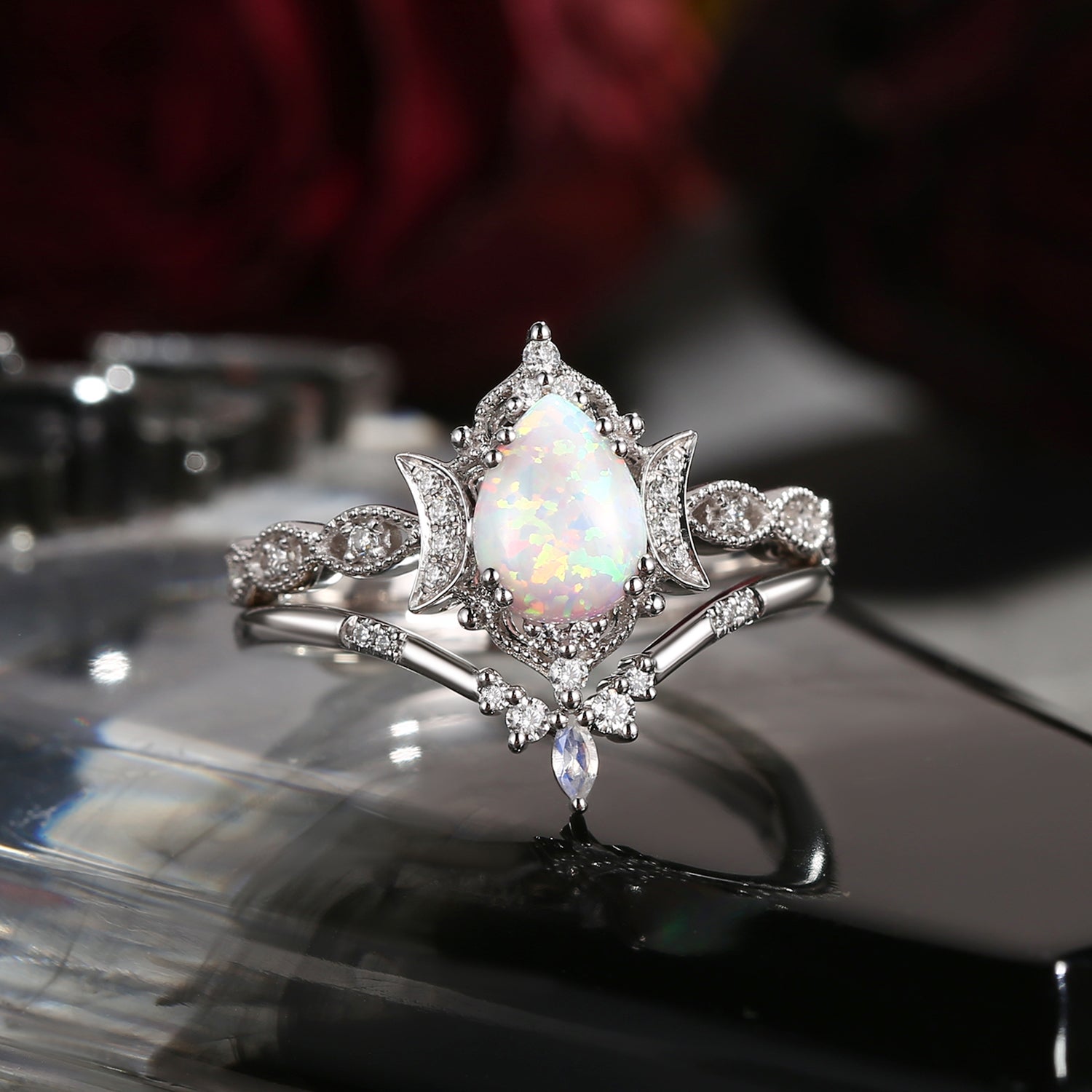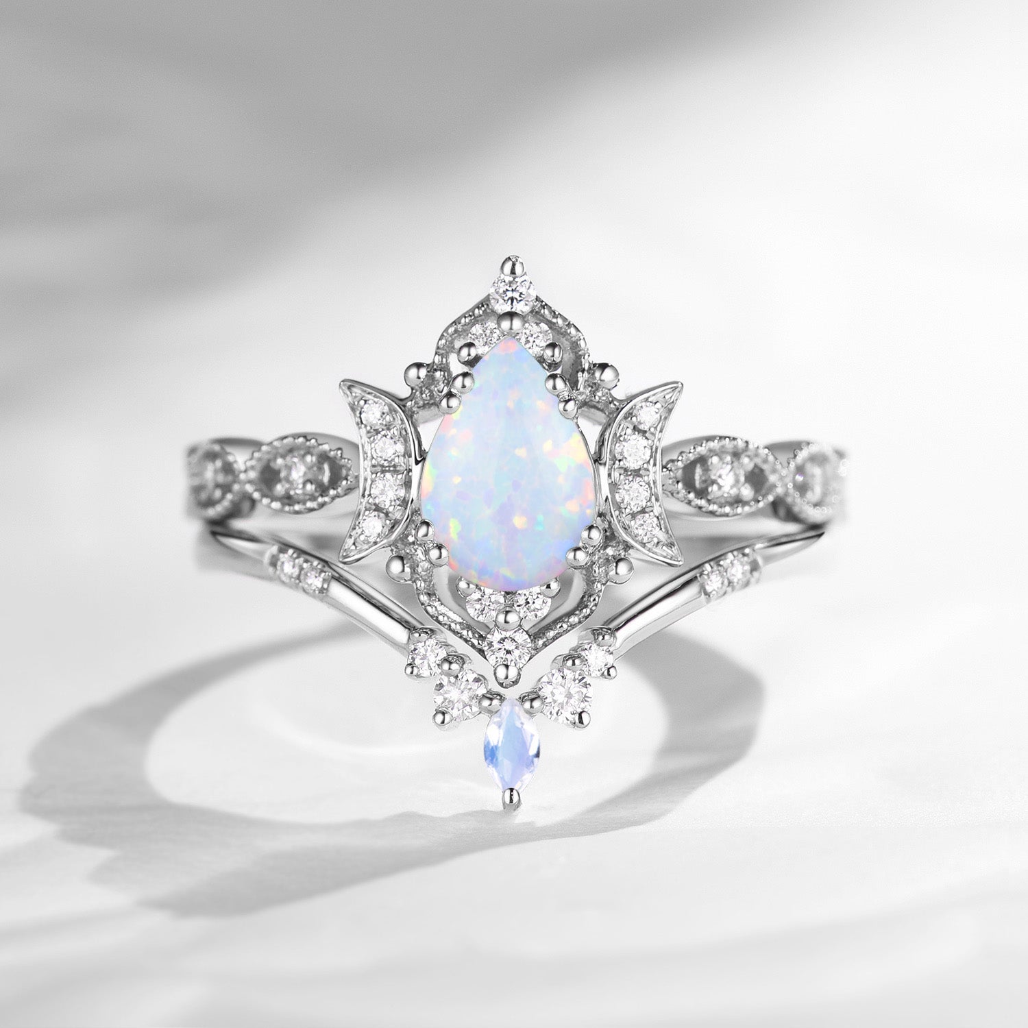 Crescent Moon | Unique White Opal Moonstone Engagement Ring Set 2pcs - Luna