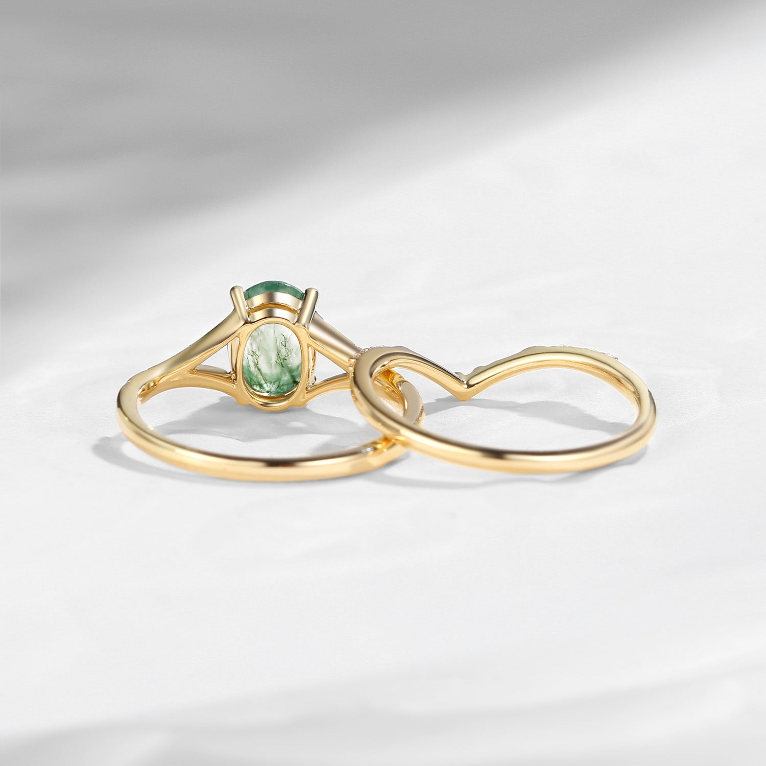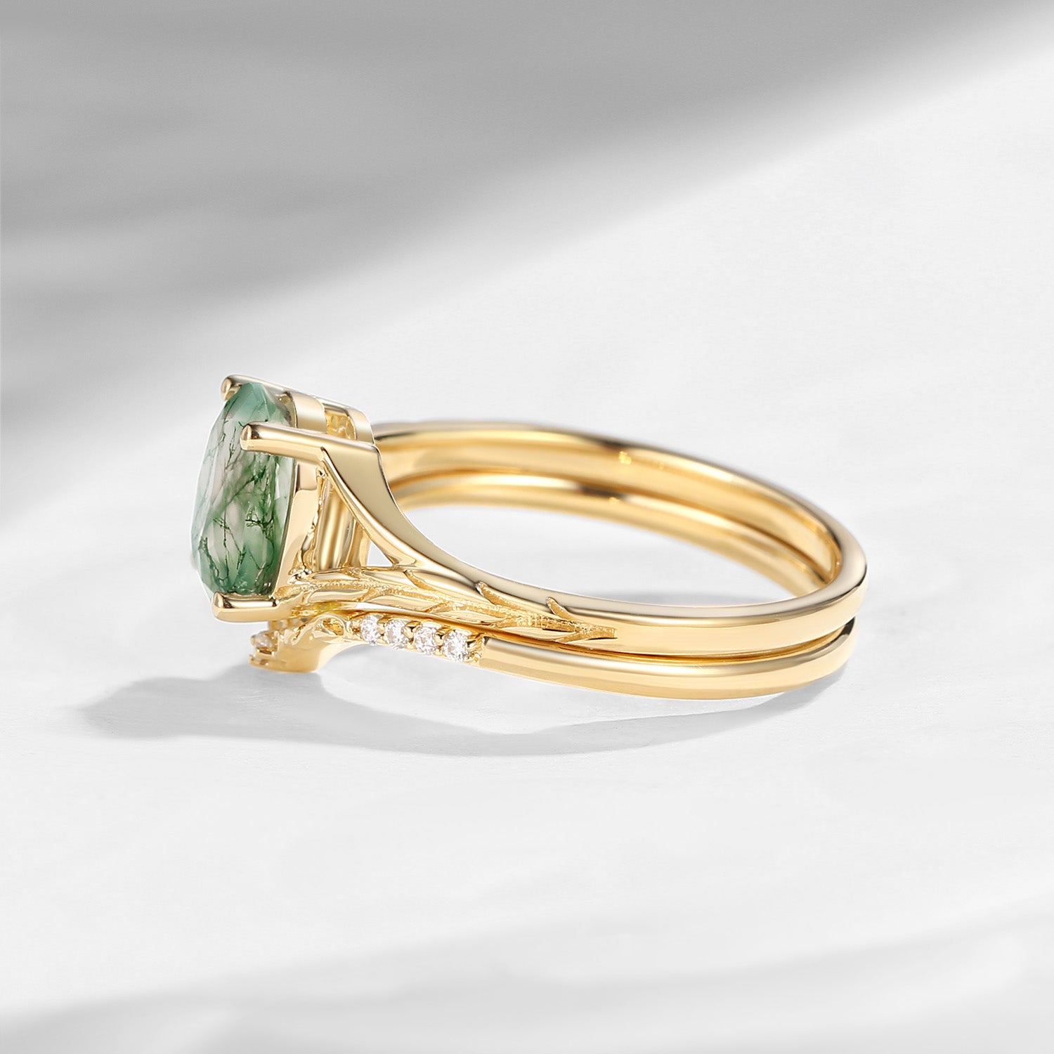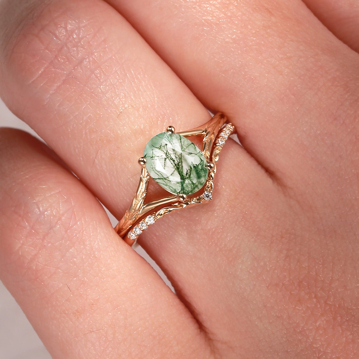 Nature Inspired Oval Cut Moss Agate Textured Engagement Ring Set 2pcs