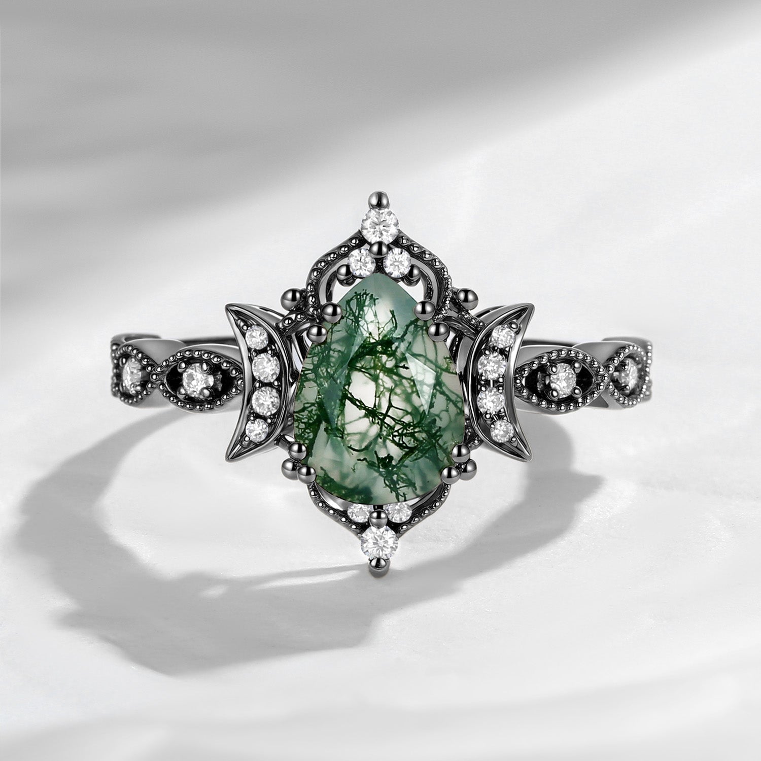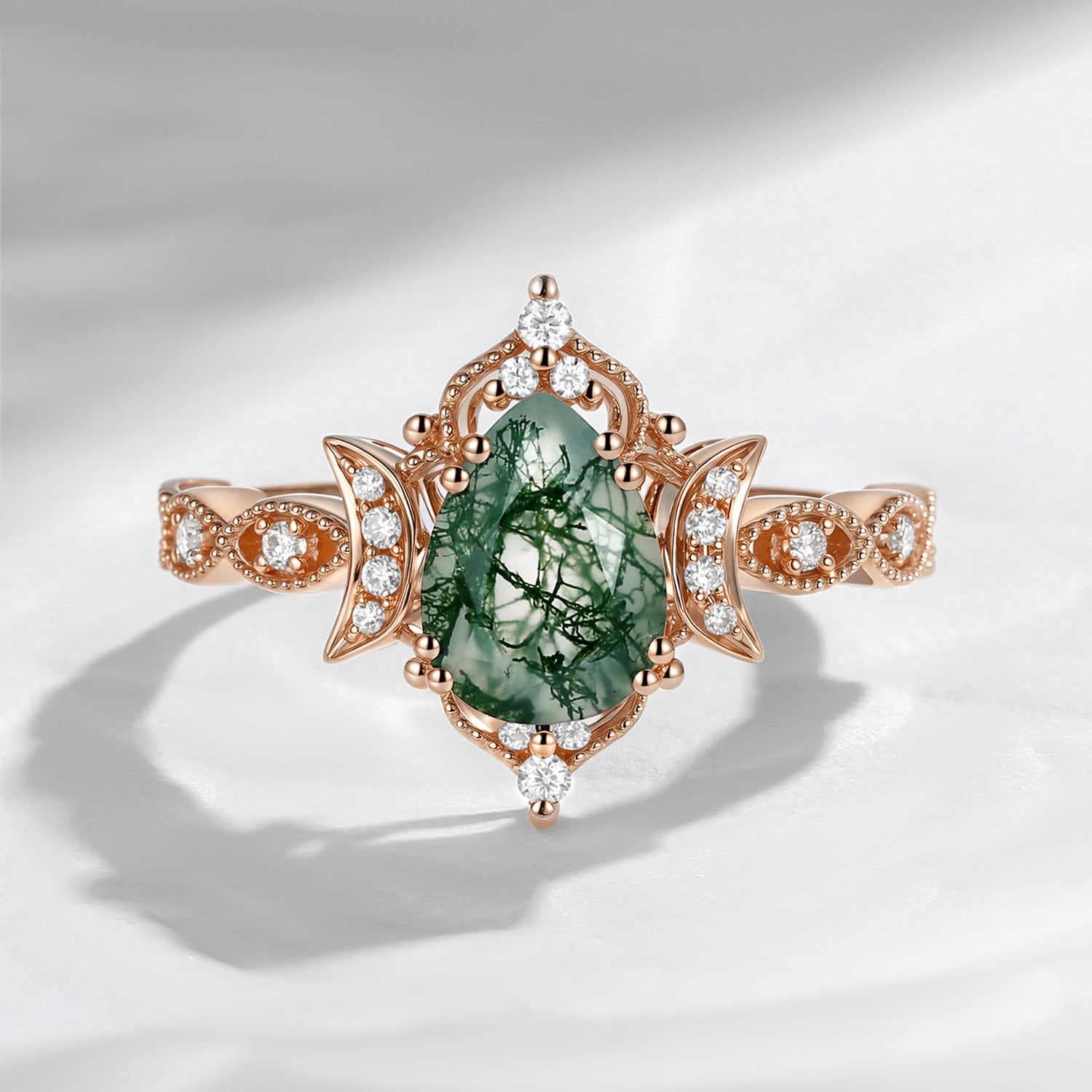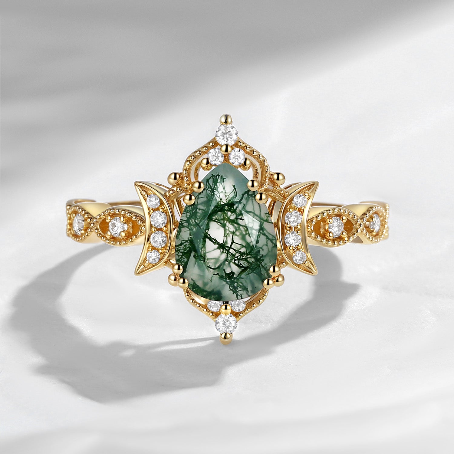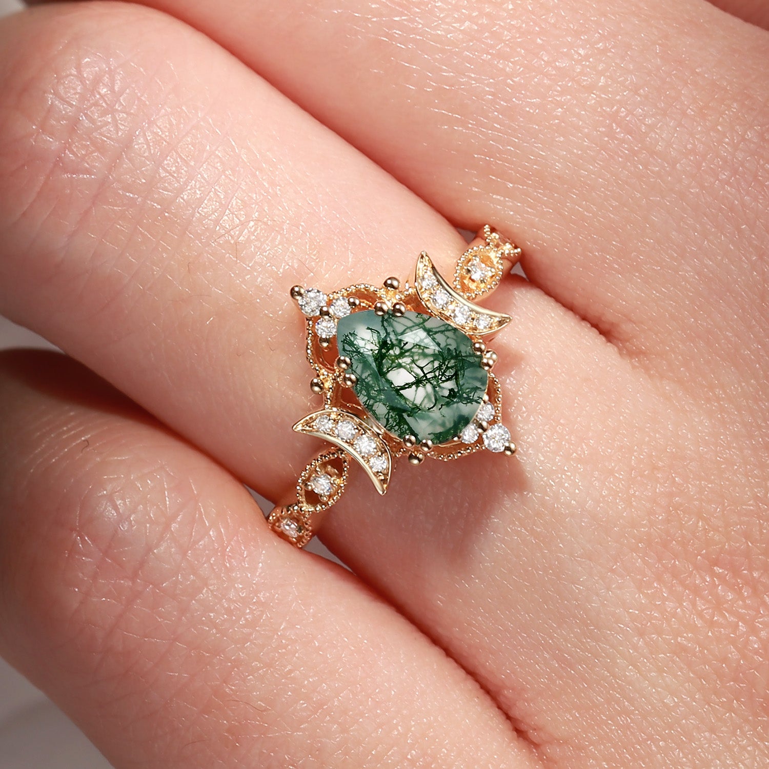 Crescent Moon | Unique Pear Shaped Moss Agate Engagement Ring
