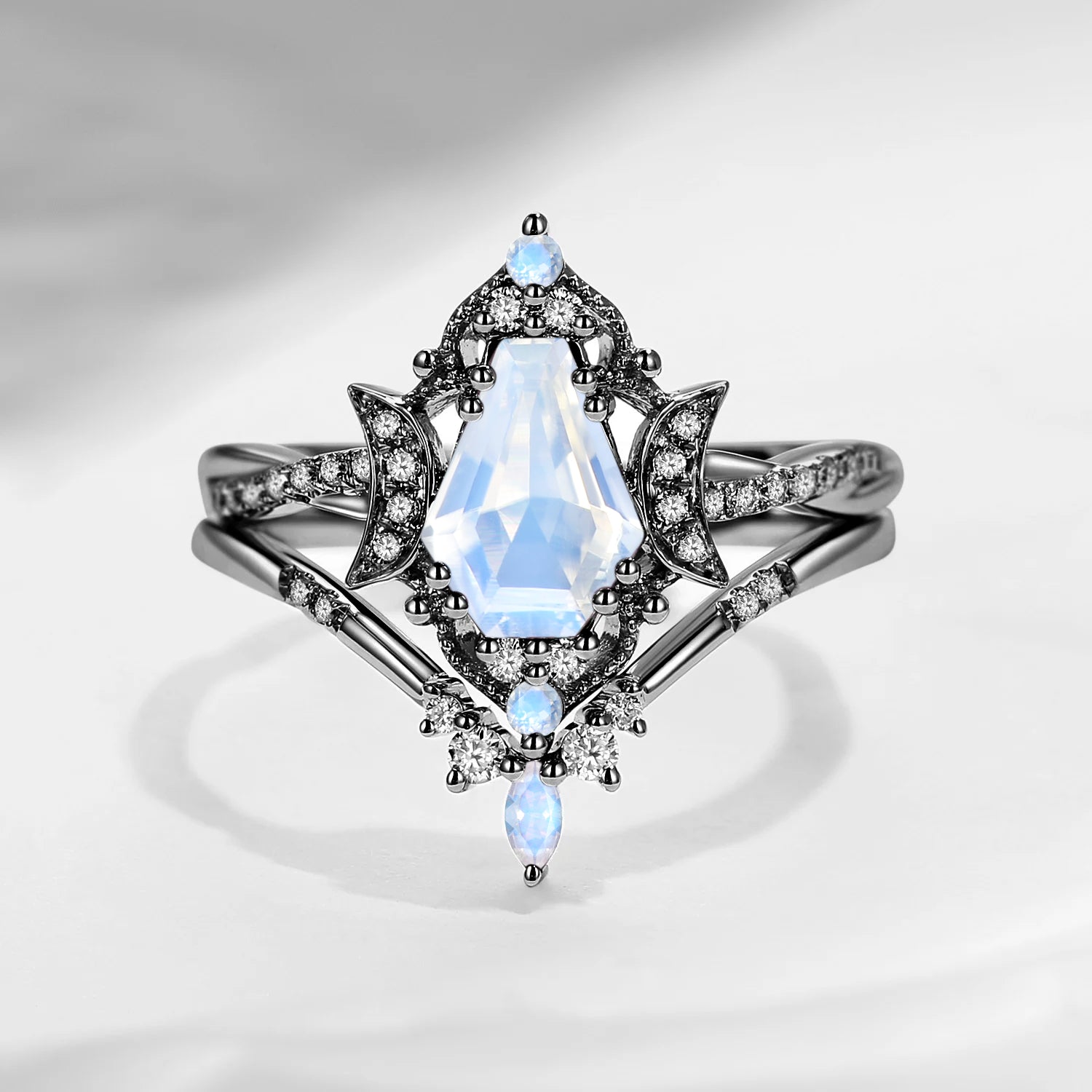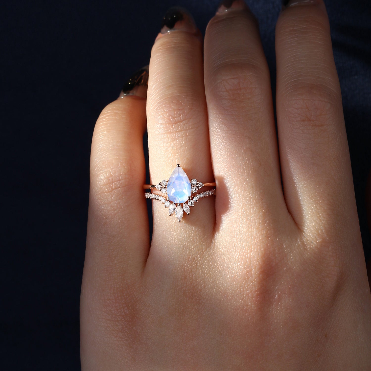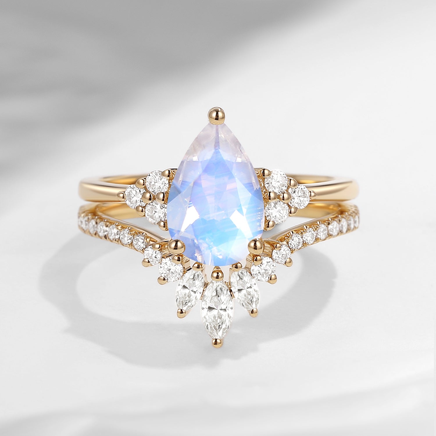 Pear Shaped Classic Cluster Moonstone Engagement Ring Set 2pcs - Vivian
