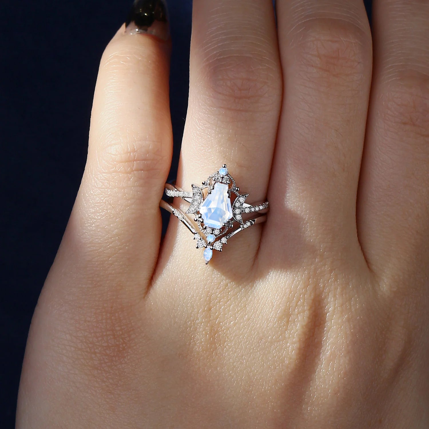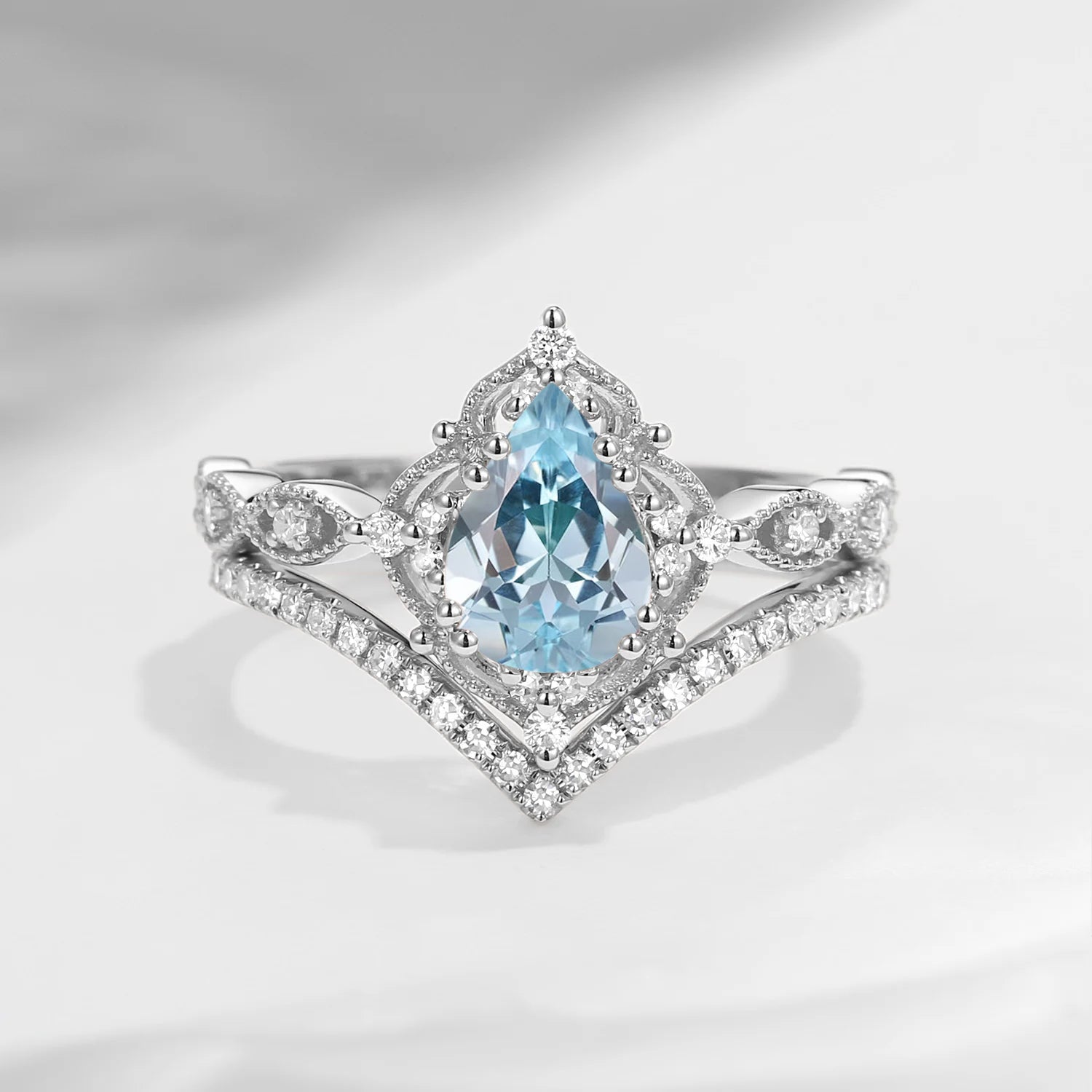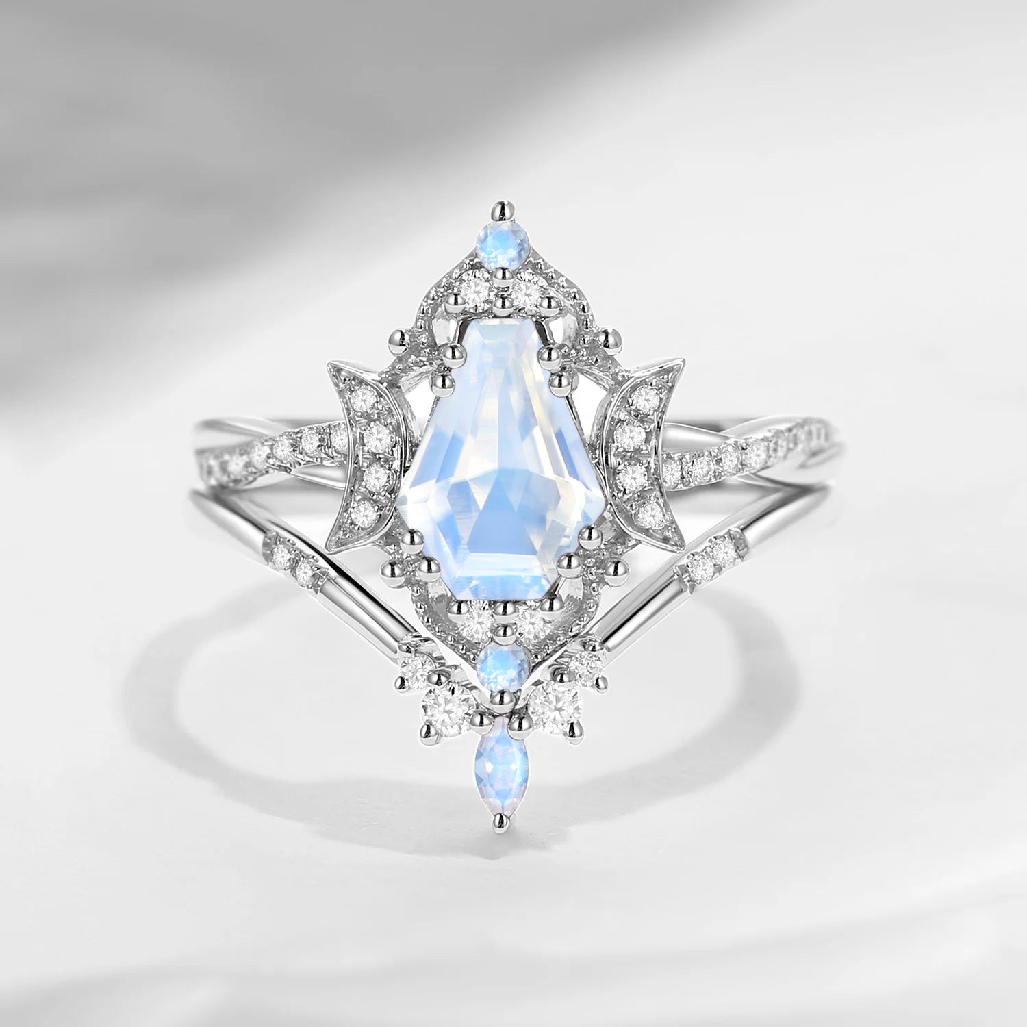 Pear Shaped Classic Cluster Moonstone Engagement Ring Set 2pcs - Vivian