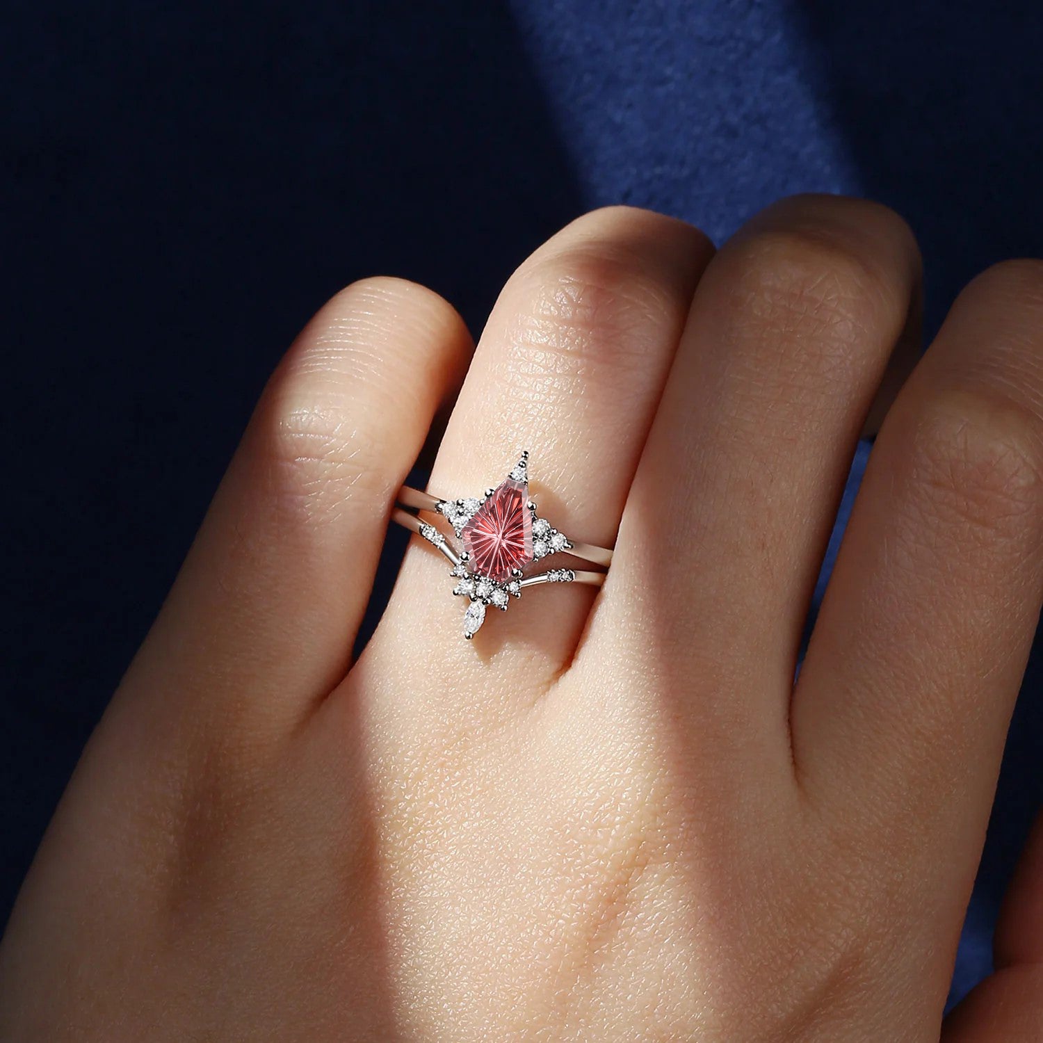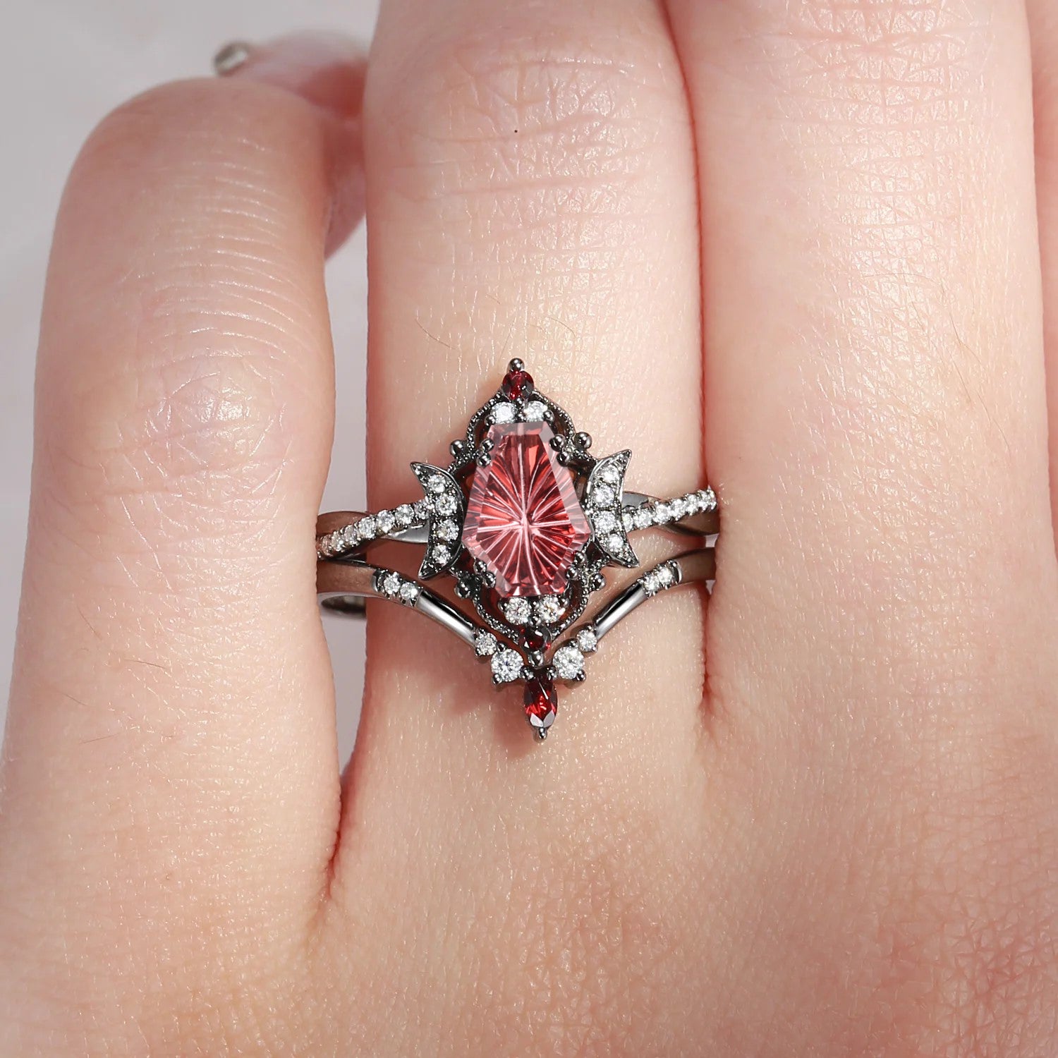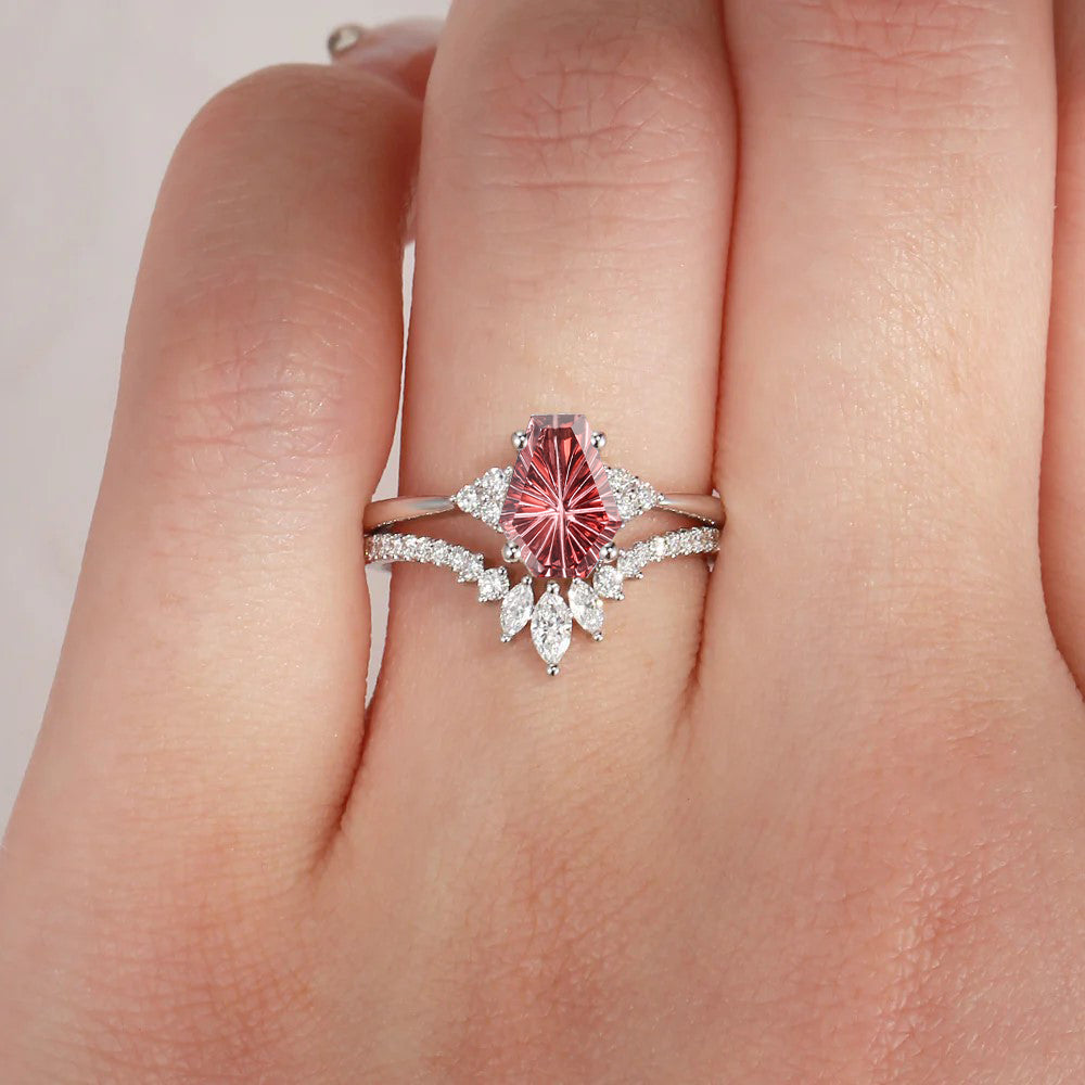 Unique Firework Cut Coffin Garnet Engagement Ring Set 2pcs - Coffin Kite