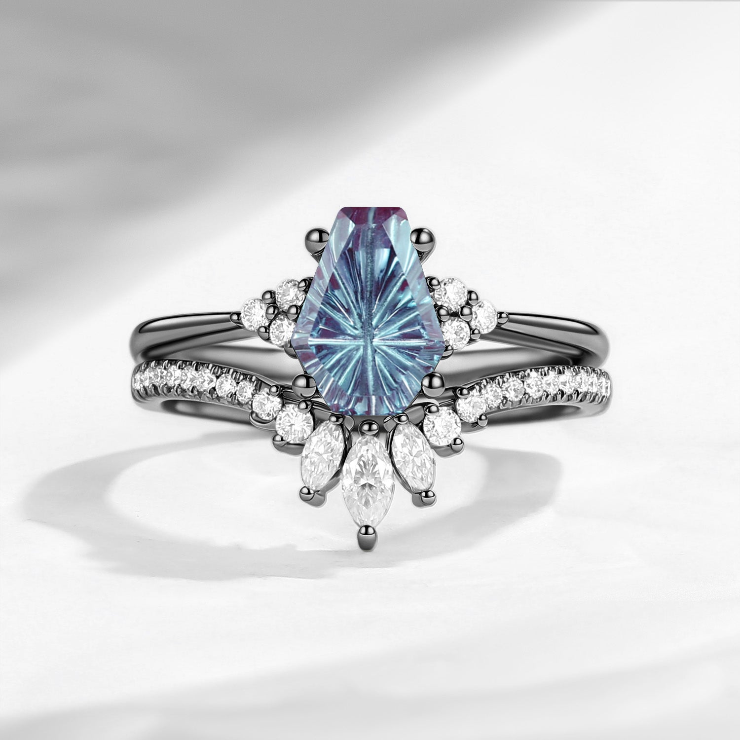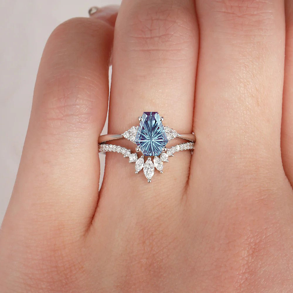 Firework Cut Coffin Lab Alexandrite Engagement Set 2pcs - White Dress