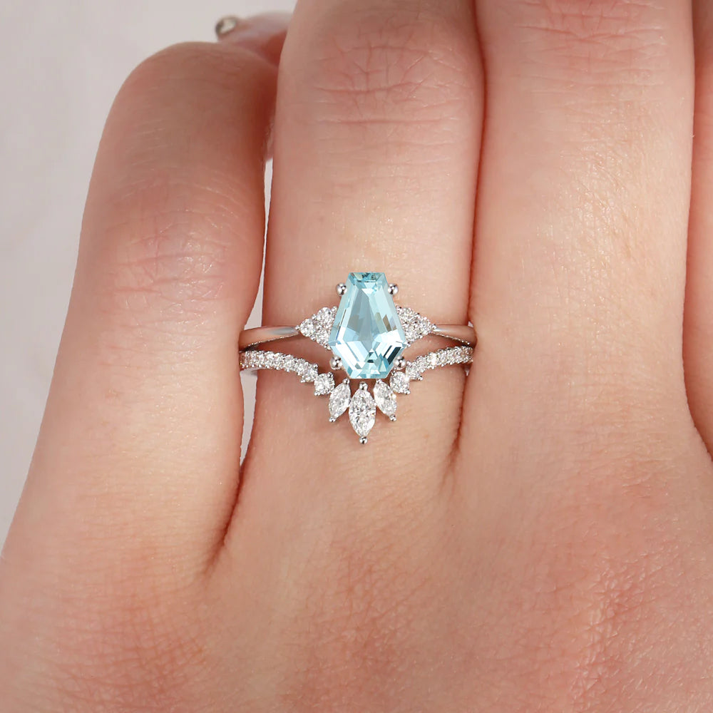 Classic Coffin Cut Natural Aquamarine Engagement Set 2pcs - White Dress