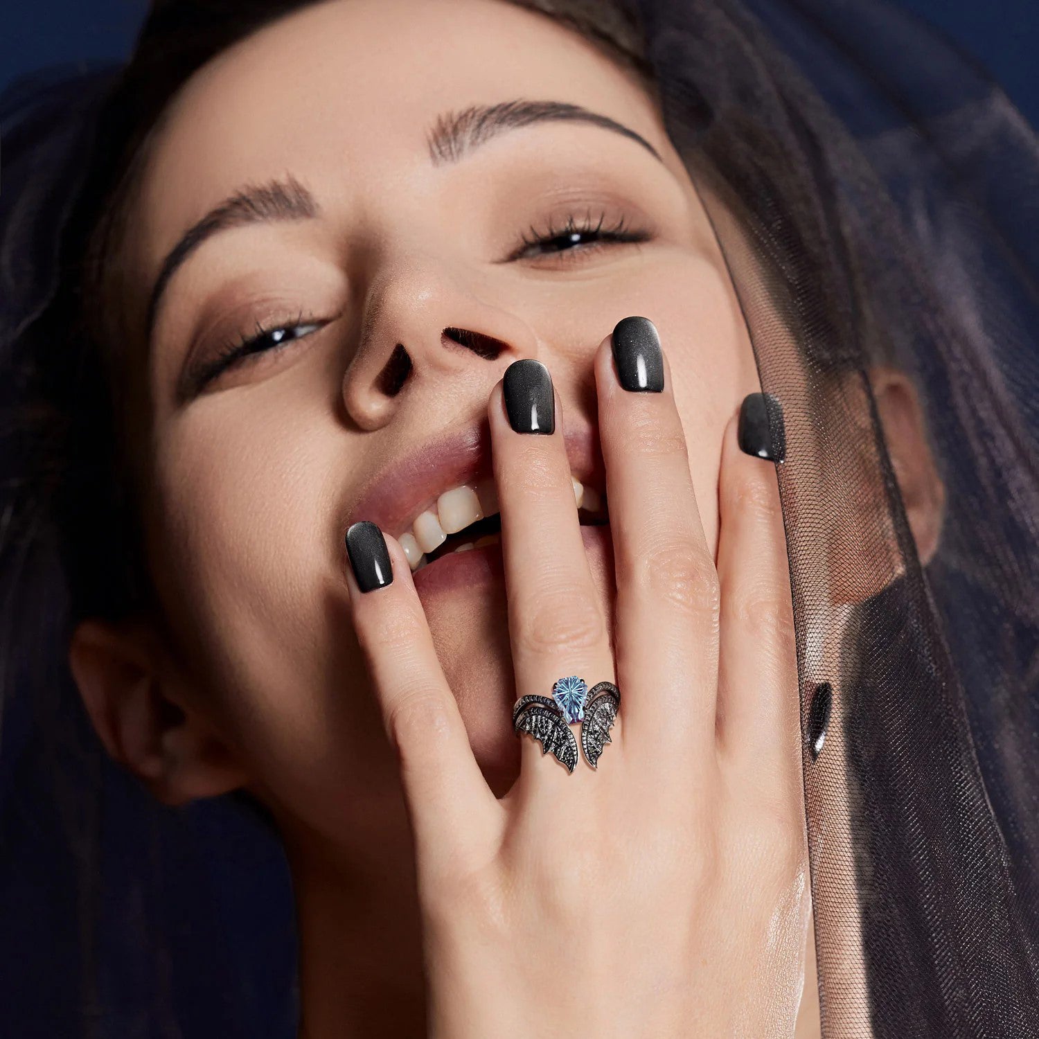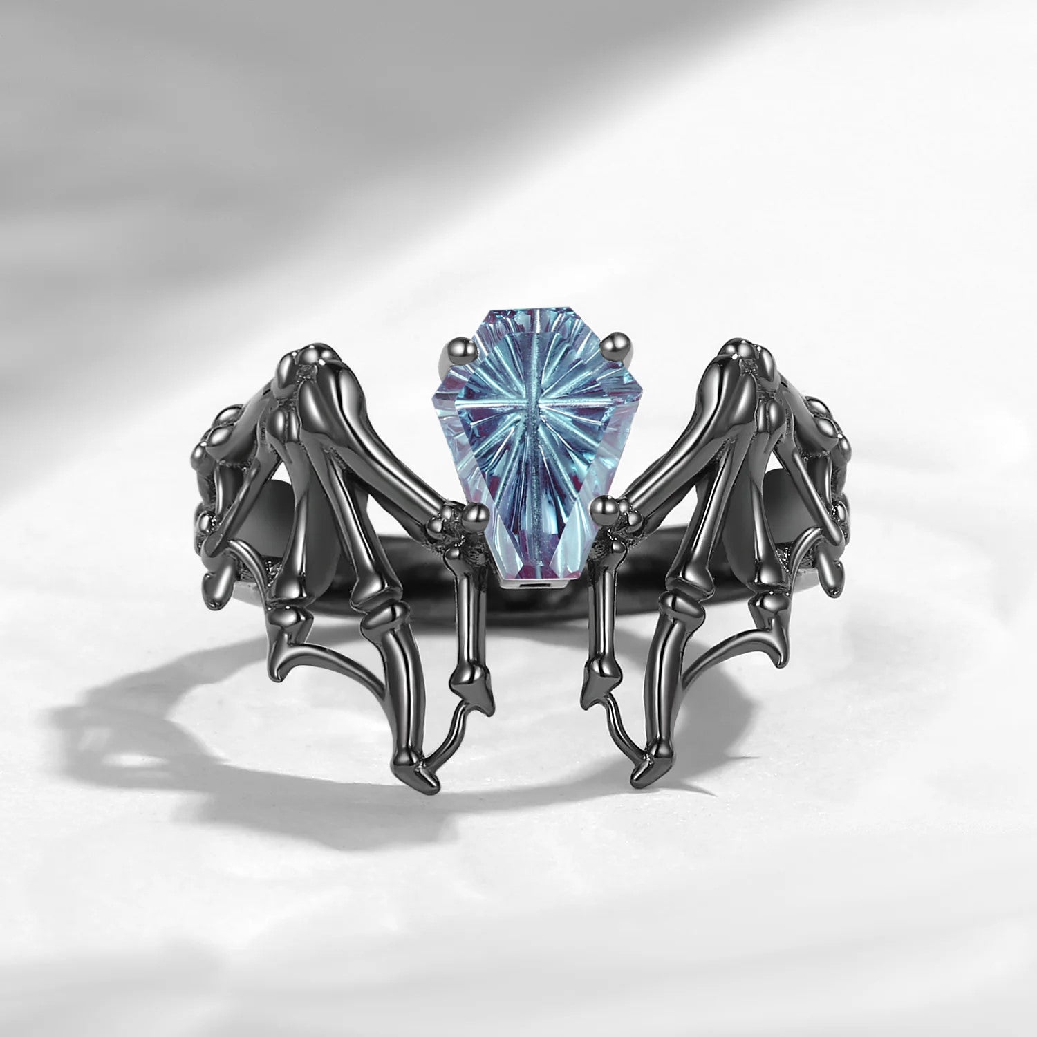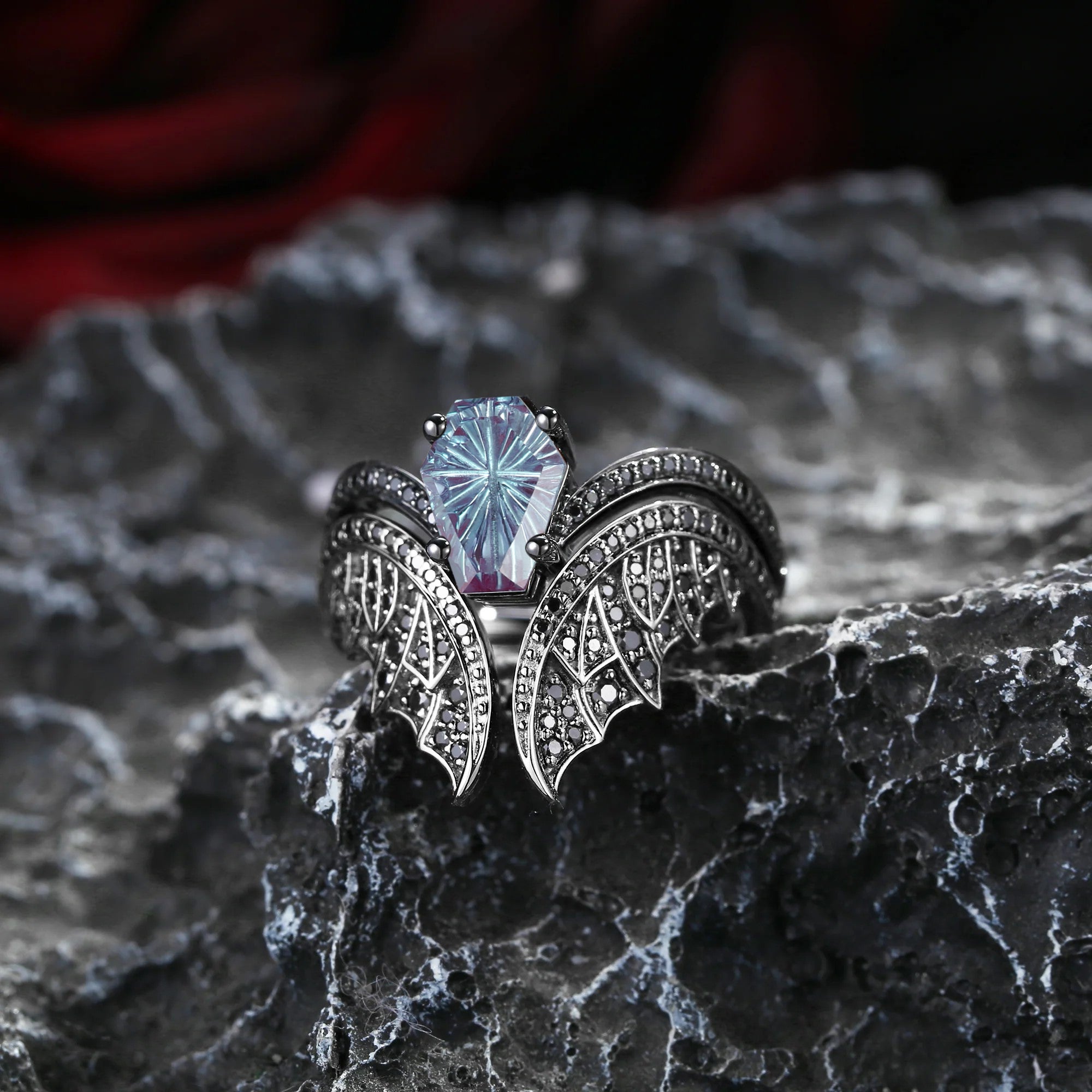 Firework Cut Lab Alexandrite Coffin Black Gold Bridal Set 2pcs - Bat Ring