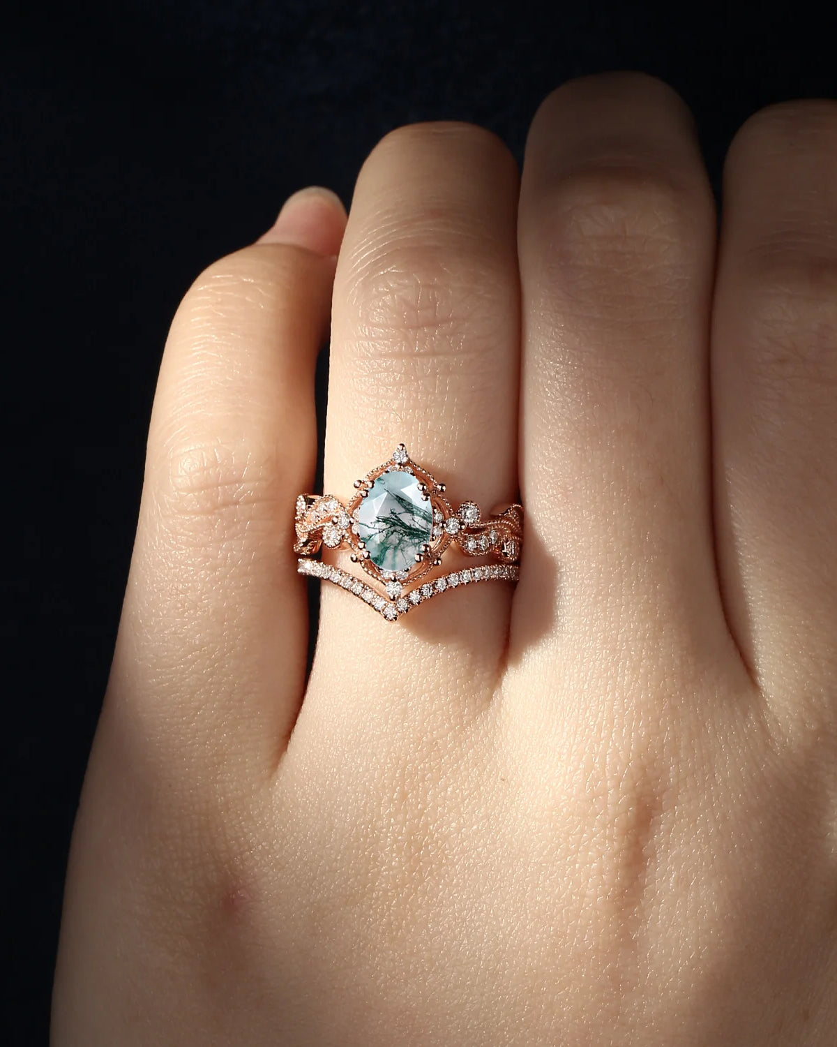 Bette‘s Eyes | Moss Agate Engagement Ring Set 3pcs
