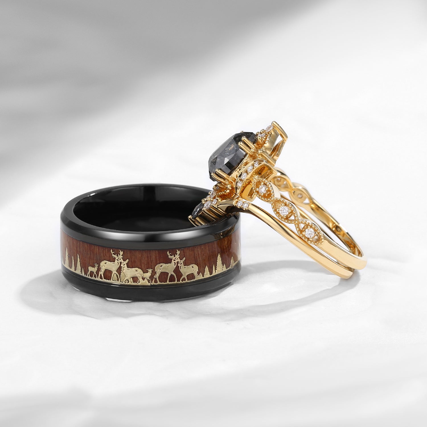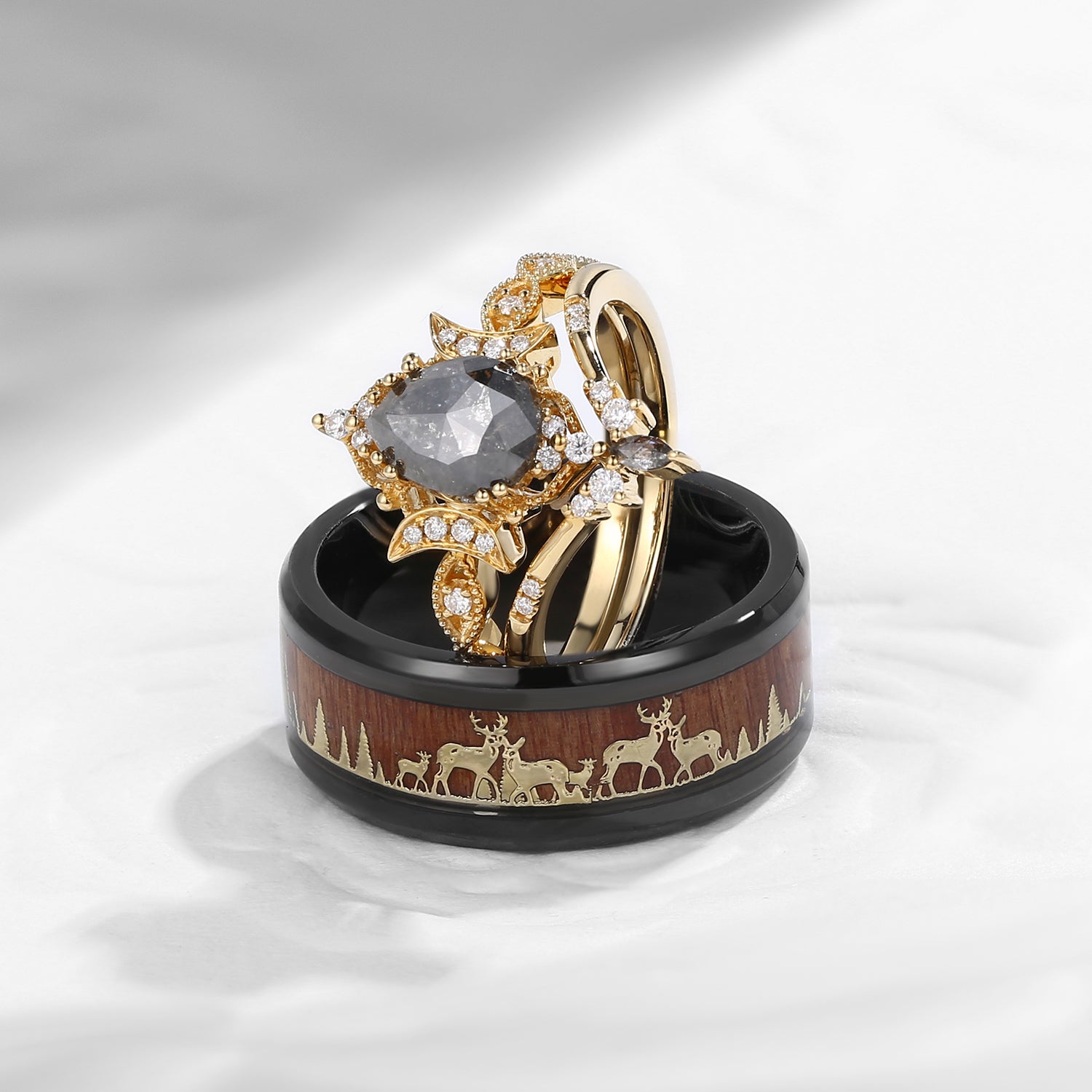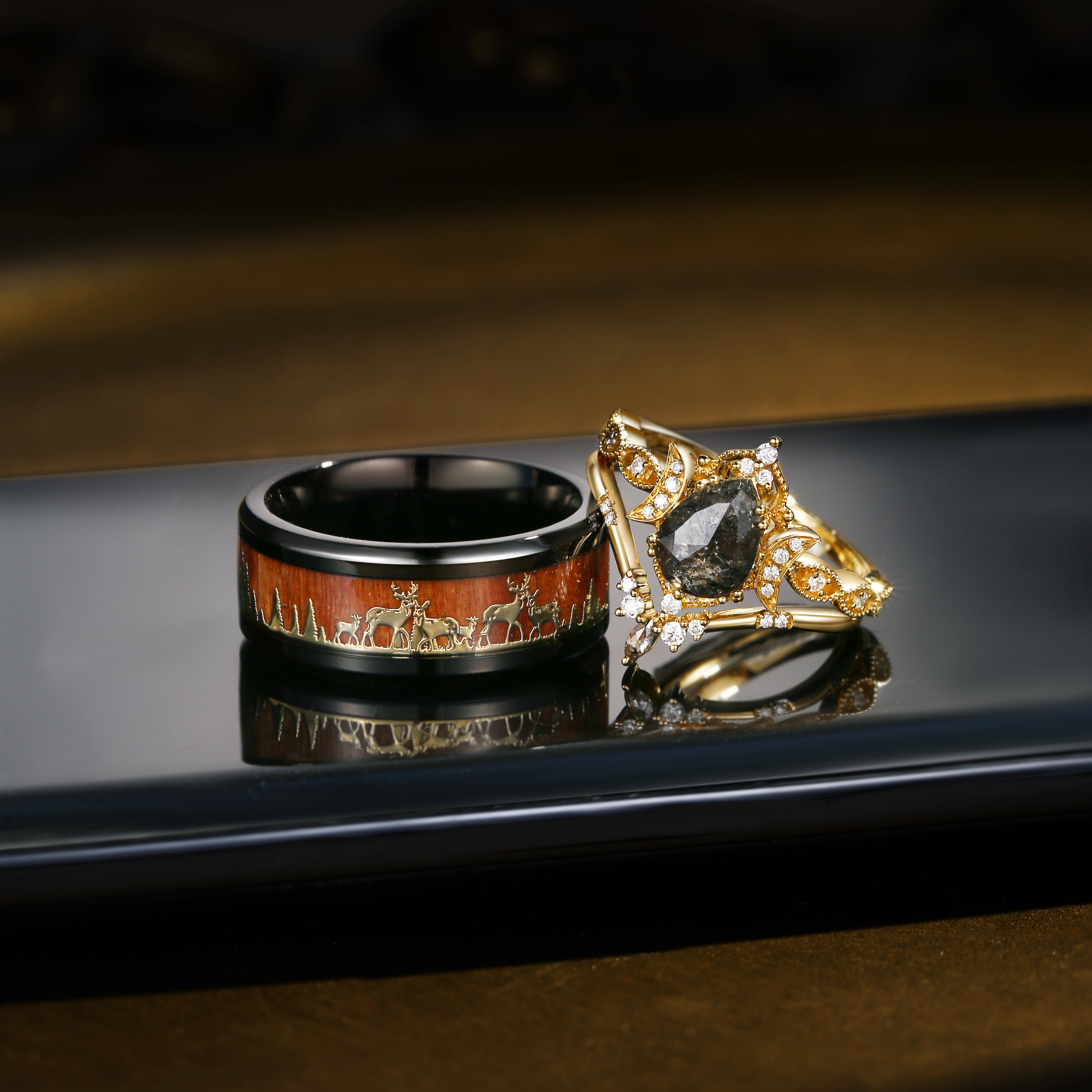 Gothic Inspired Hexagon Cut Black Rutilated Quartz 'Fallen Aegis' Shield Engagement Ring Set 3pcs