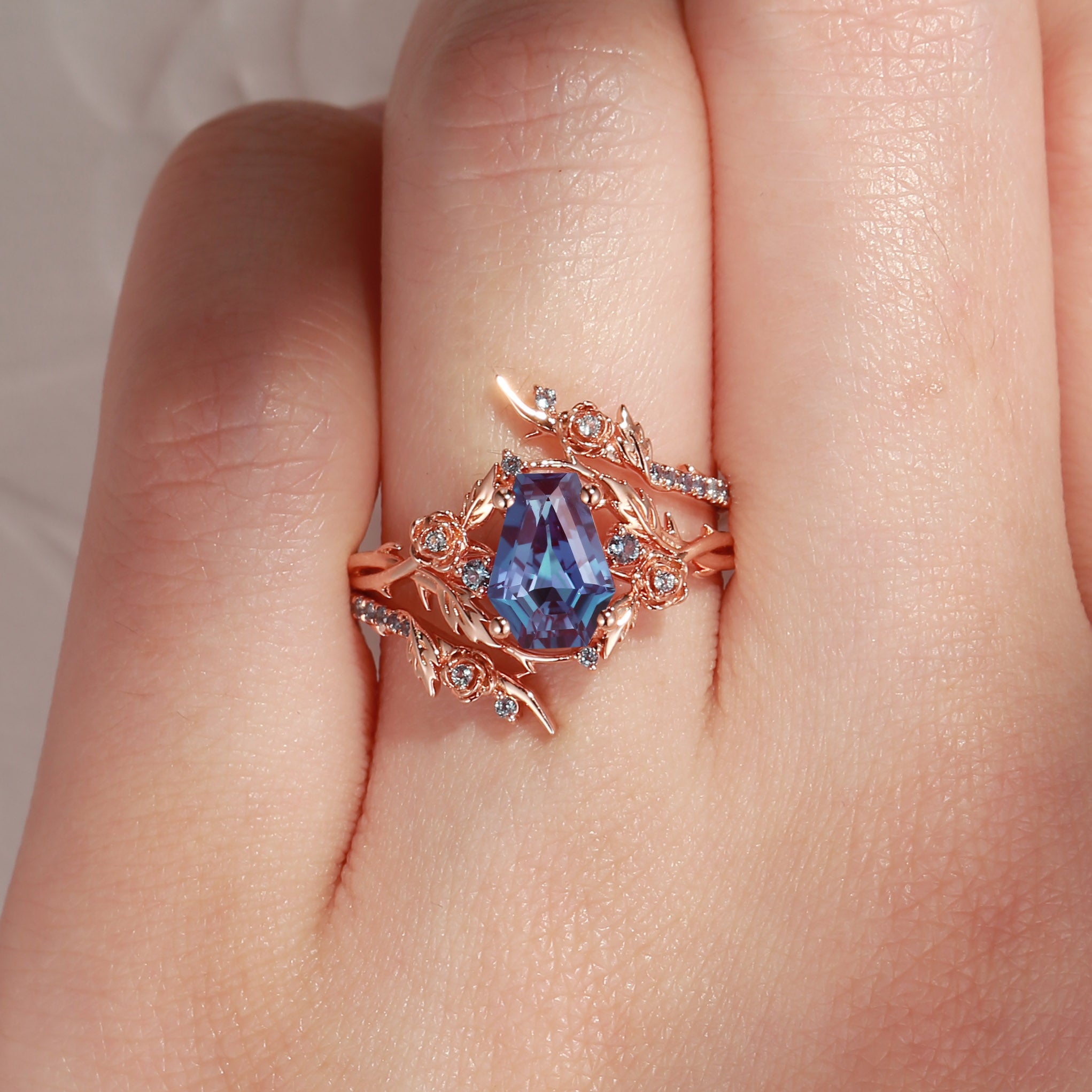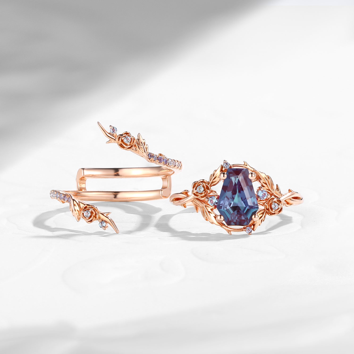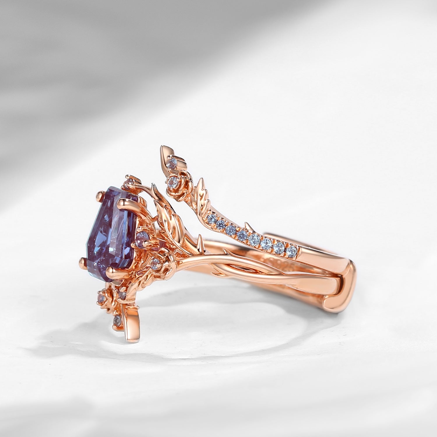 Nature Inspired Twist Coffin Cut Lab Alexandrite Engagement Ring Set 2pcs