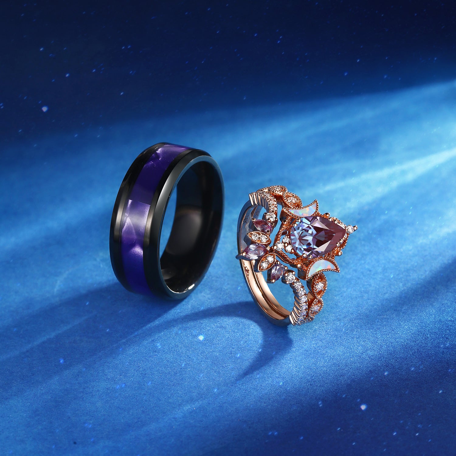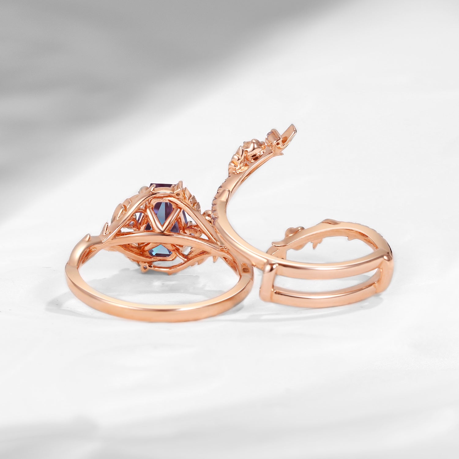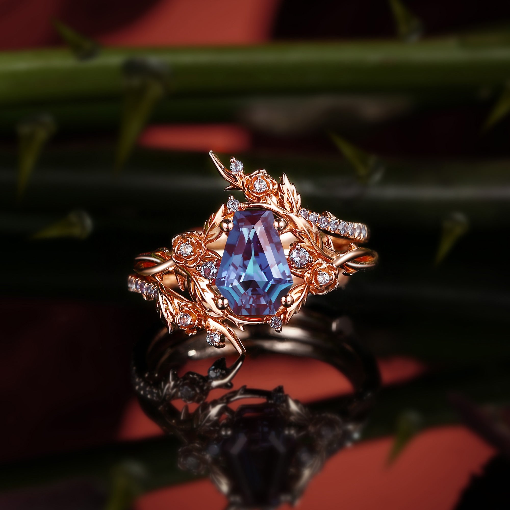 Nature Inspired Twist Coffin Cut Lab Alexandrite Engagement Ring Set 2pcs
