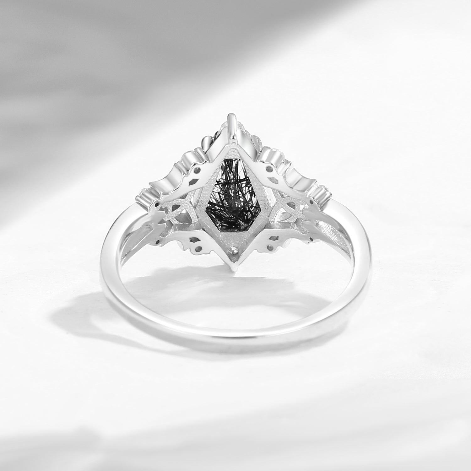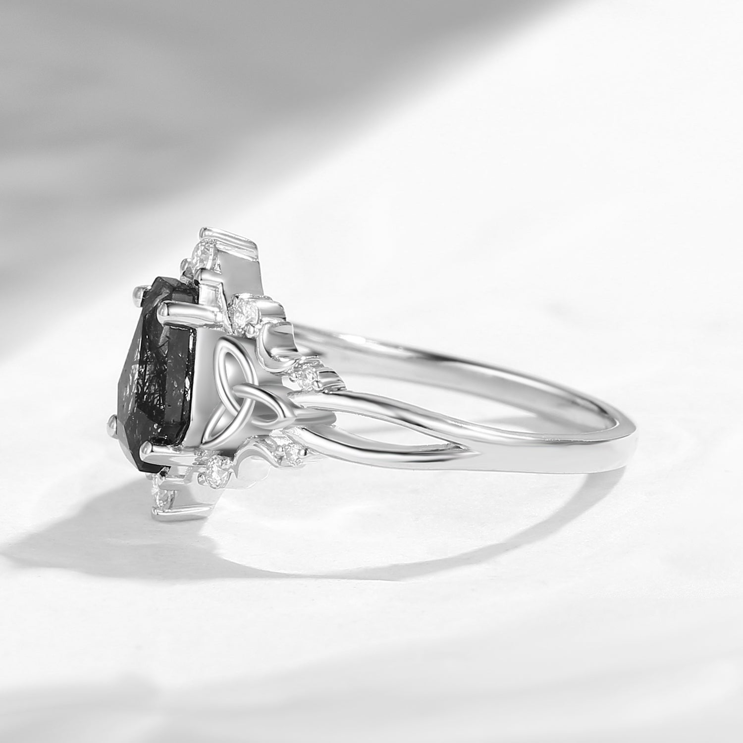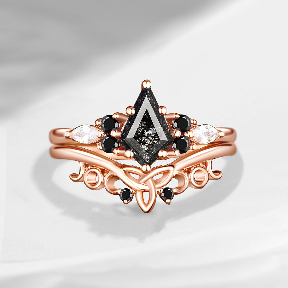 Kite Cut Black Rutilated Quartz Celtic Engagement Ring Set 2pcs