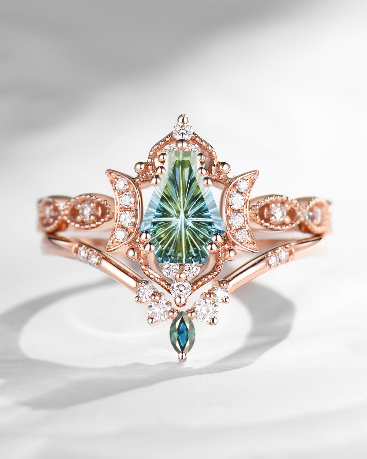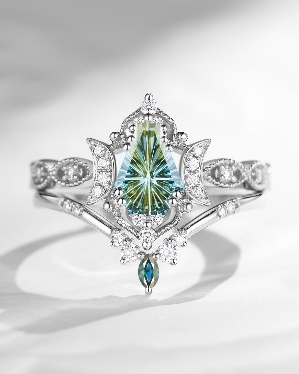 Crescent Moon | Kite Cut Unique Moss Agate Engagement Ring Set 2pcs - Luna