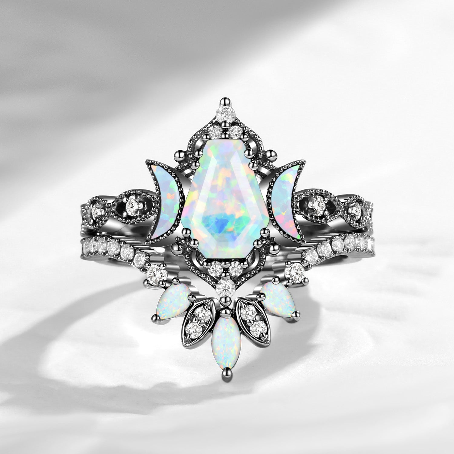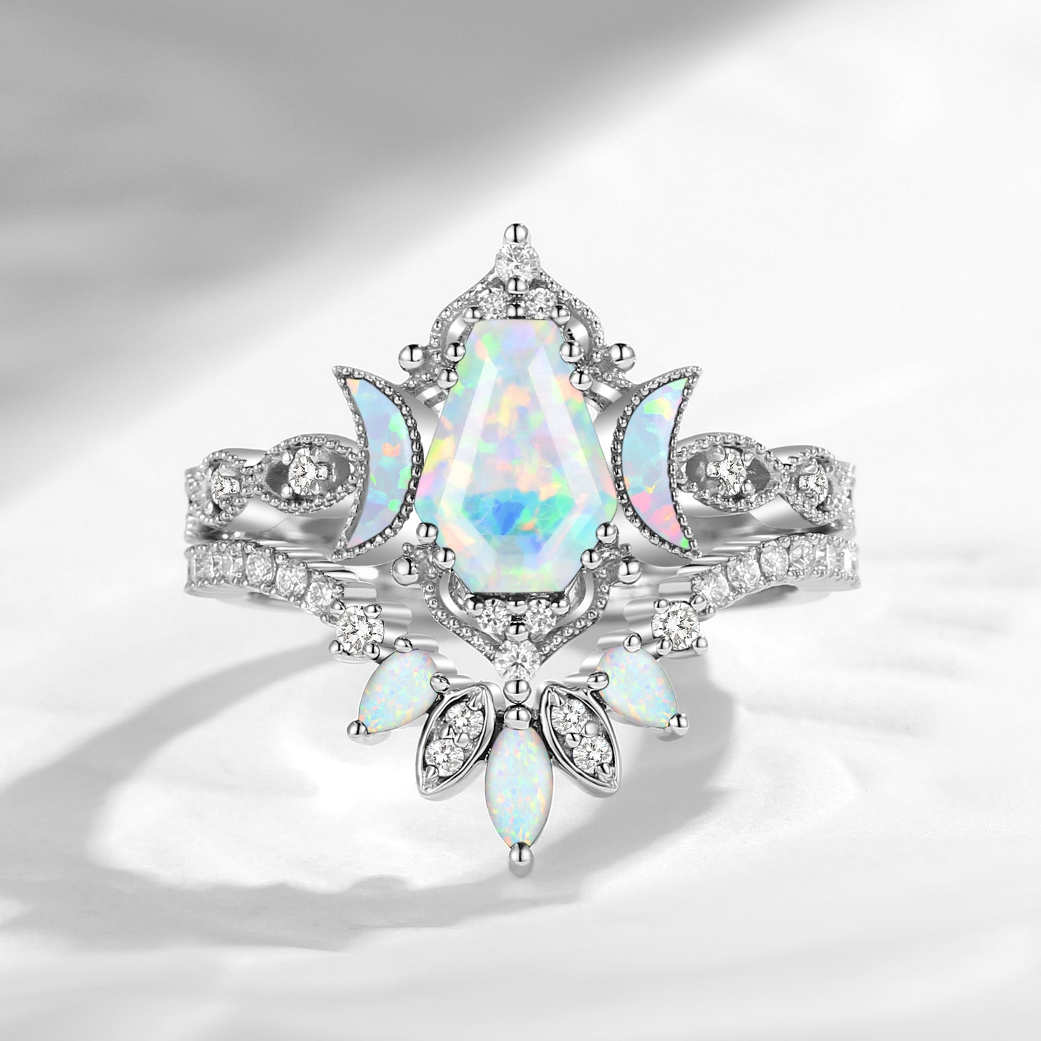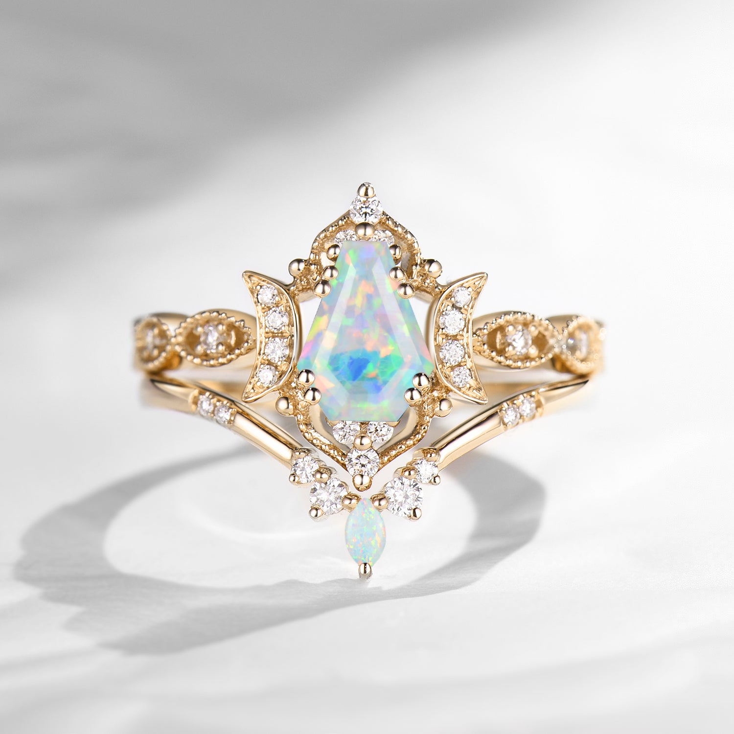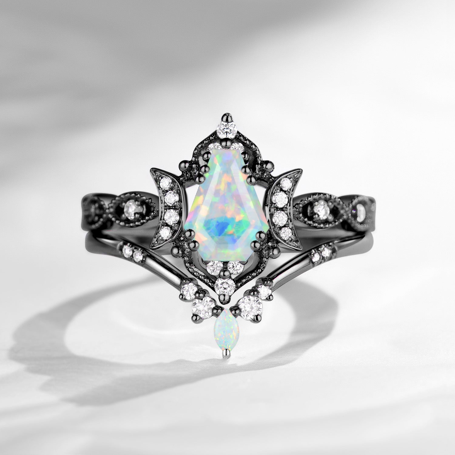 Crescent Moon | Unique Coffin Cut Lab Opal Engagement Ring Set 2pcs - Luna