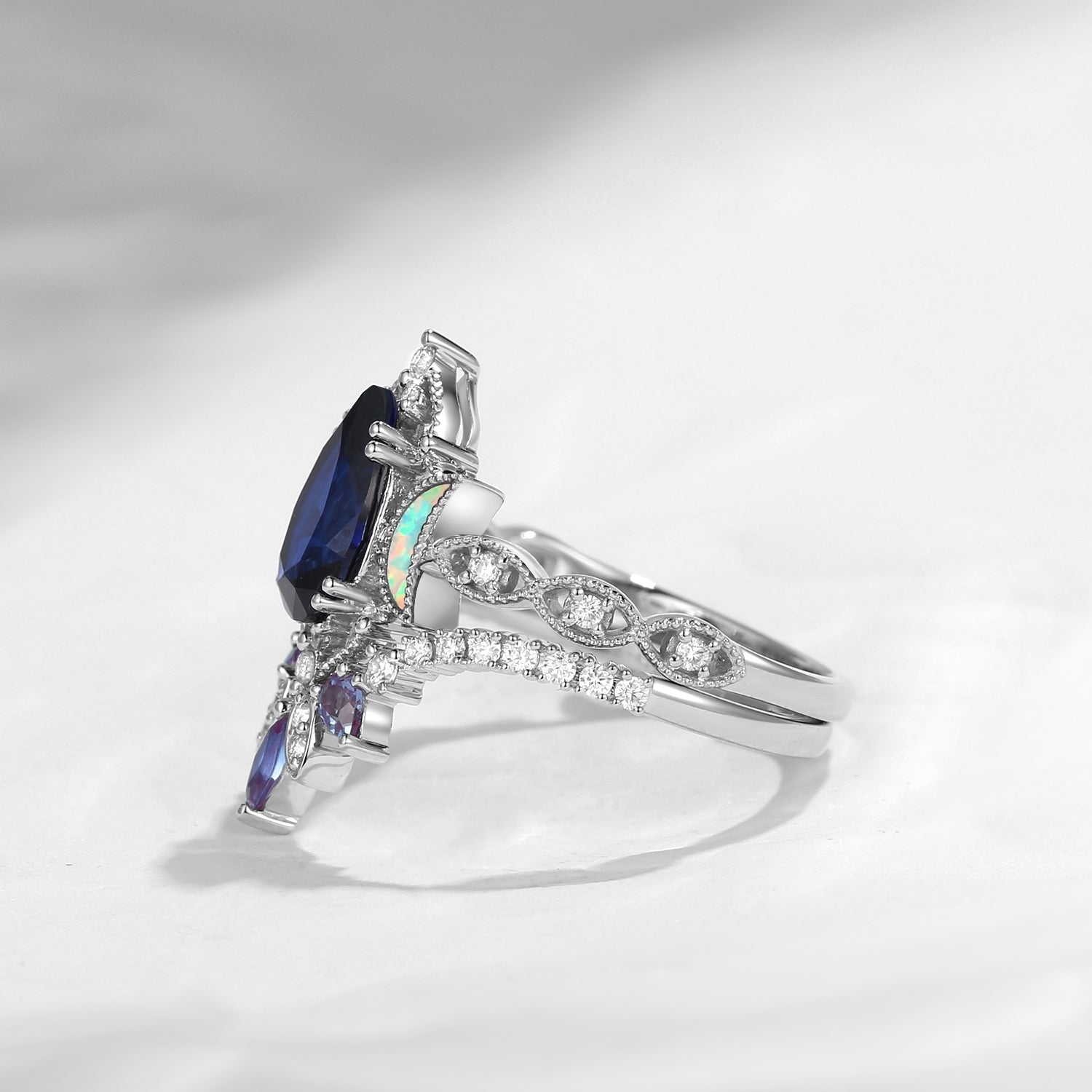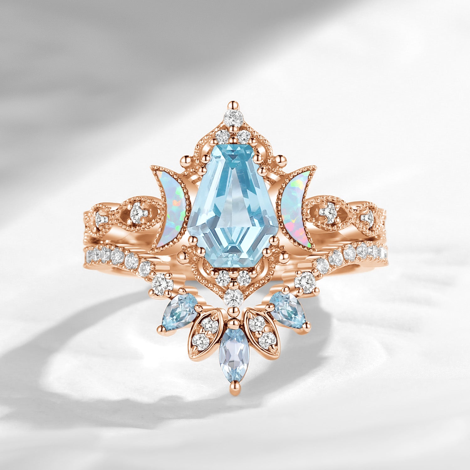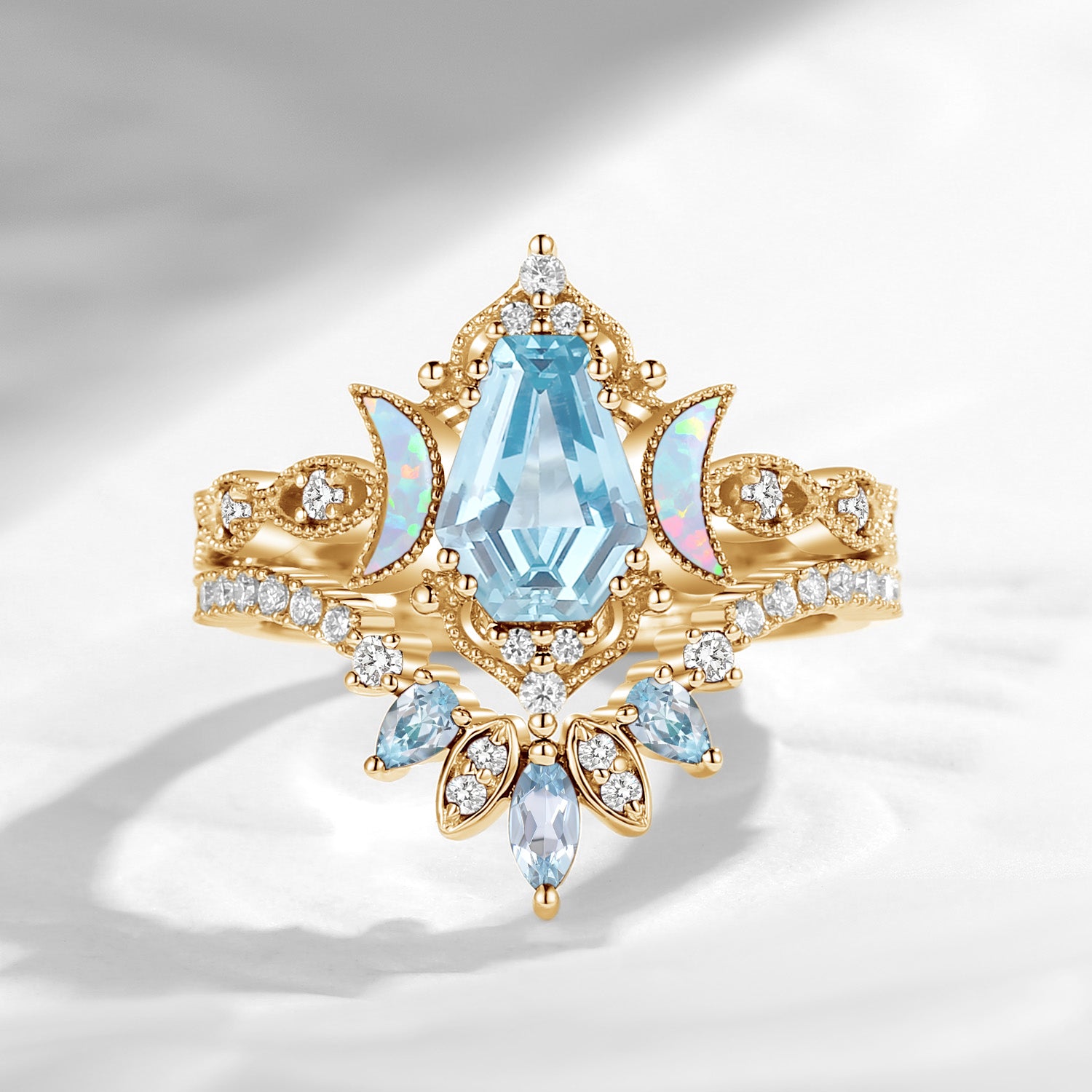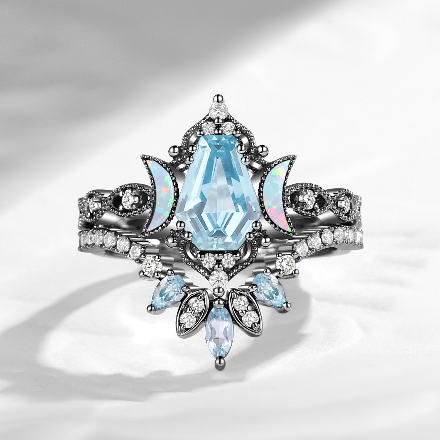 Crescent Moon | Unique Coffin Cut Lab Opal Engagement Ring Set 2pcs - Luna