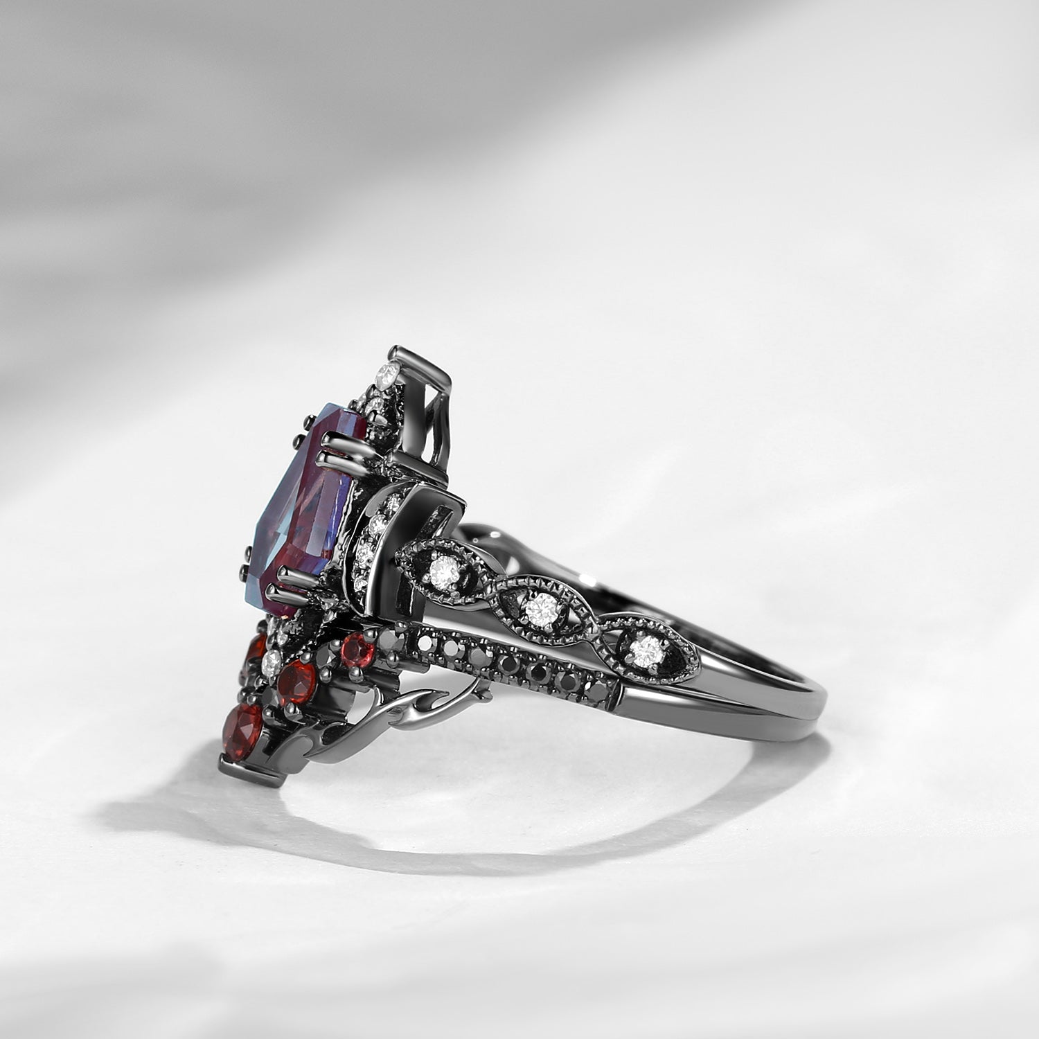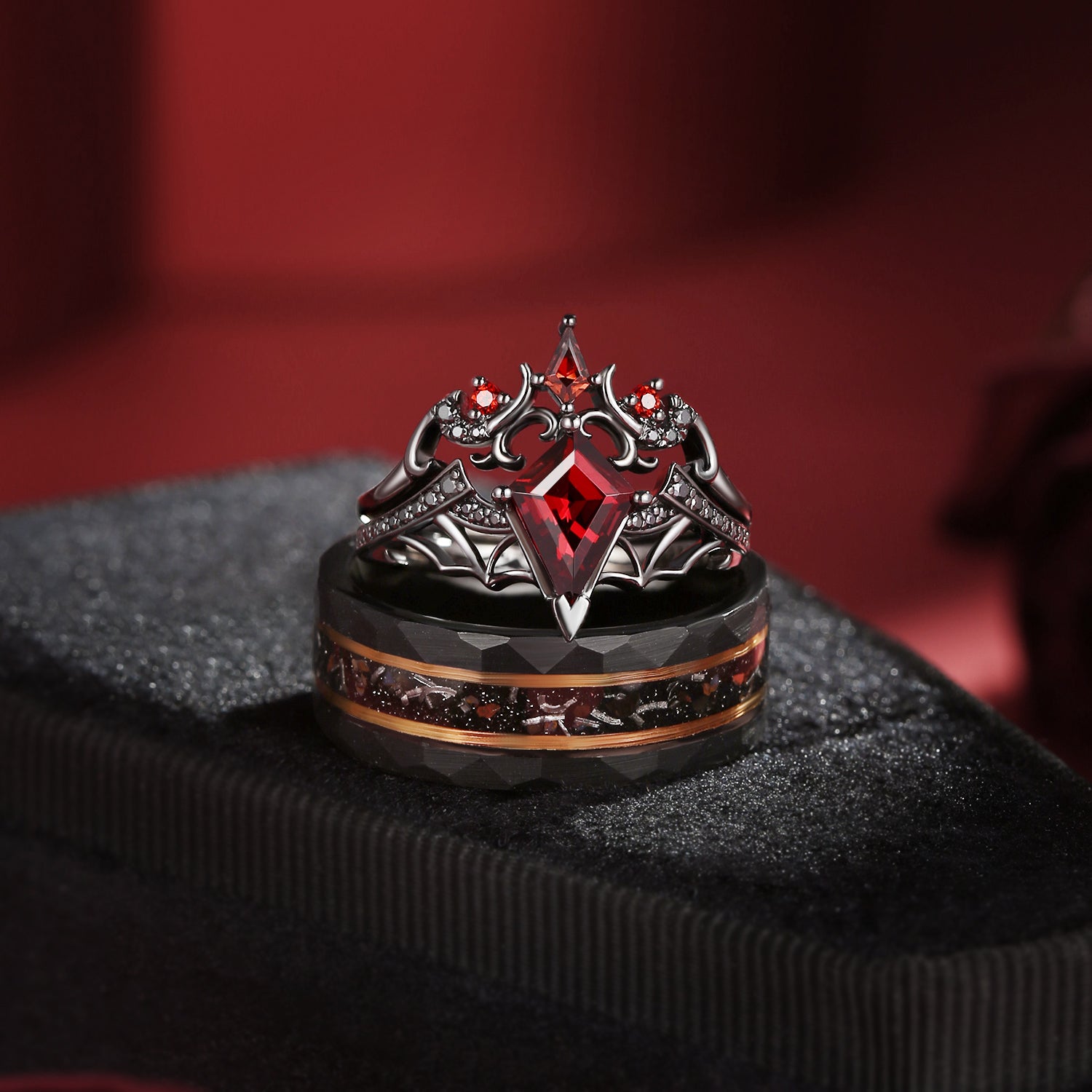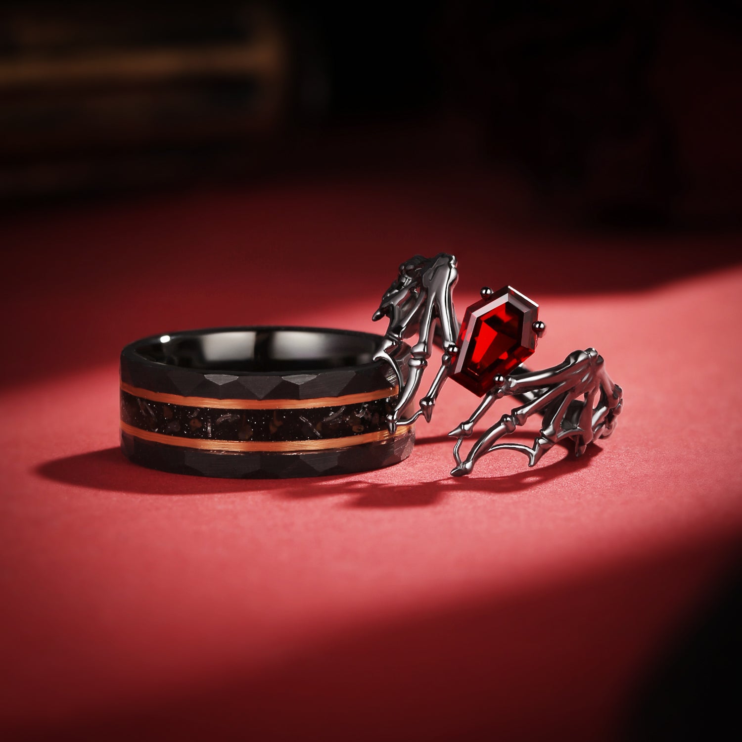 Non-Traditional Coffin Garnet Black Gold Vampire Ring Set 2pcs - Bat Ring