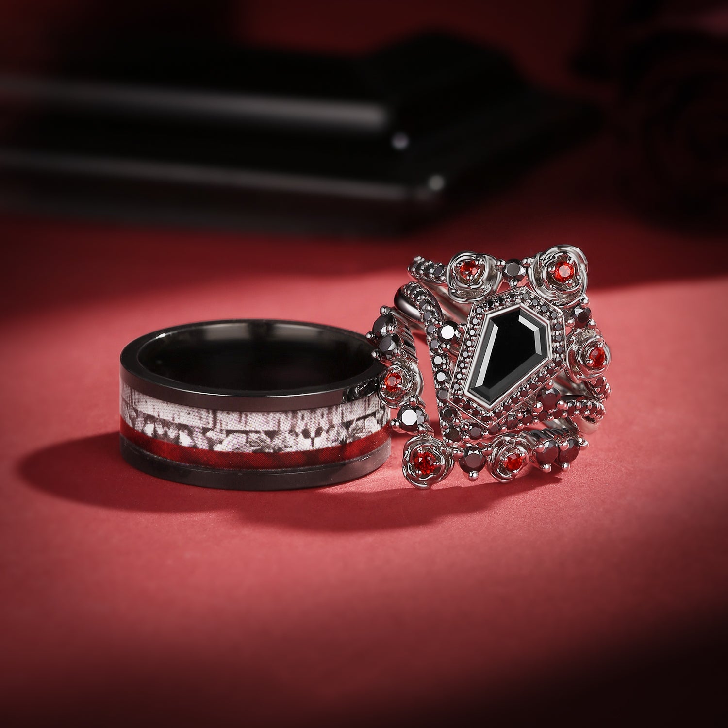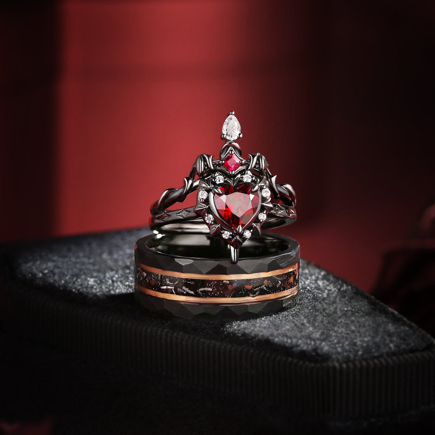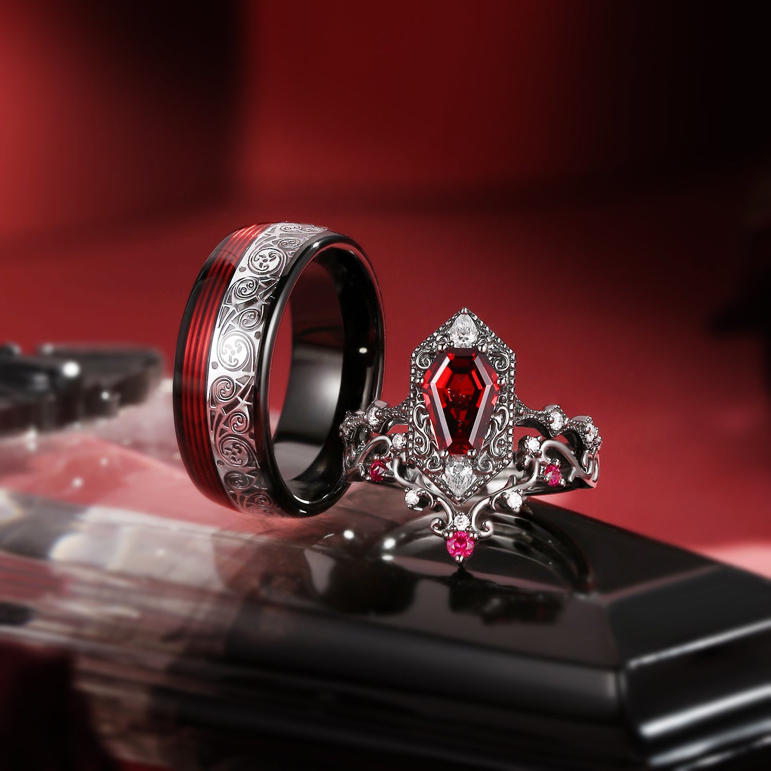 Coffin Garnet 'Fallen Aegis' Ring & Celtic Filigree Couple Bridal Ring Set