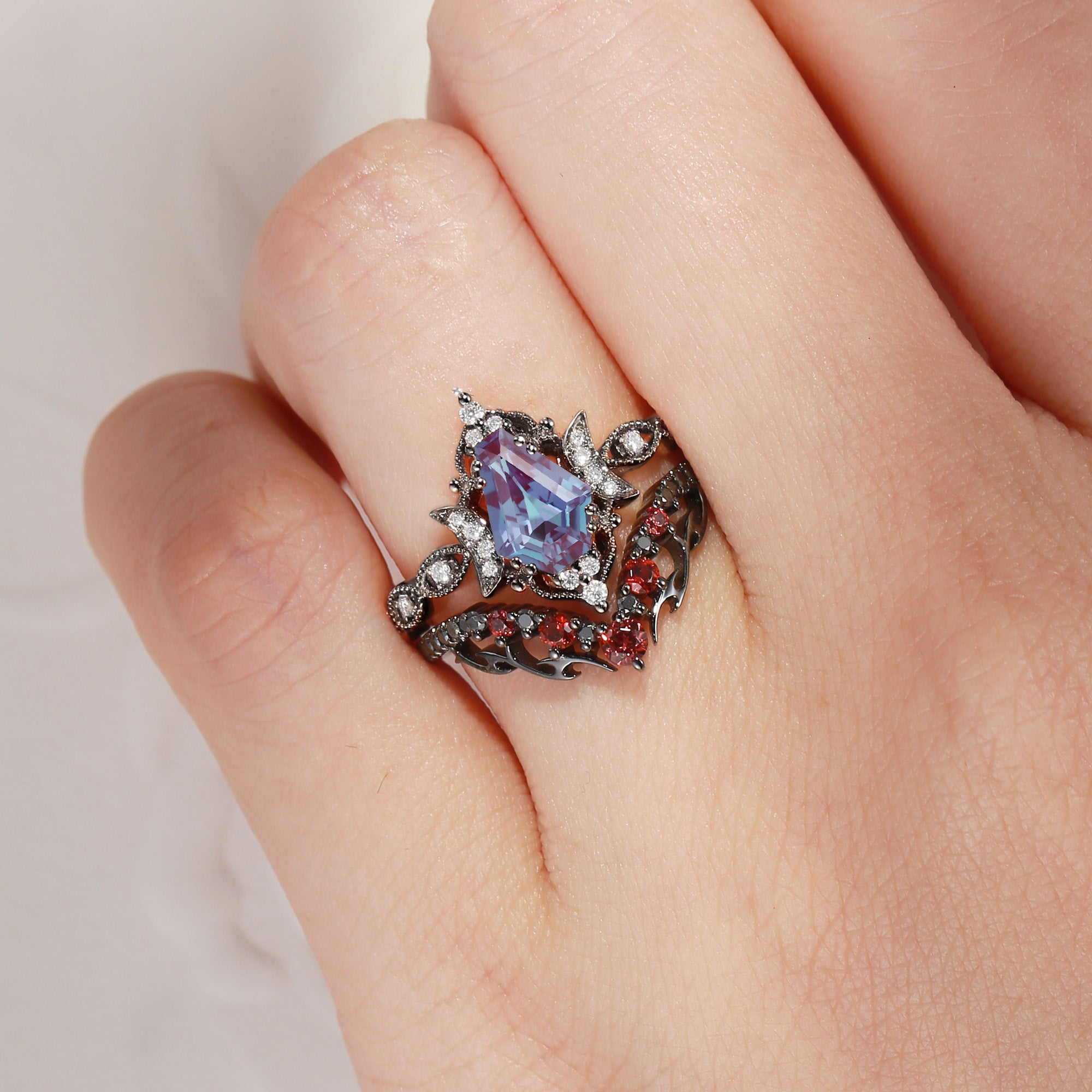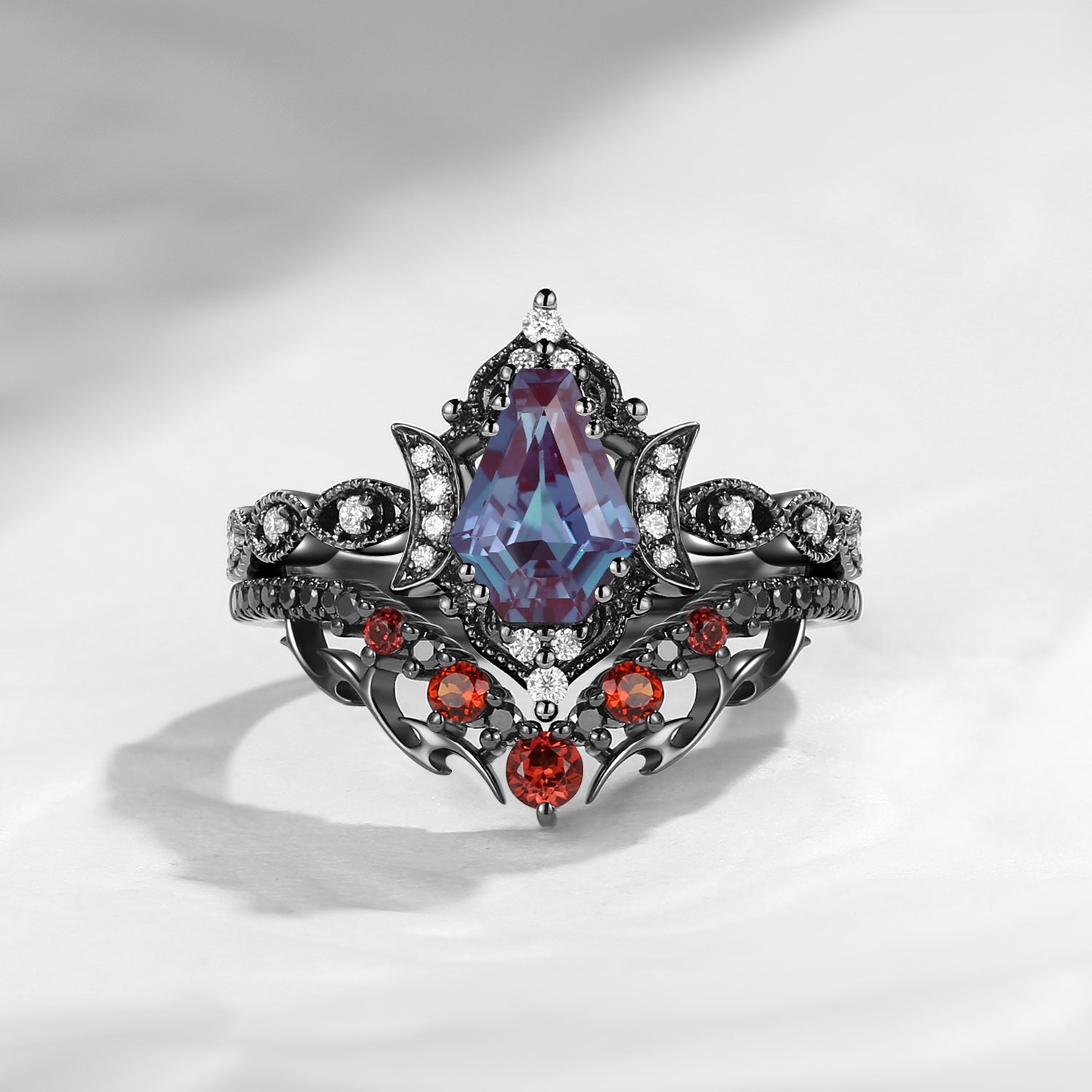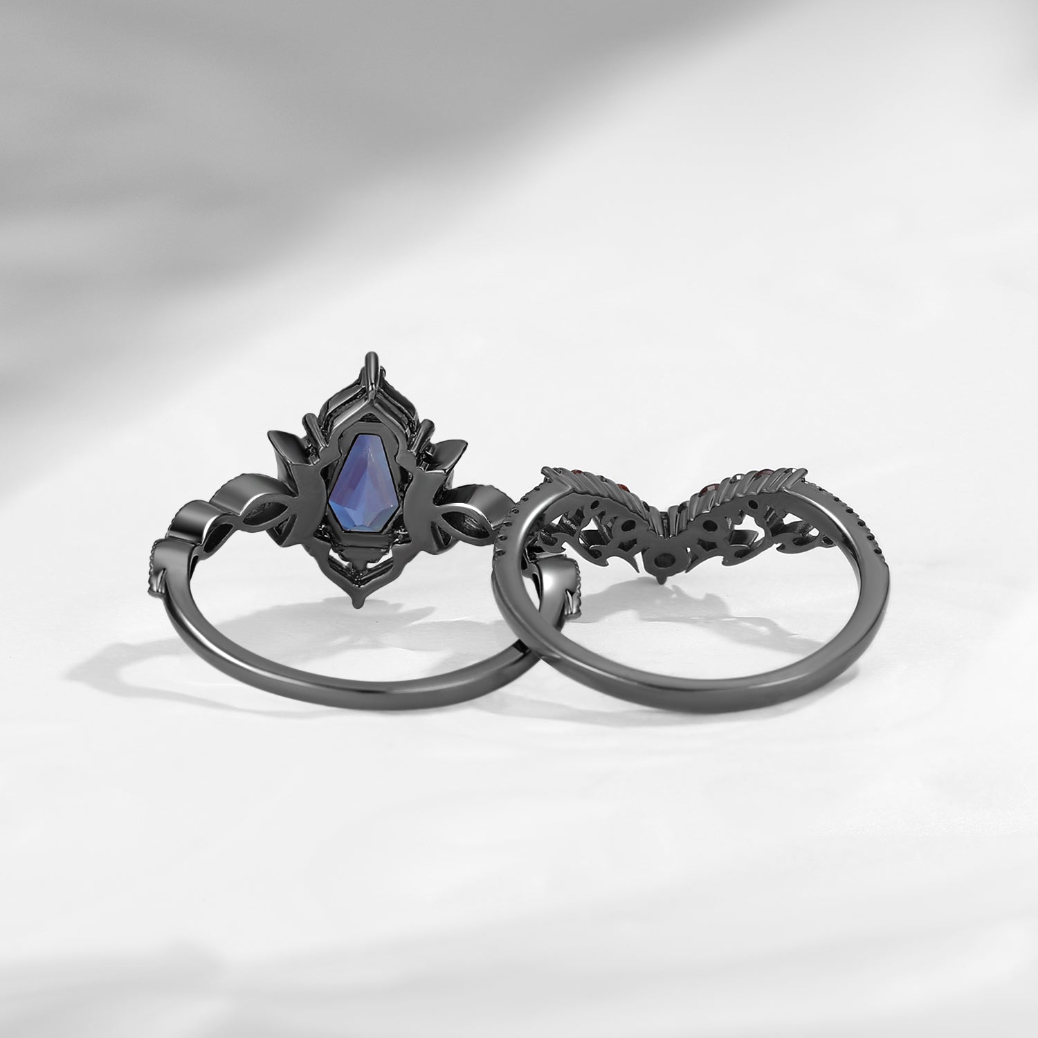 Coffin Garnet 'Fallen Aegis' Ring & Celtic Filigree Couple Bridal Ring Set