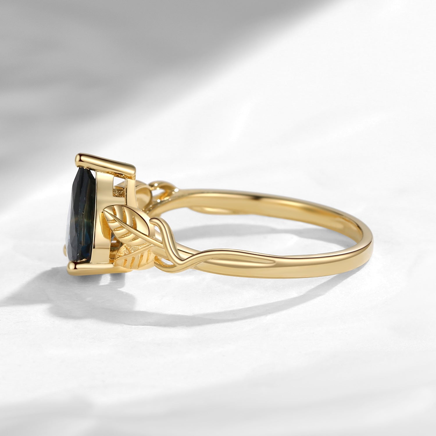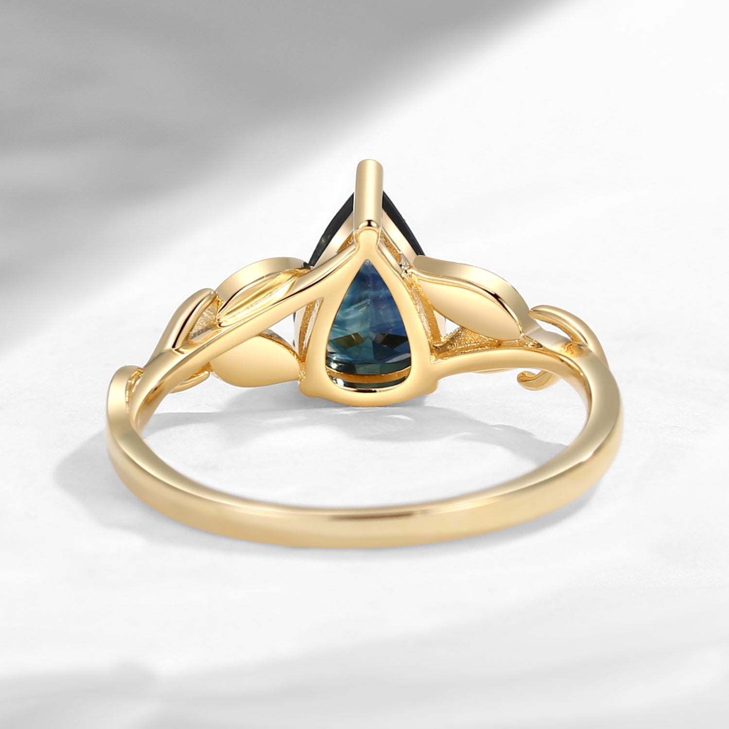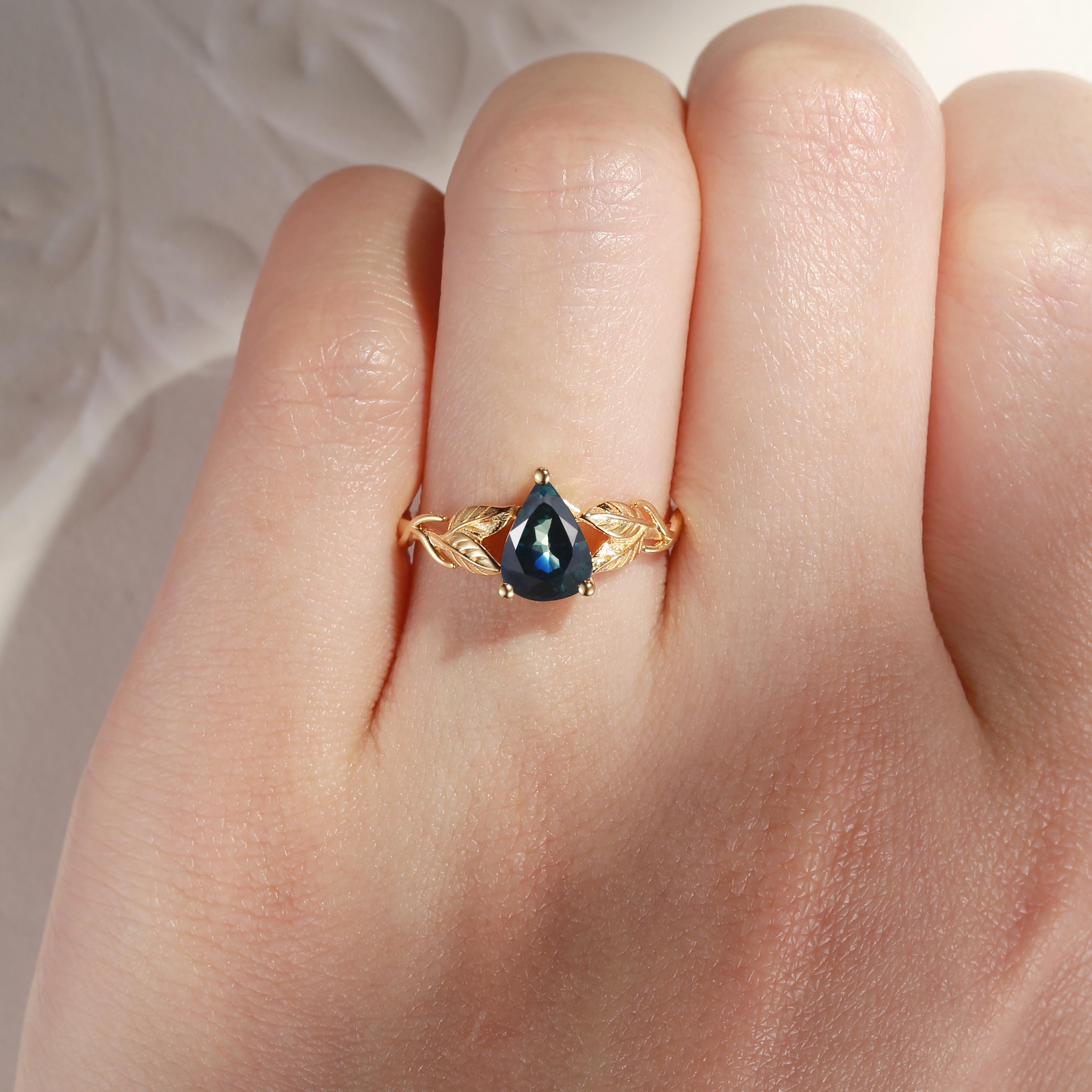 Nature Inspired Pear Shaped Natural Teal Sapphire Halo Leaf Engagement Ring