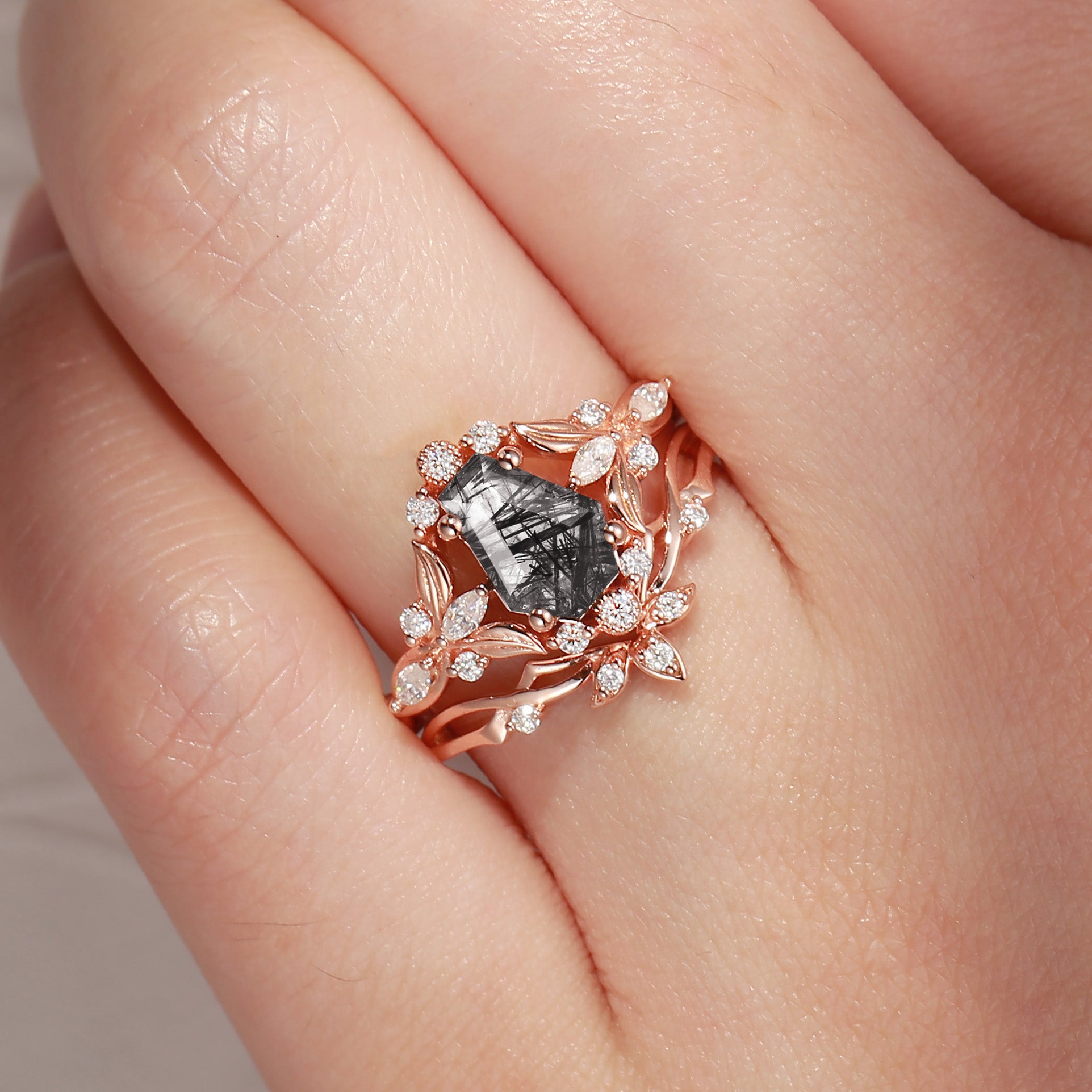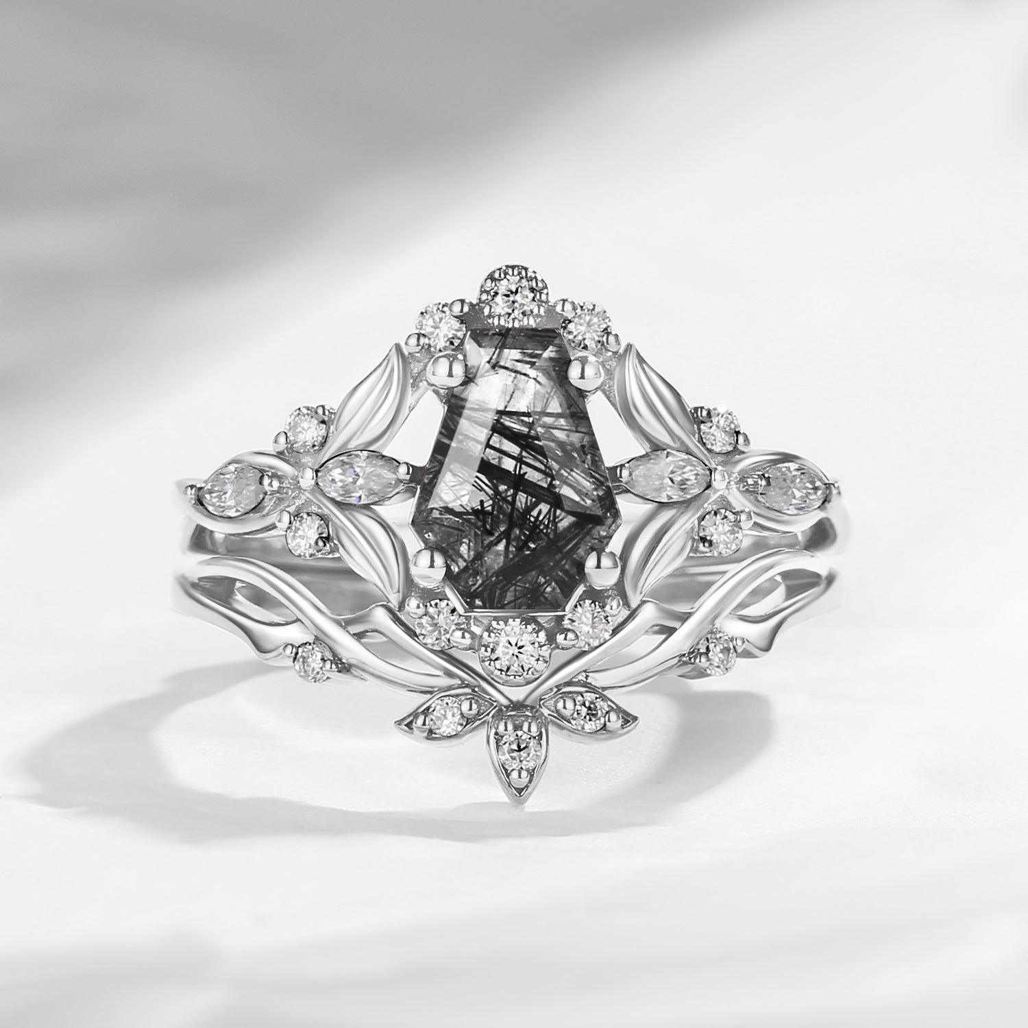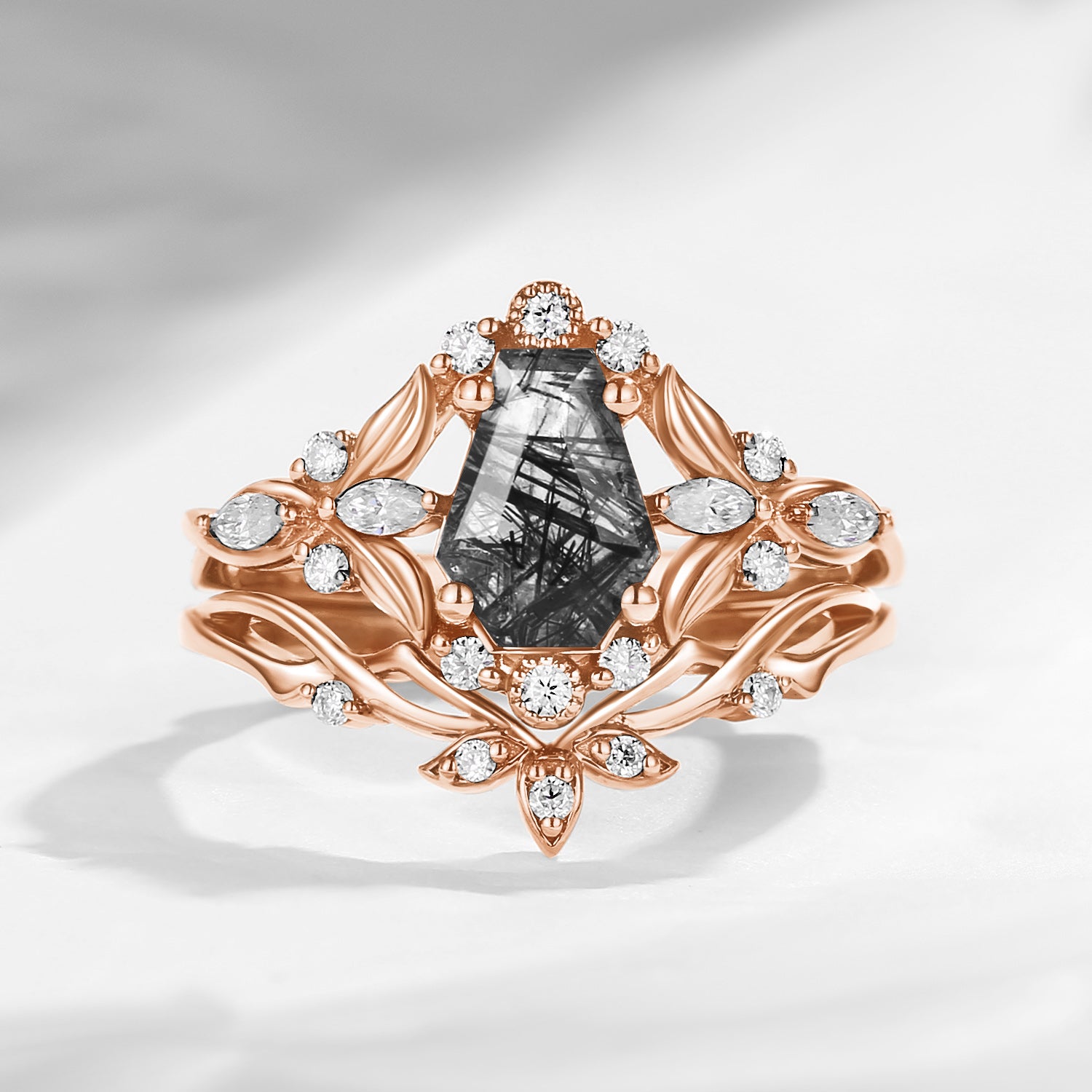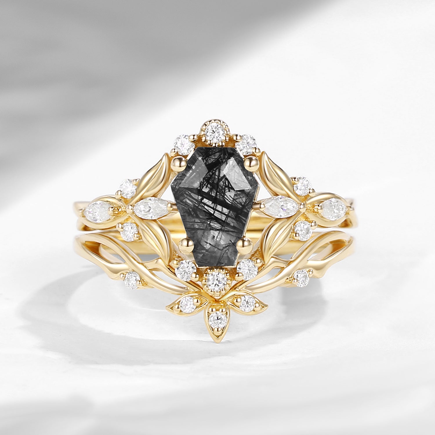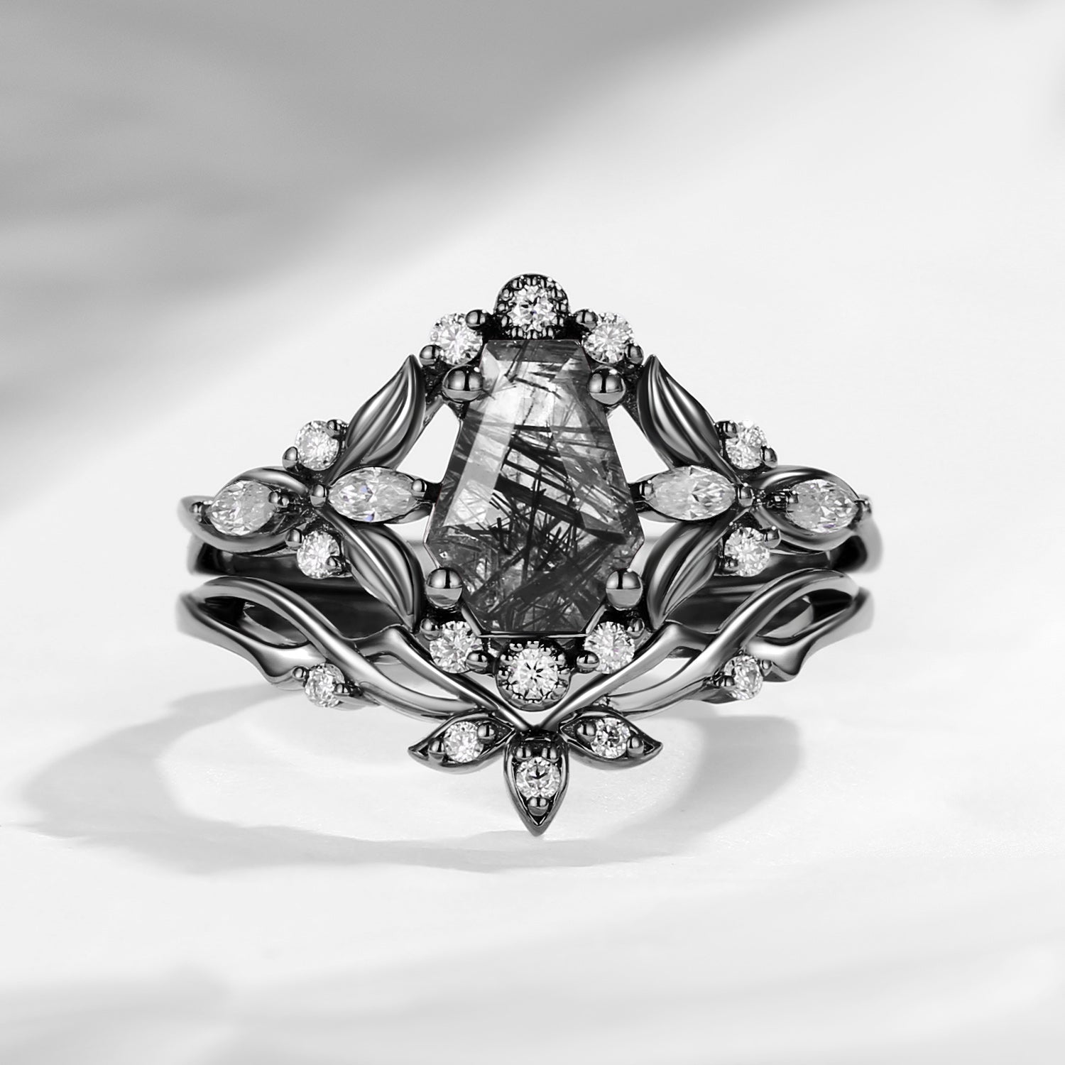 Gothic Coffin Cut Black Rutilated Quartz Engagement Ring - 'Serpent's Embrace'