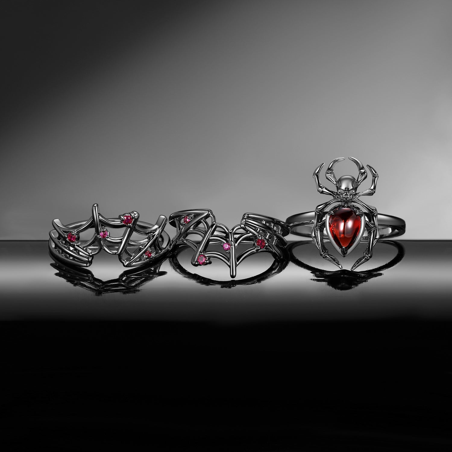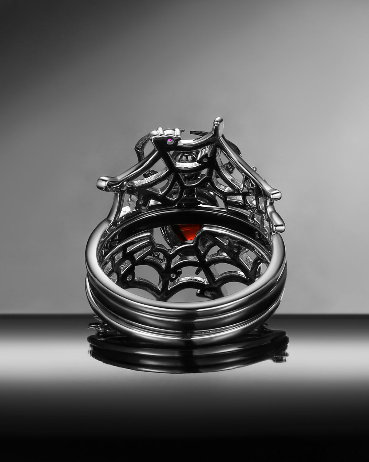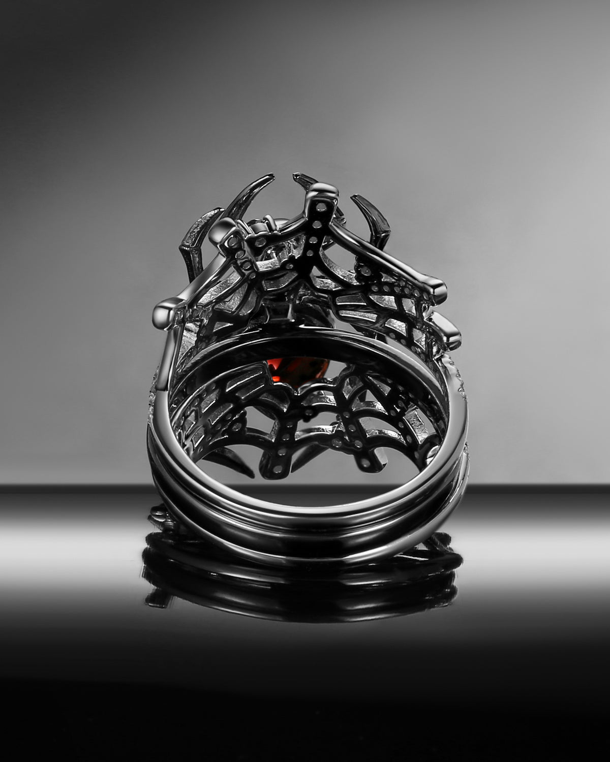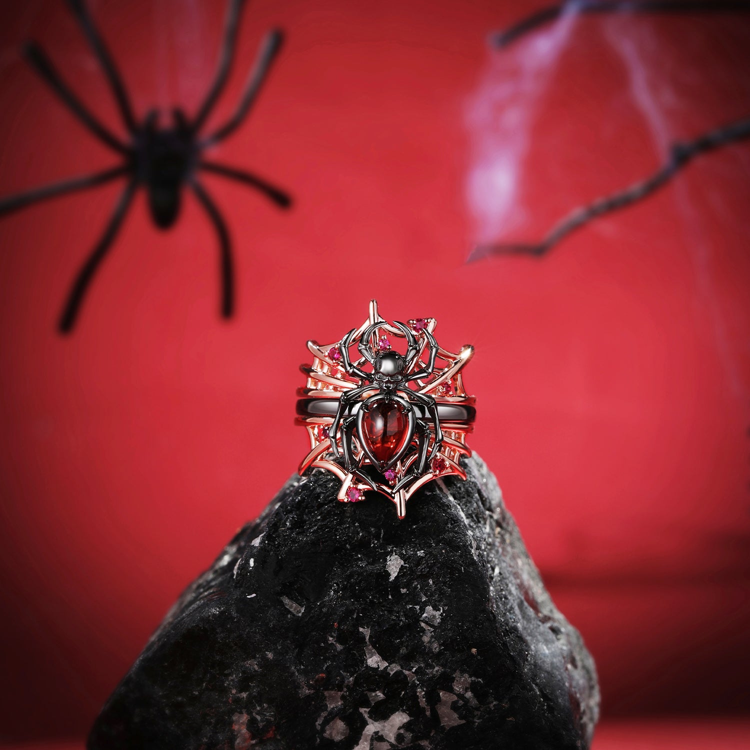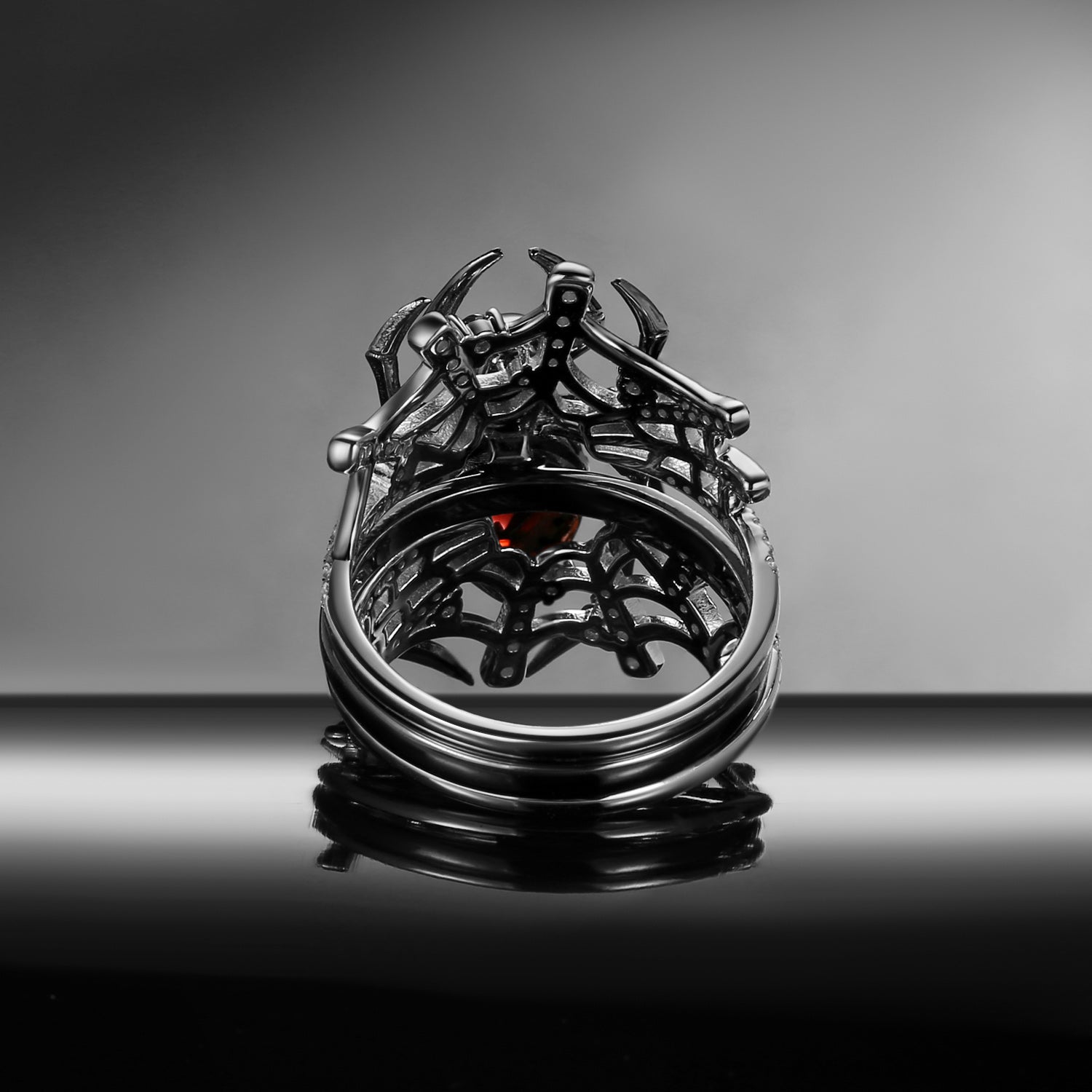 Gothic Pear Shaped Garnet Spider Inspired 'Disturbia' Engagement Ring Set 3pcs
