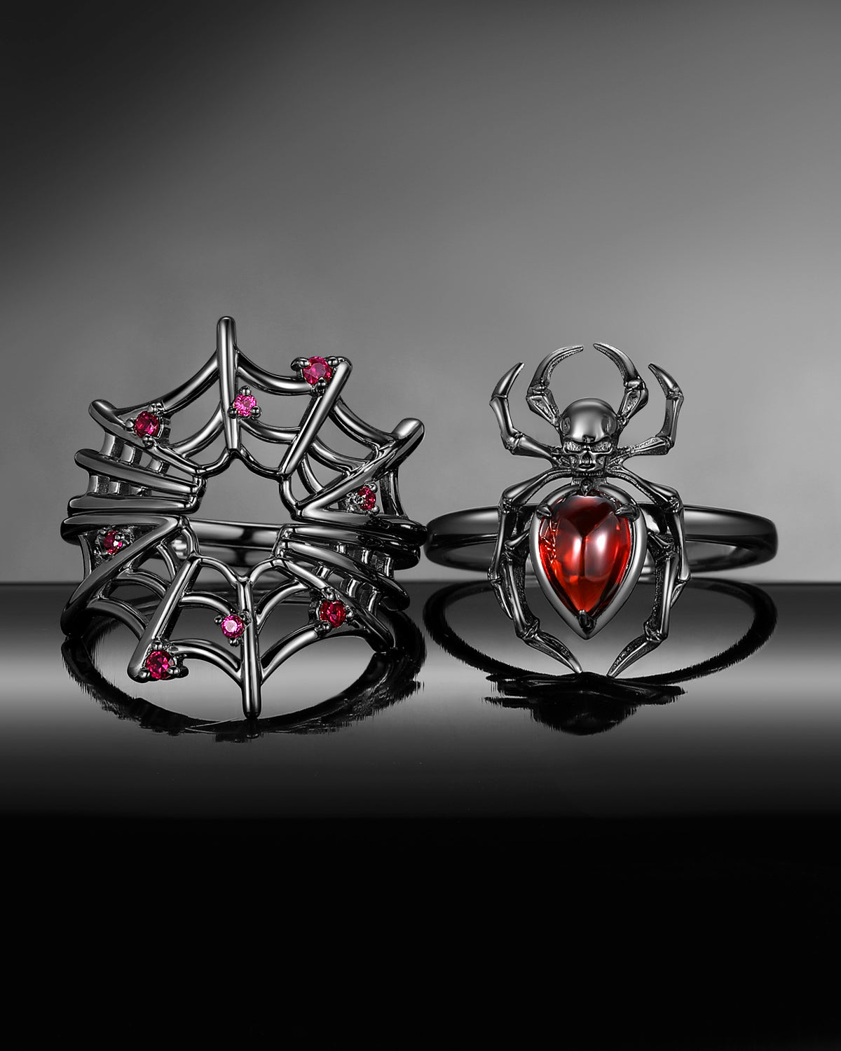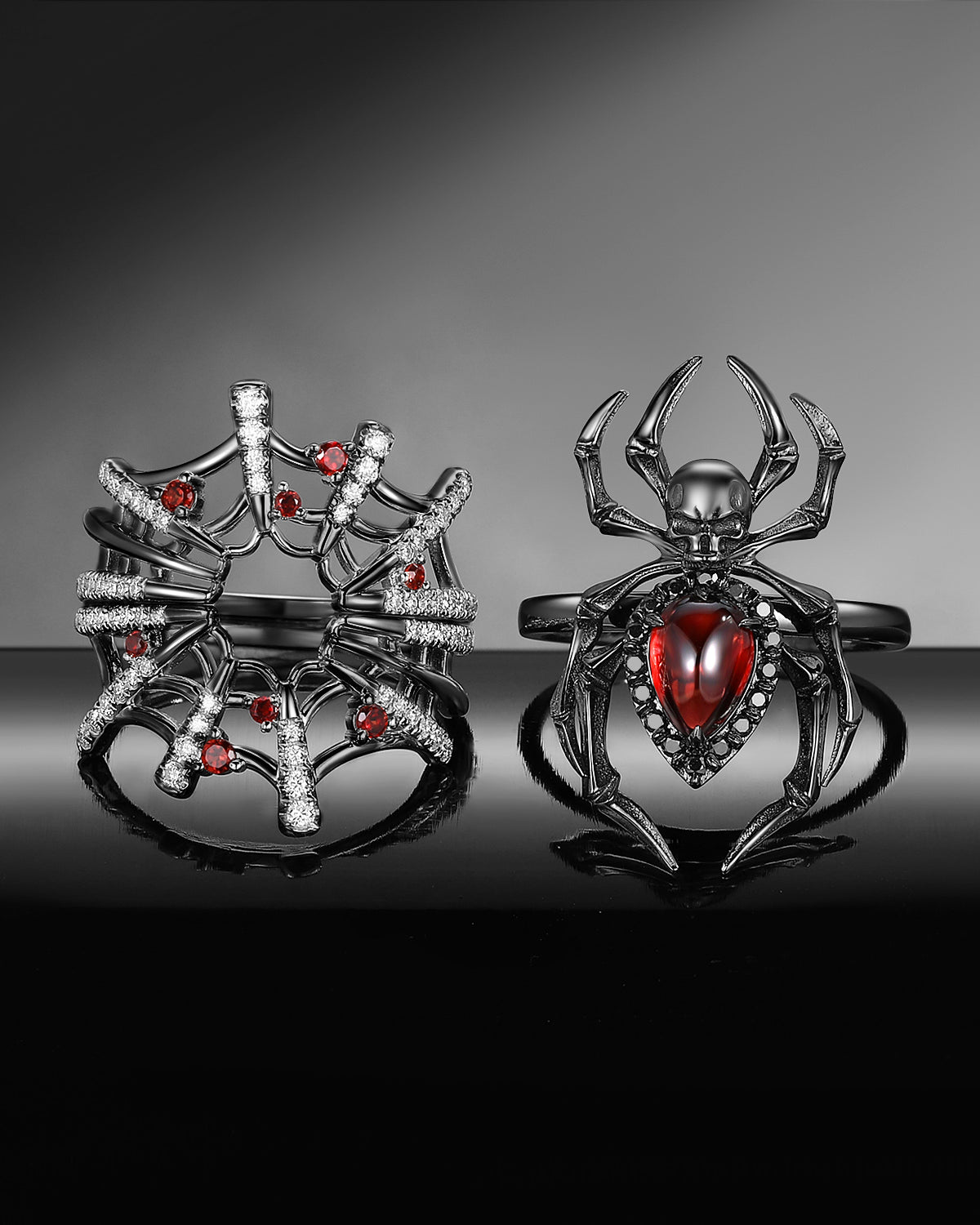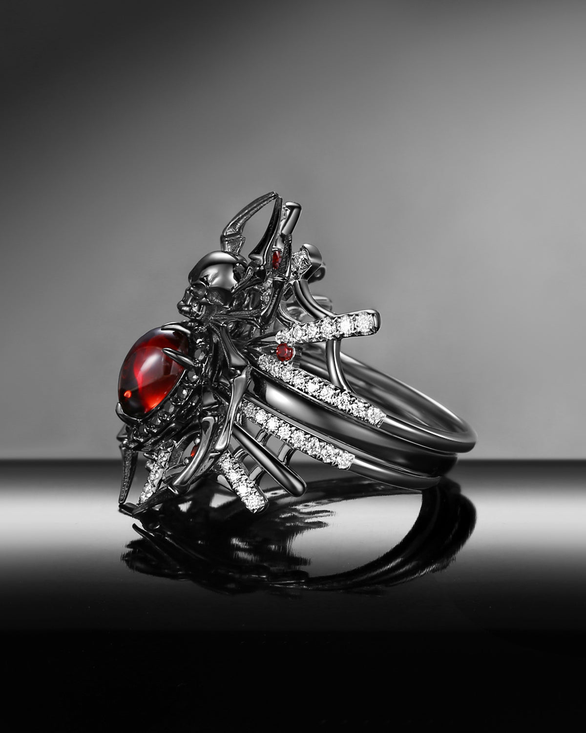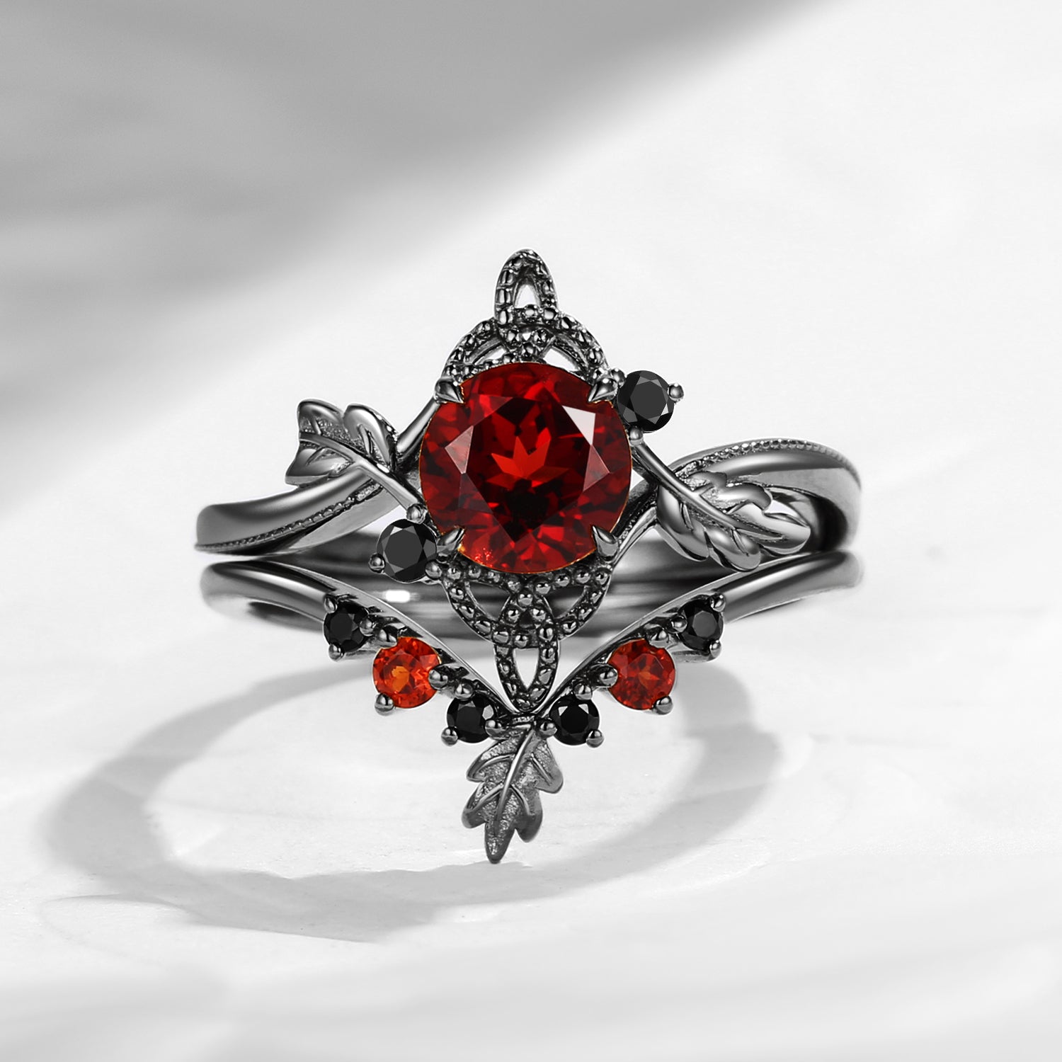 Gothic Pear Shaped Garnet Spider Inspired 'Disturbia' Engagement Ring Set 3pcs
