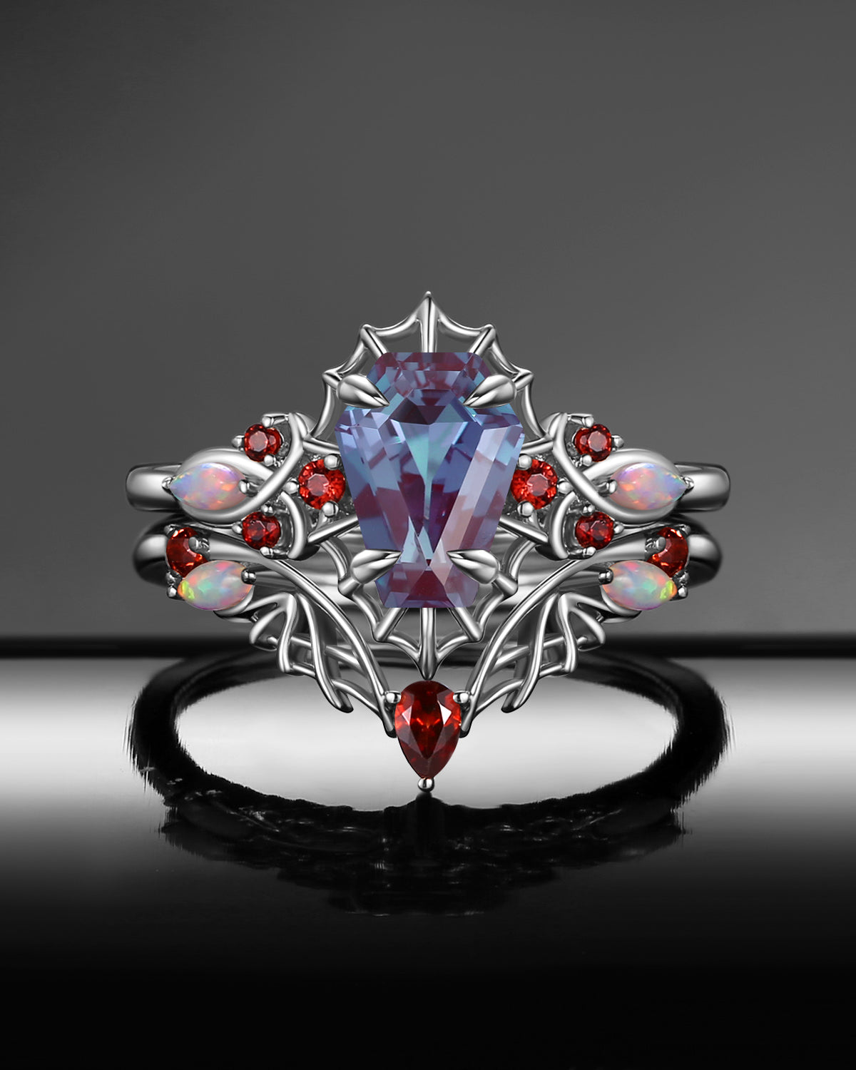 Gothic Coffin Shaped Lab Alexandrite Spider Inspired Engagement Ring Set 2pcs