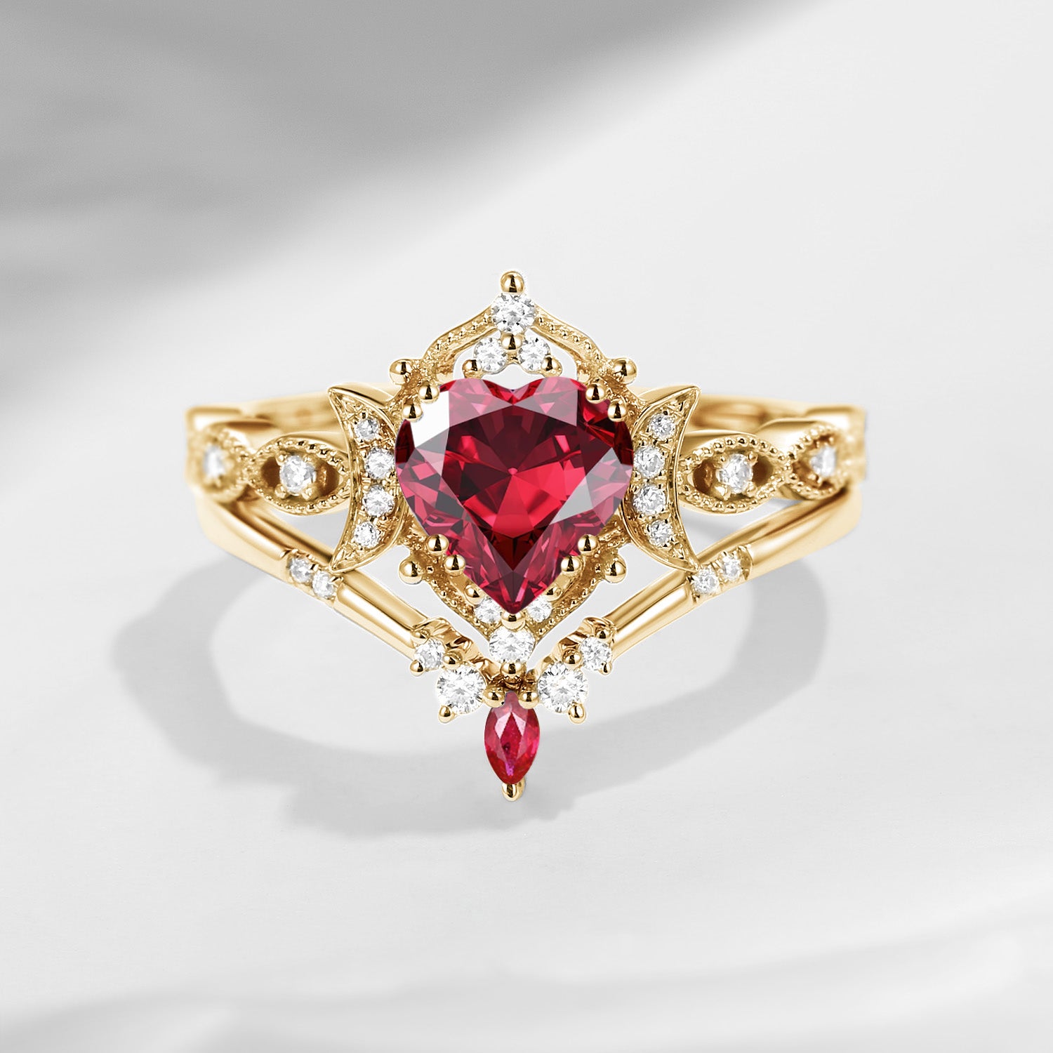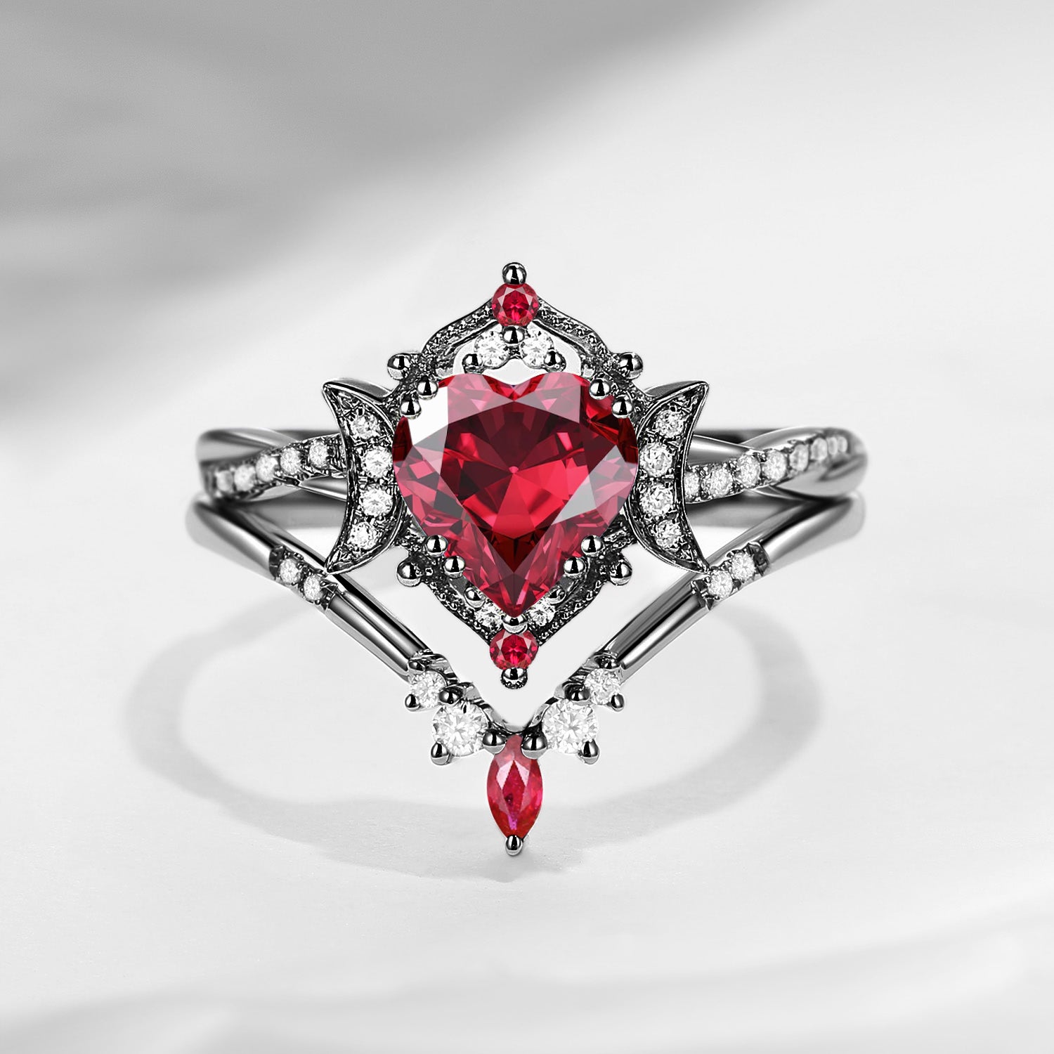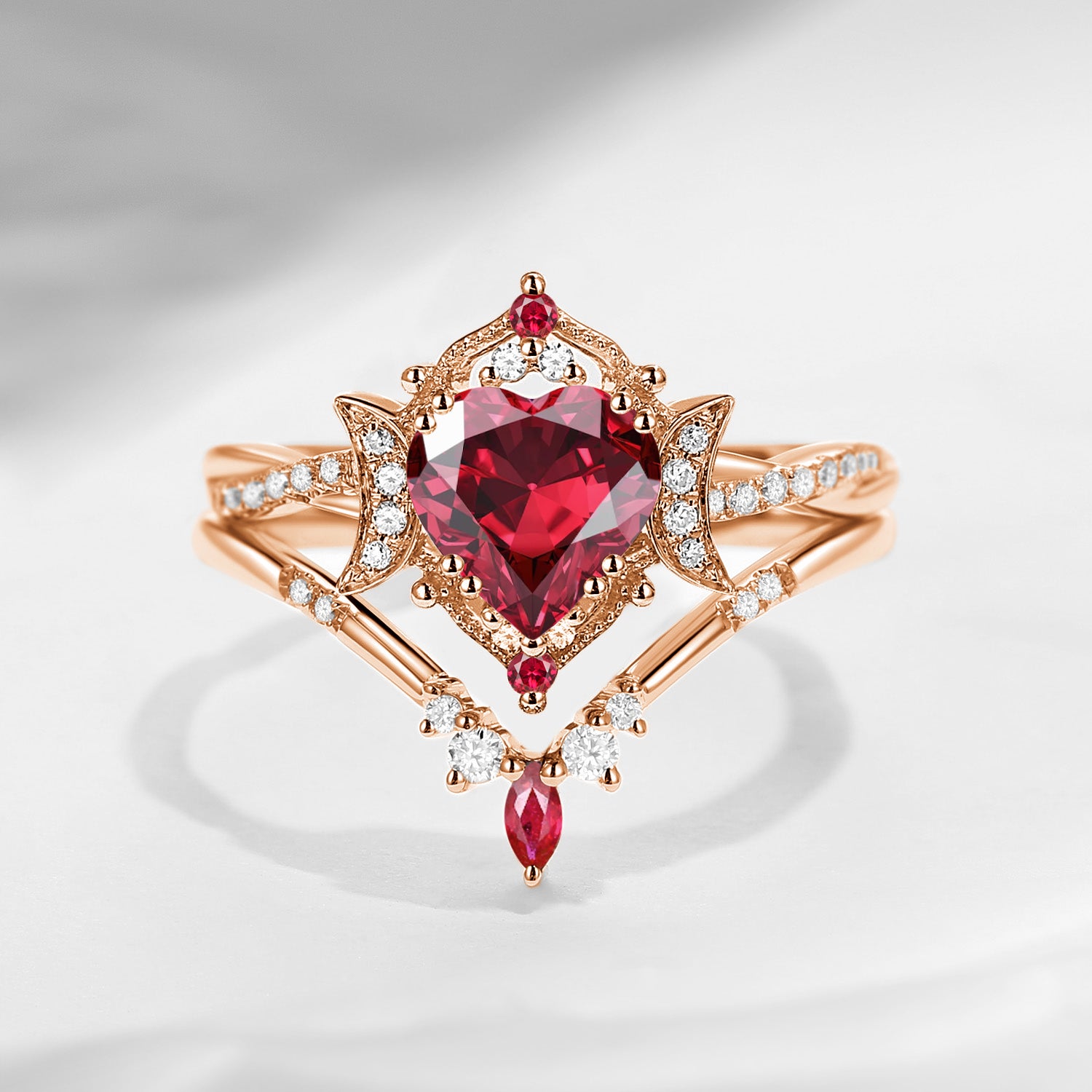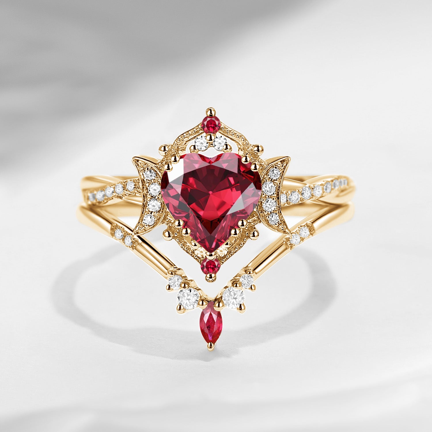 Crescent Moon | Heart Shaped Lab Ruby Engagement Ring Set 2pcs - Alexandria