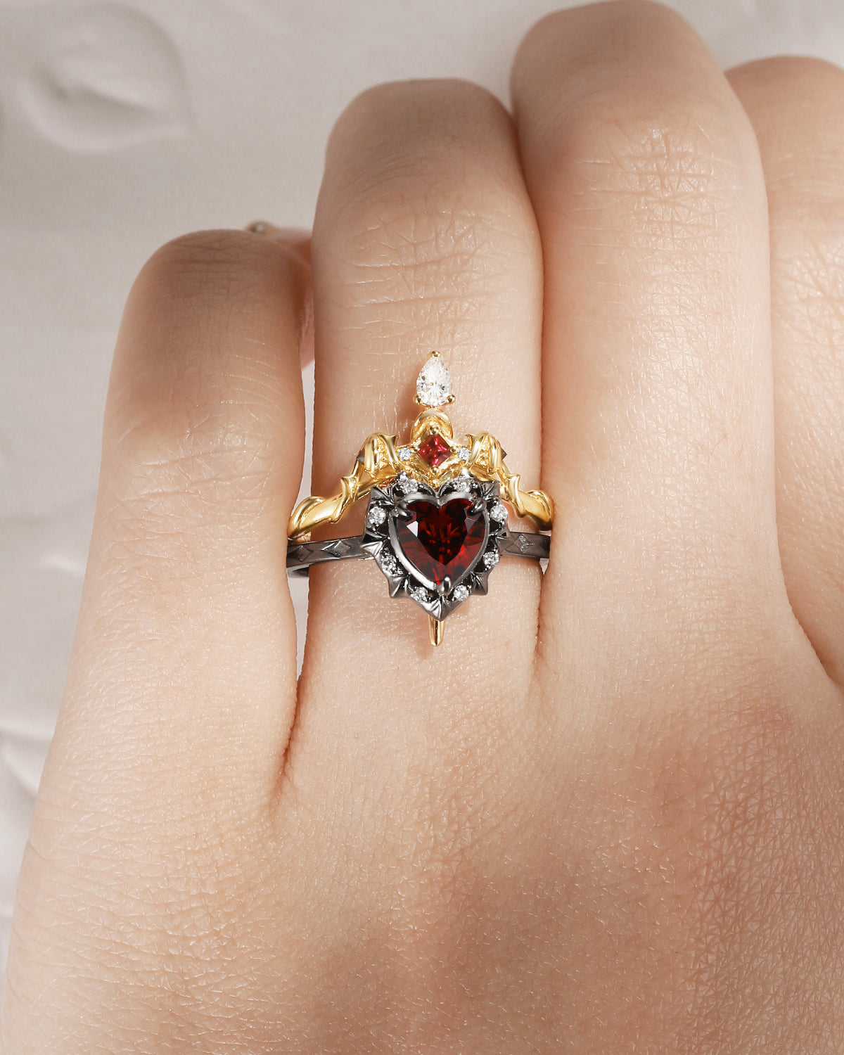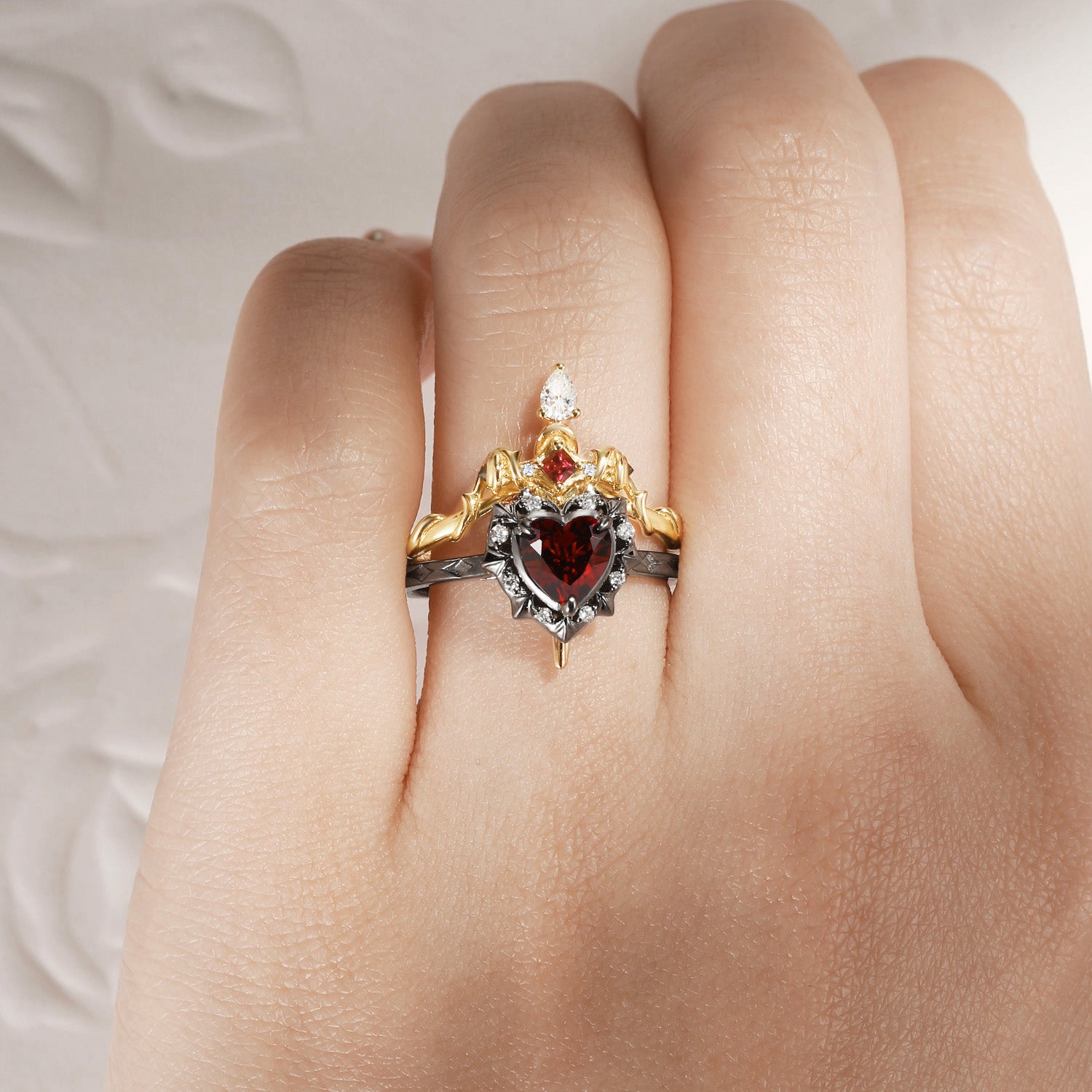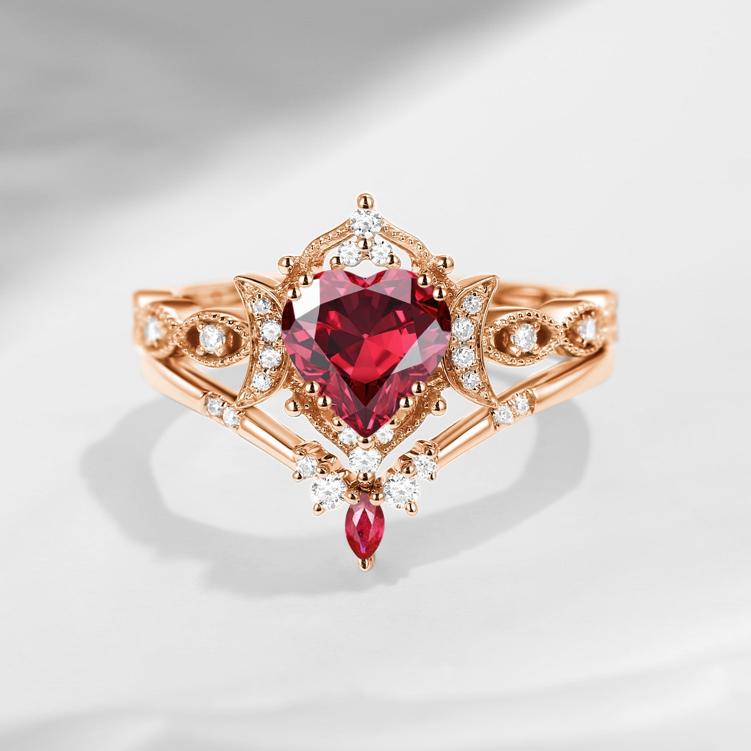 Crescent Moon | Heart Shaped Lab Ruby Engagement Ring Set 2pcs - Alexandria