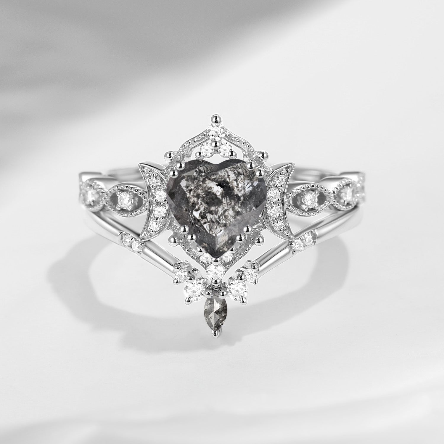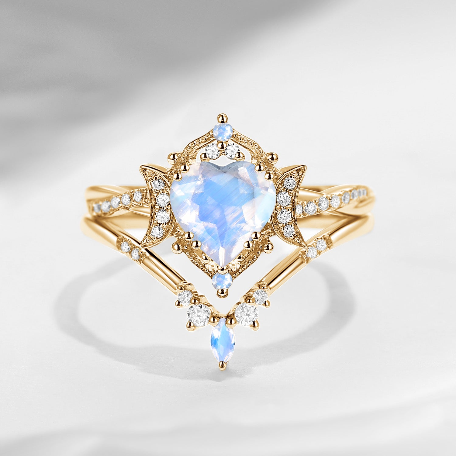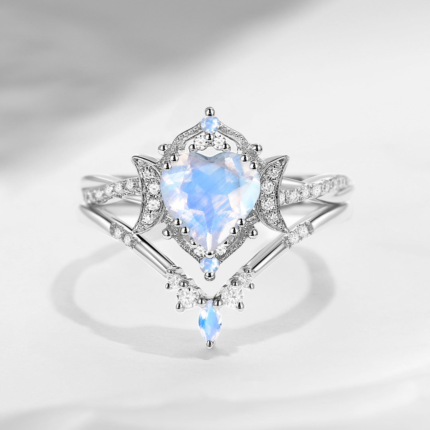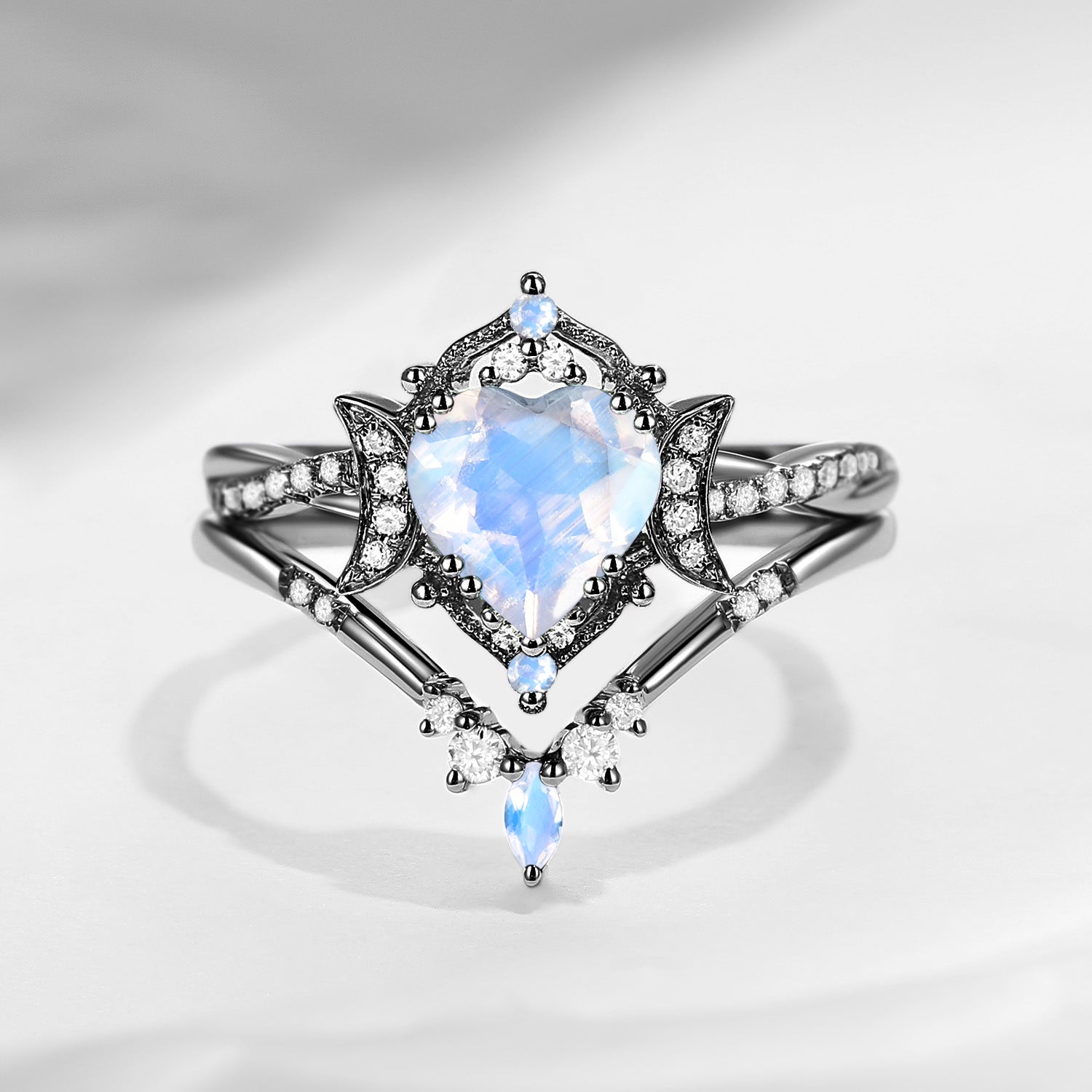 Crescent Moon | Heart Shaped Moonstone Engagement Ring Set 2pcs - Alexandria