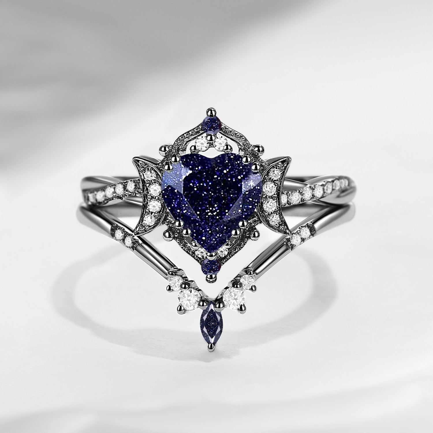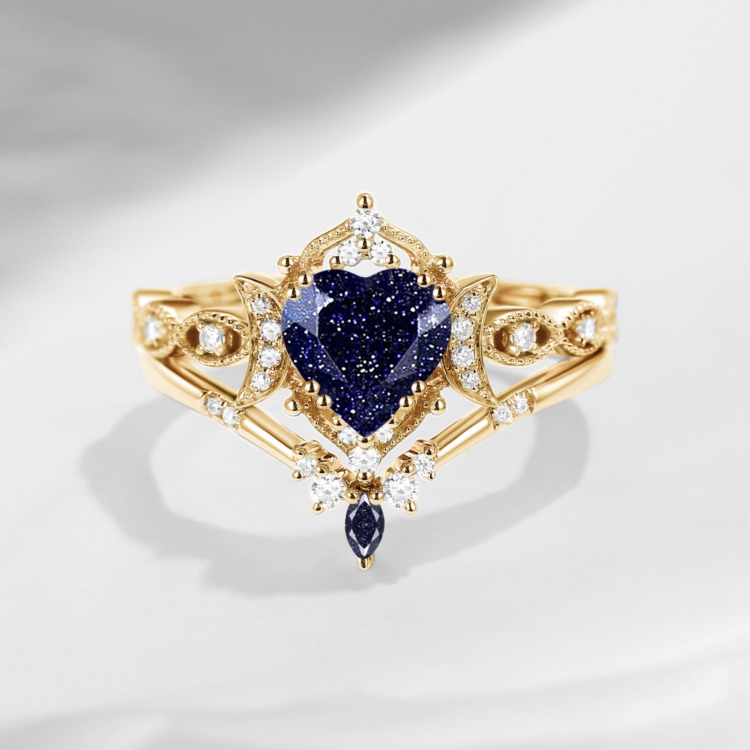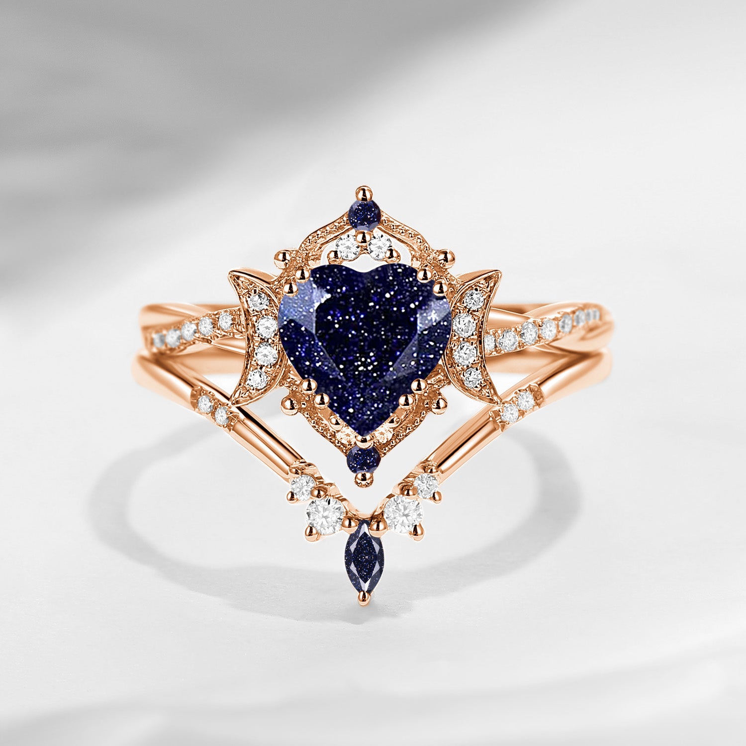 Crescent Moon | Heart Shaped Blue Sandstone Engagement Ring Set 2pcs - Luna