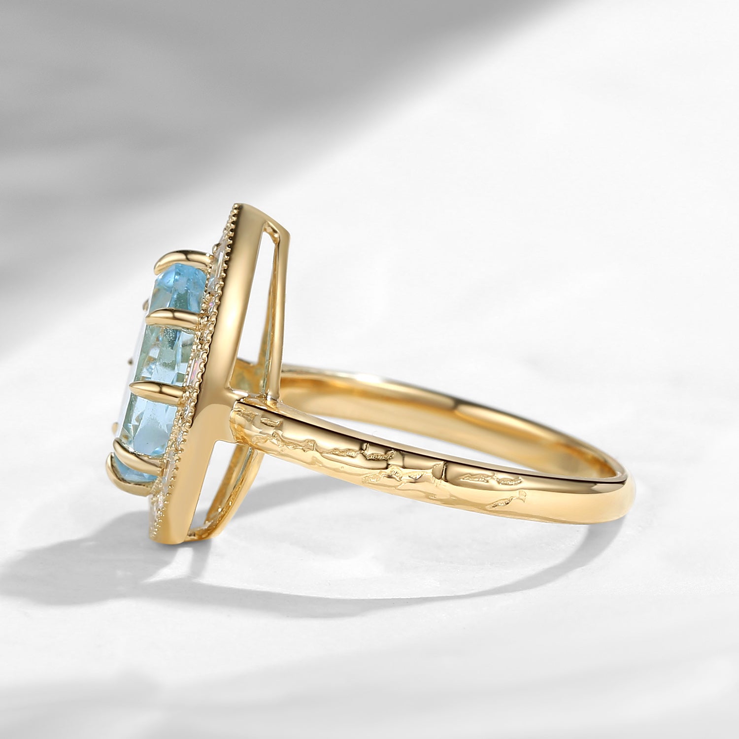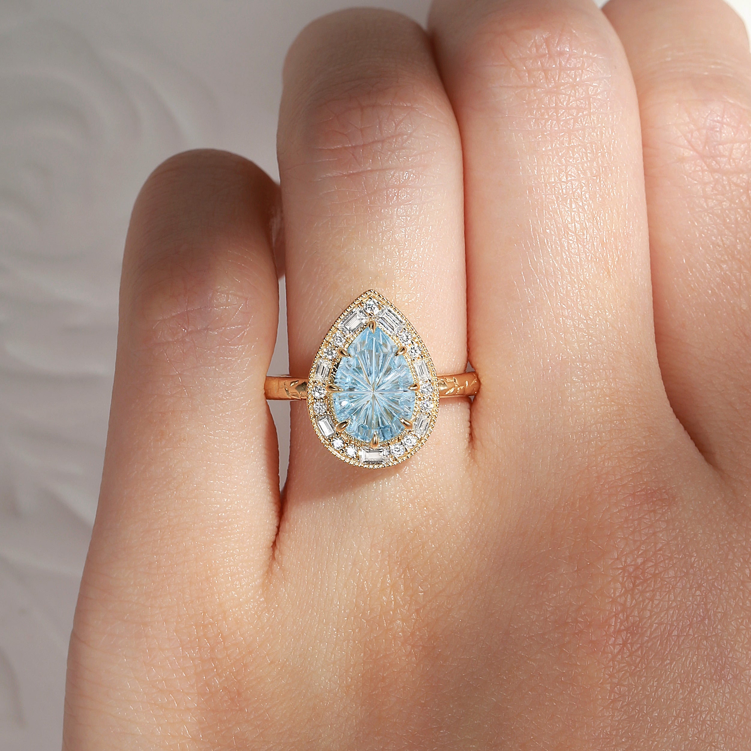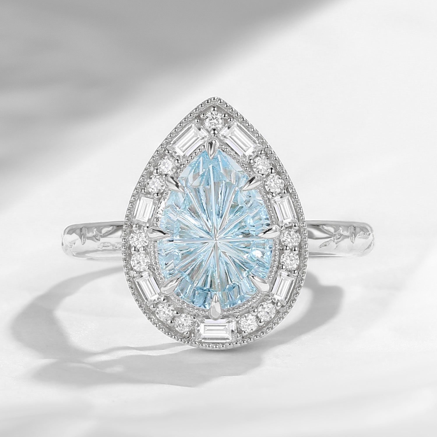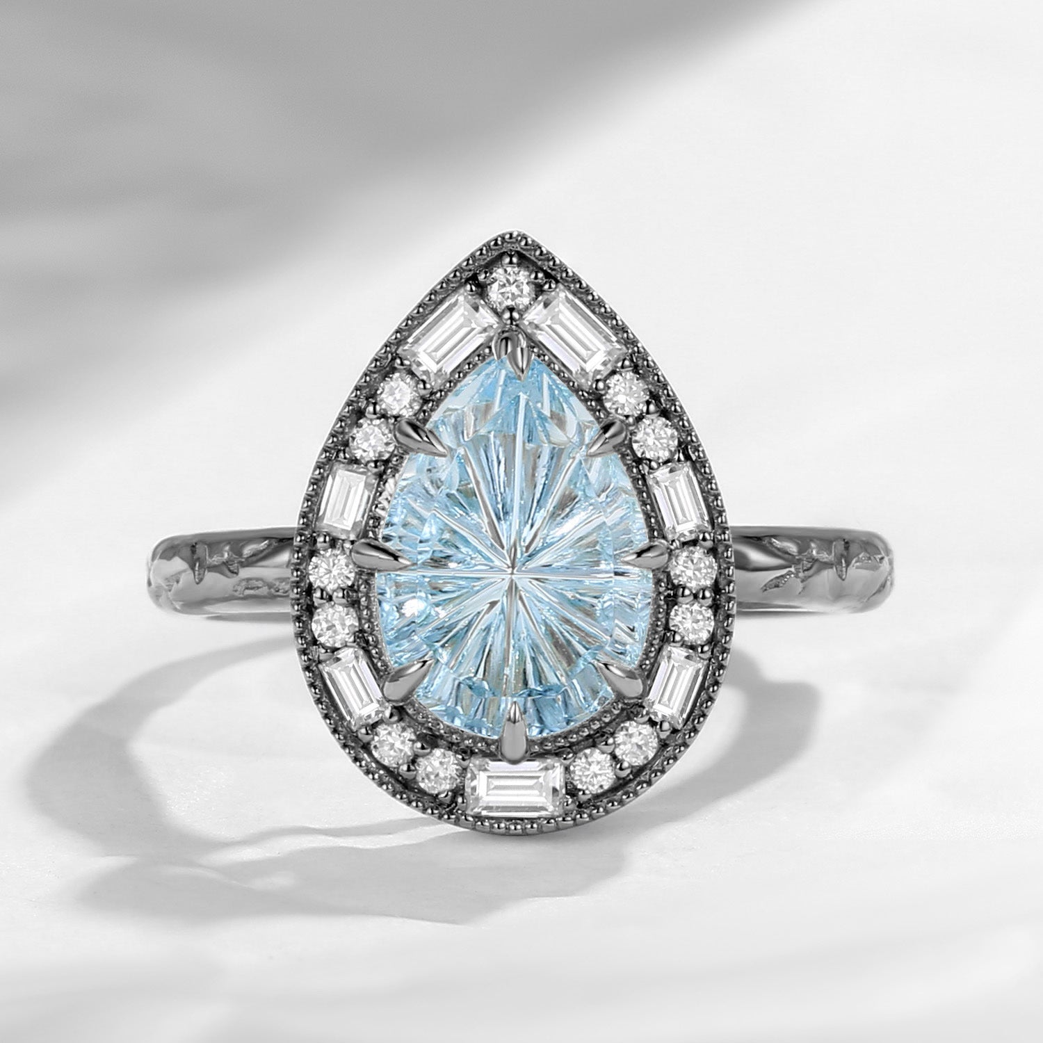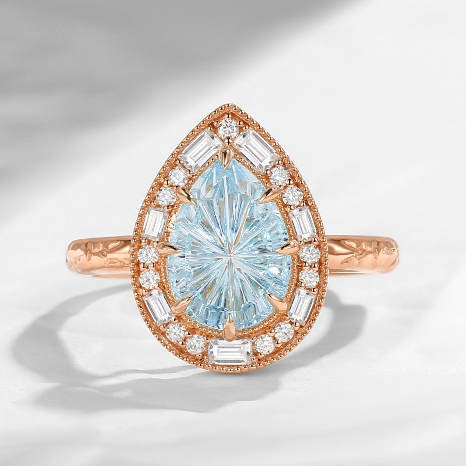 Halo Fantasy Carved Pear Firework Cut Natural Aquamarine Engagement Ring