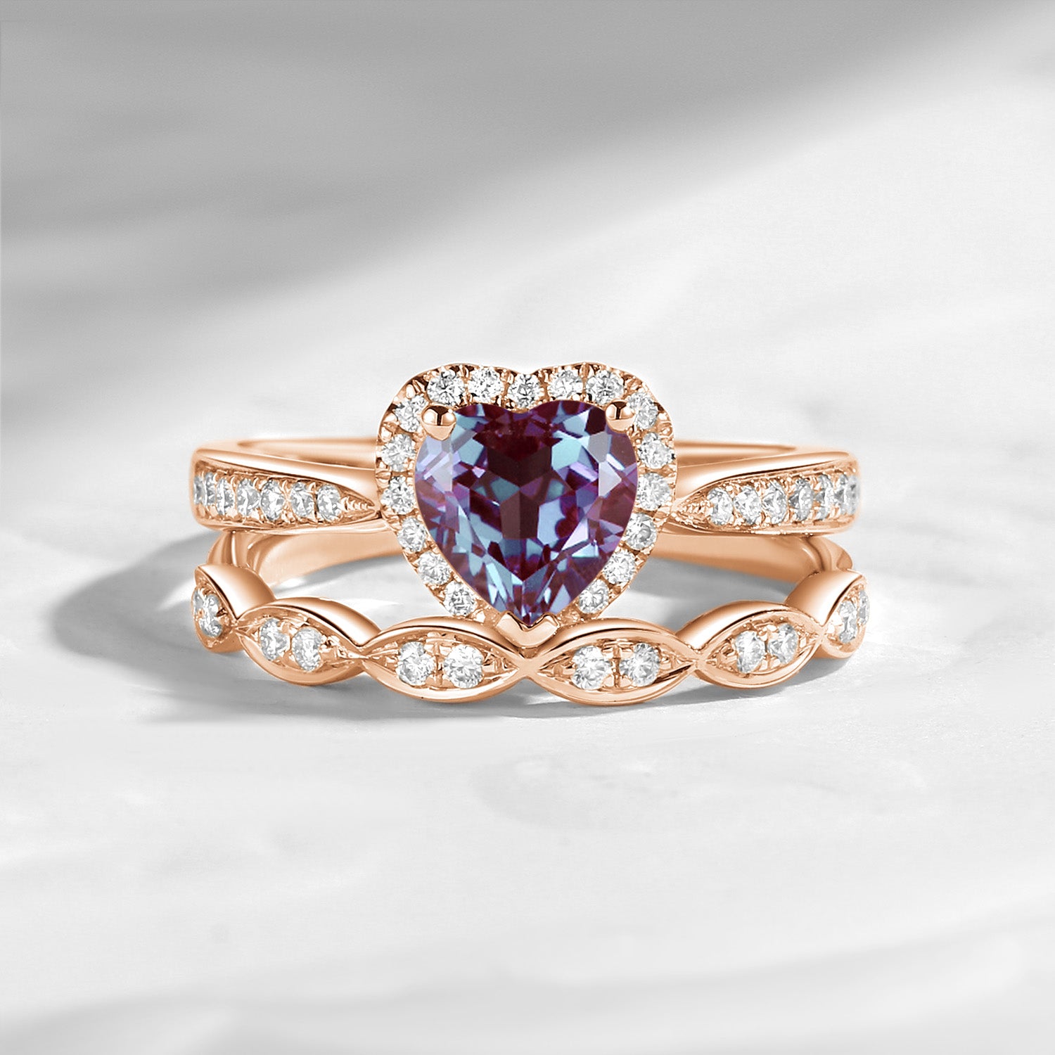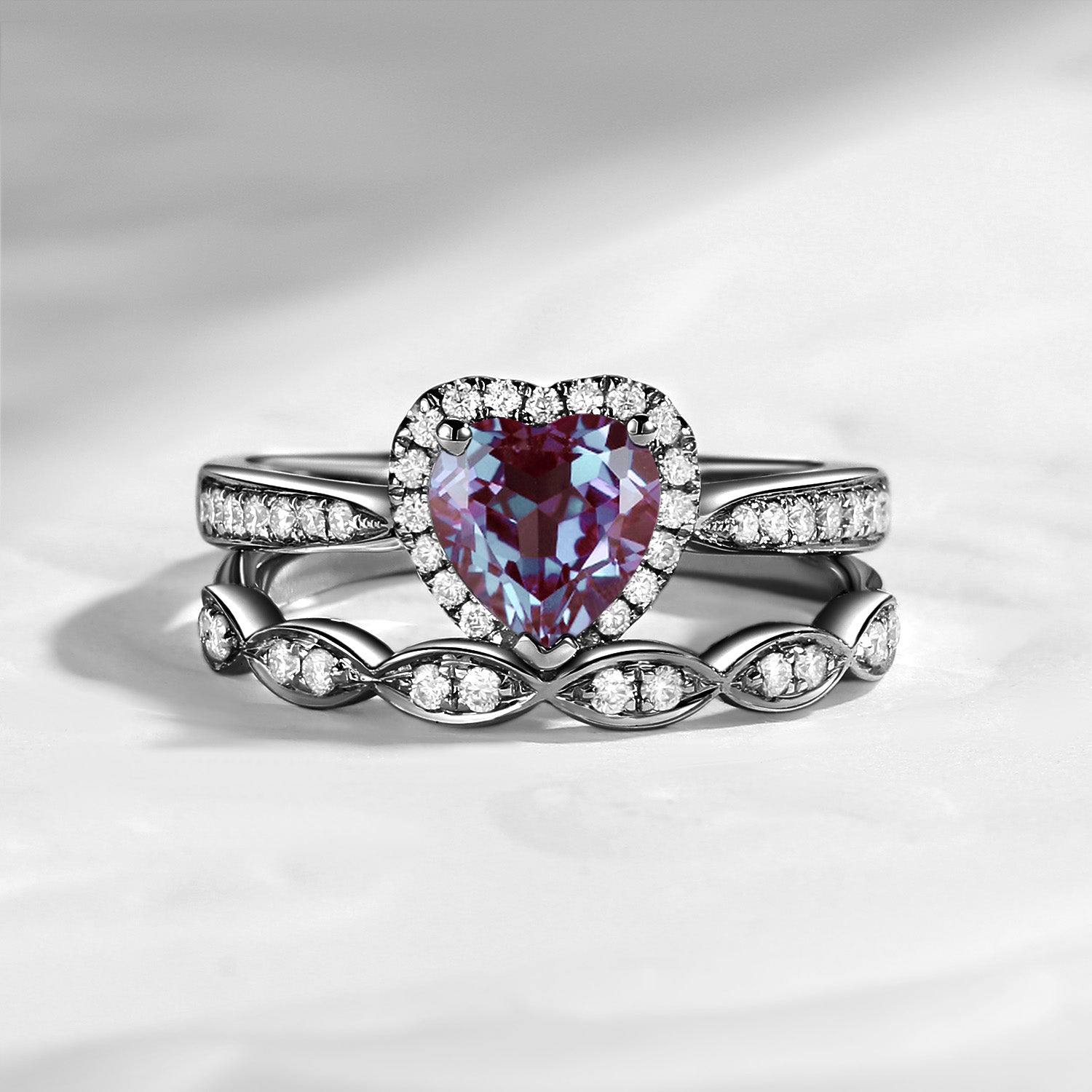 Unique Heart Shaped Halo Lab Alexandrite Engagement Ring 2pcs Set