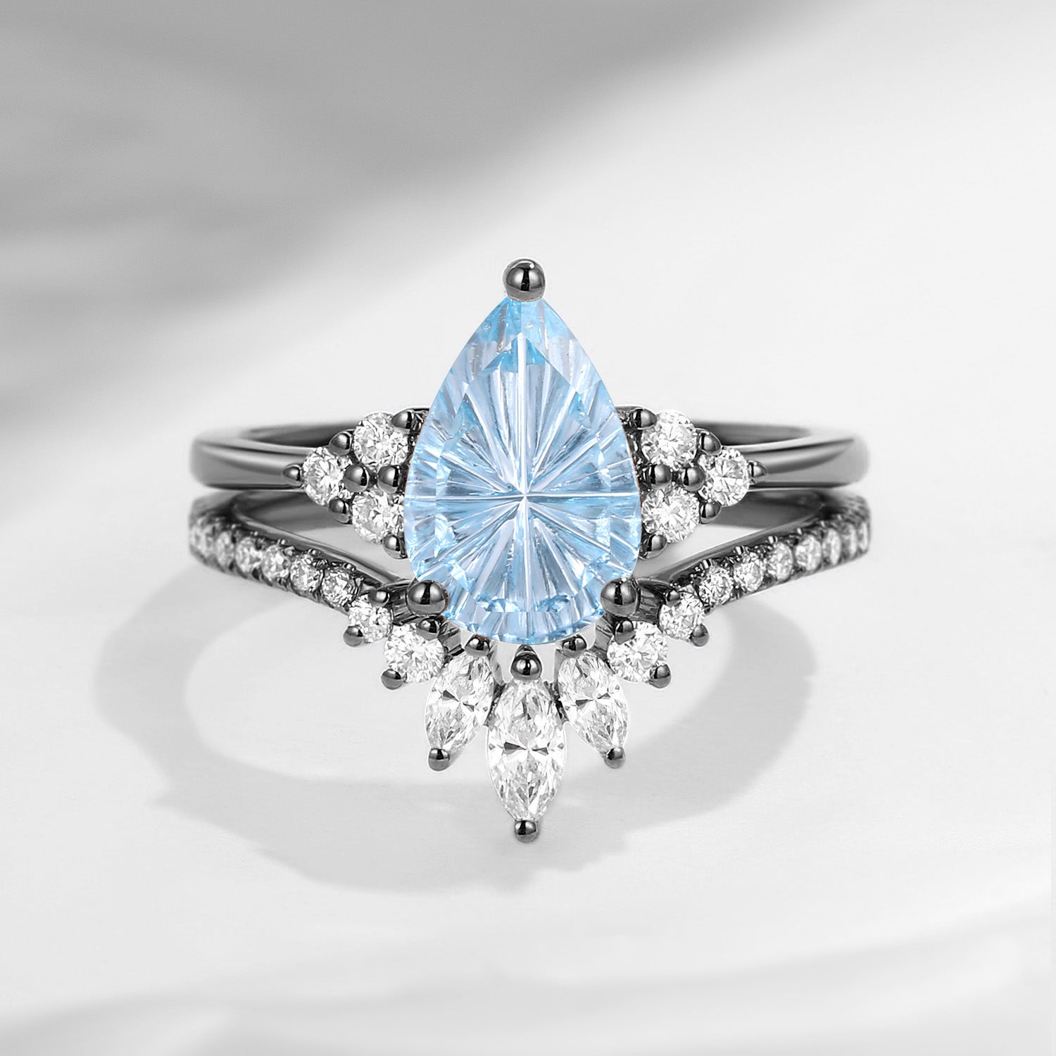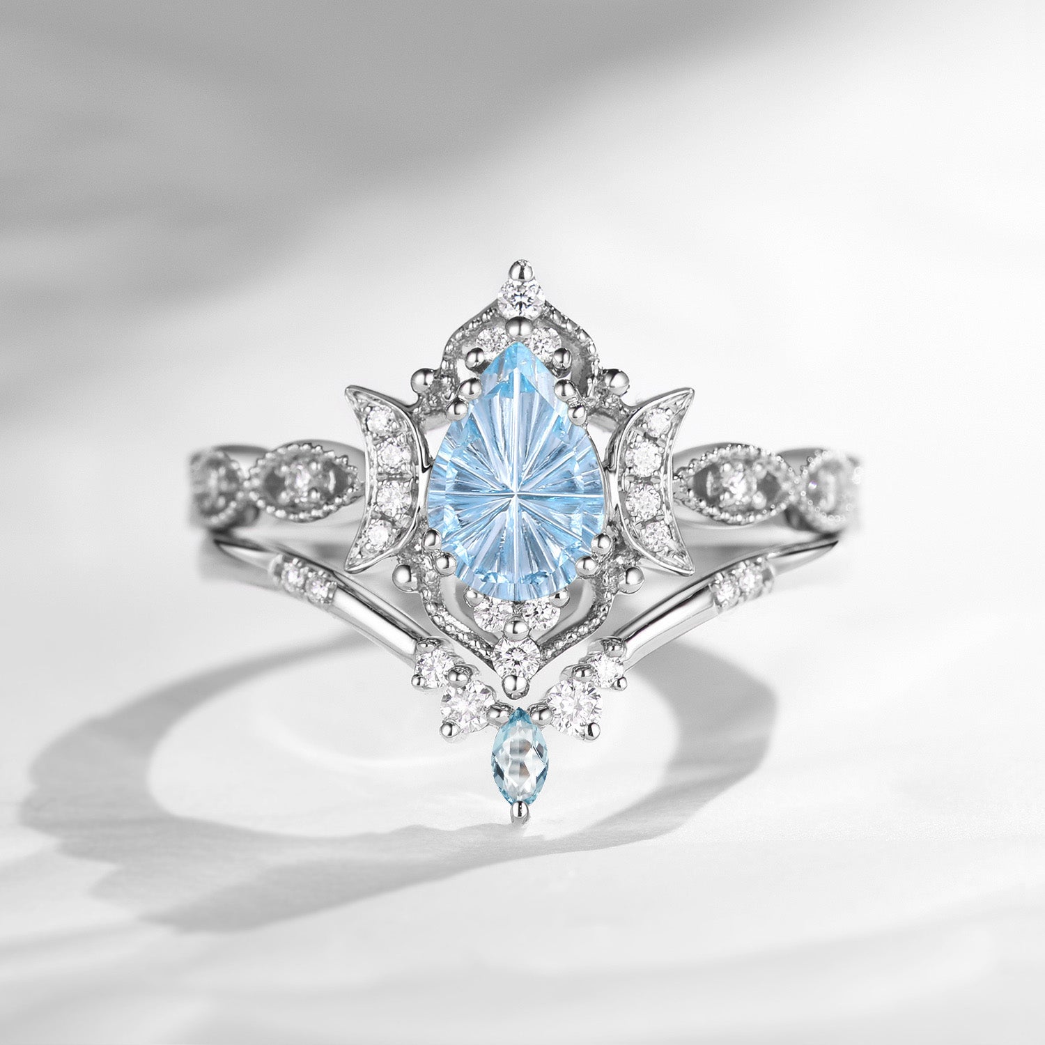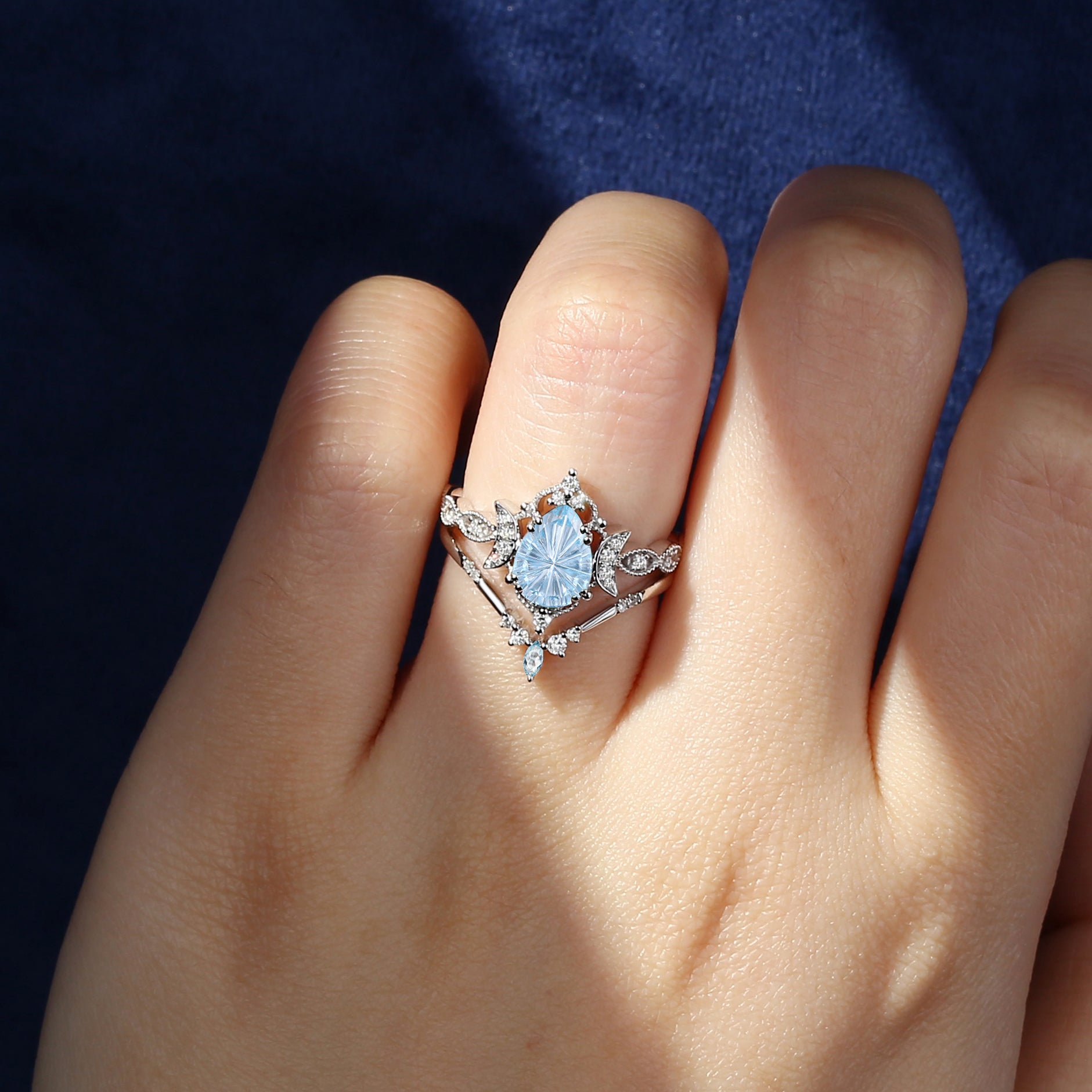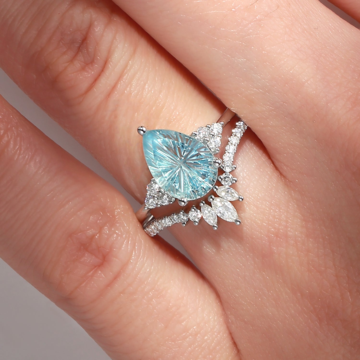 Pear Fantasy Carved Natural Aquamarine Cluster Engagement Ring Set 2pcs - Vivian