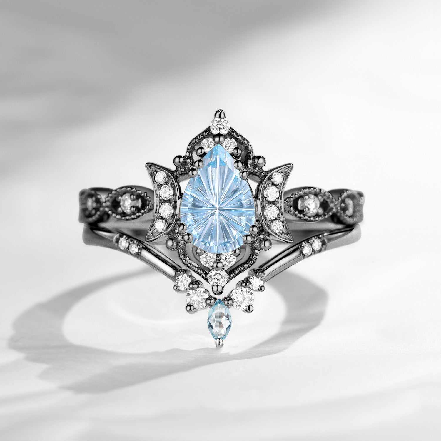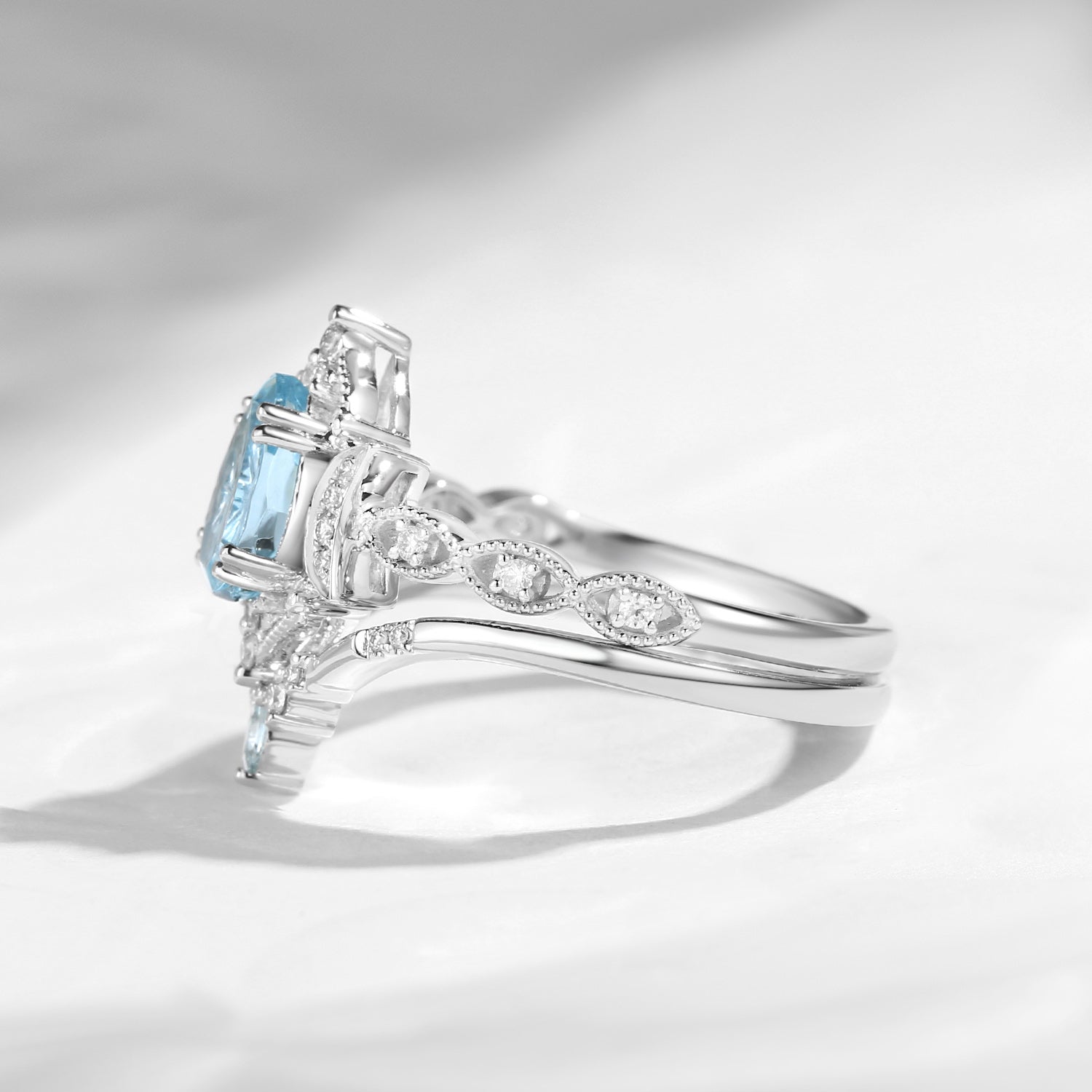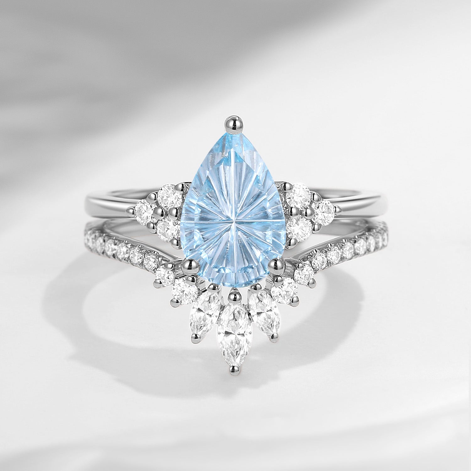 Pear Fantasy Carved Natural Aquamarine Cluster Engagement Ring Set 2pcs - Vivian