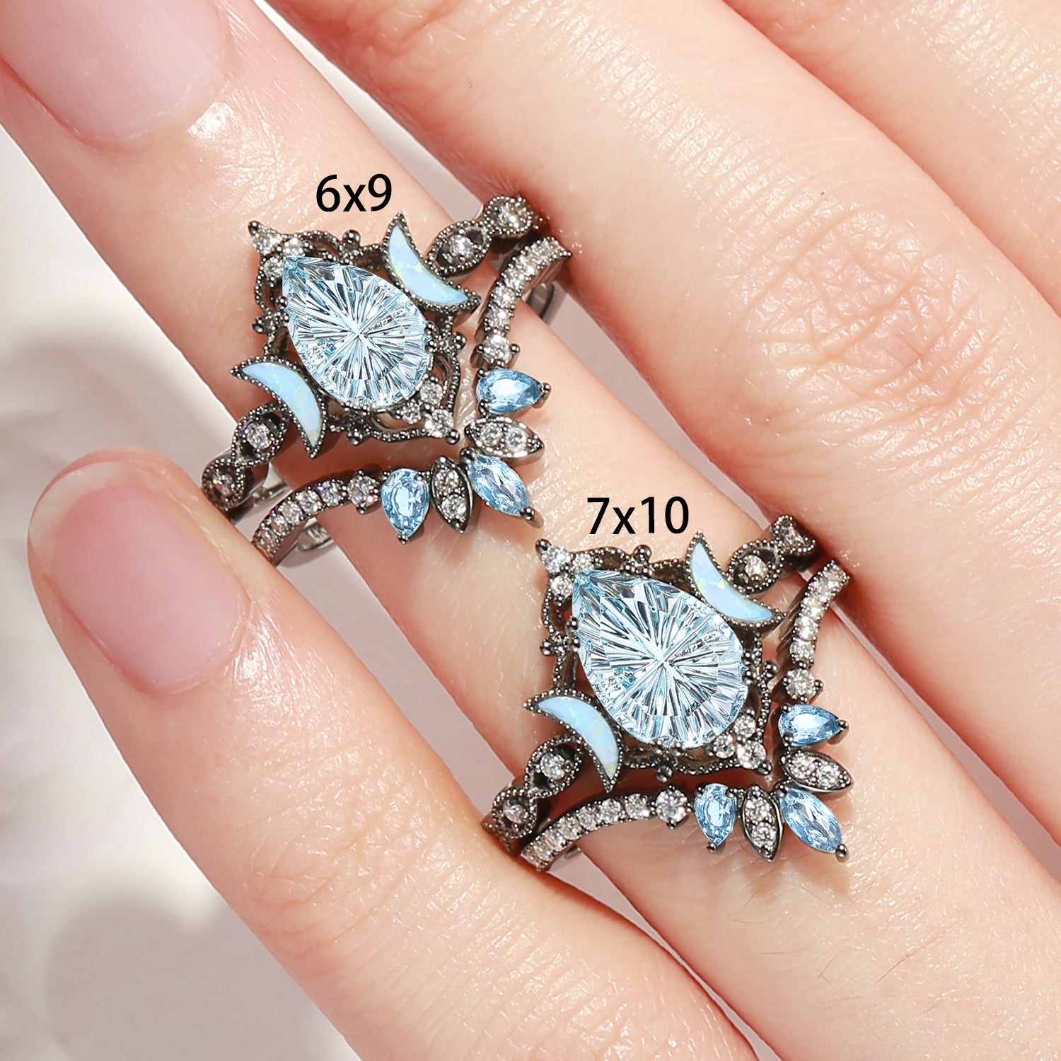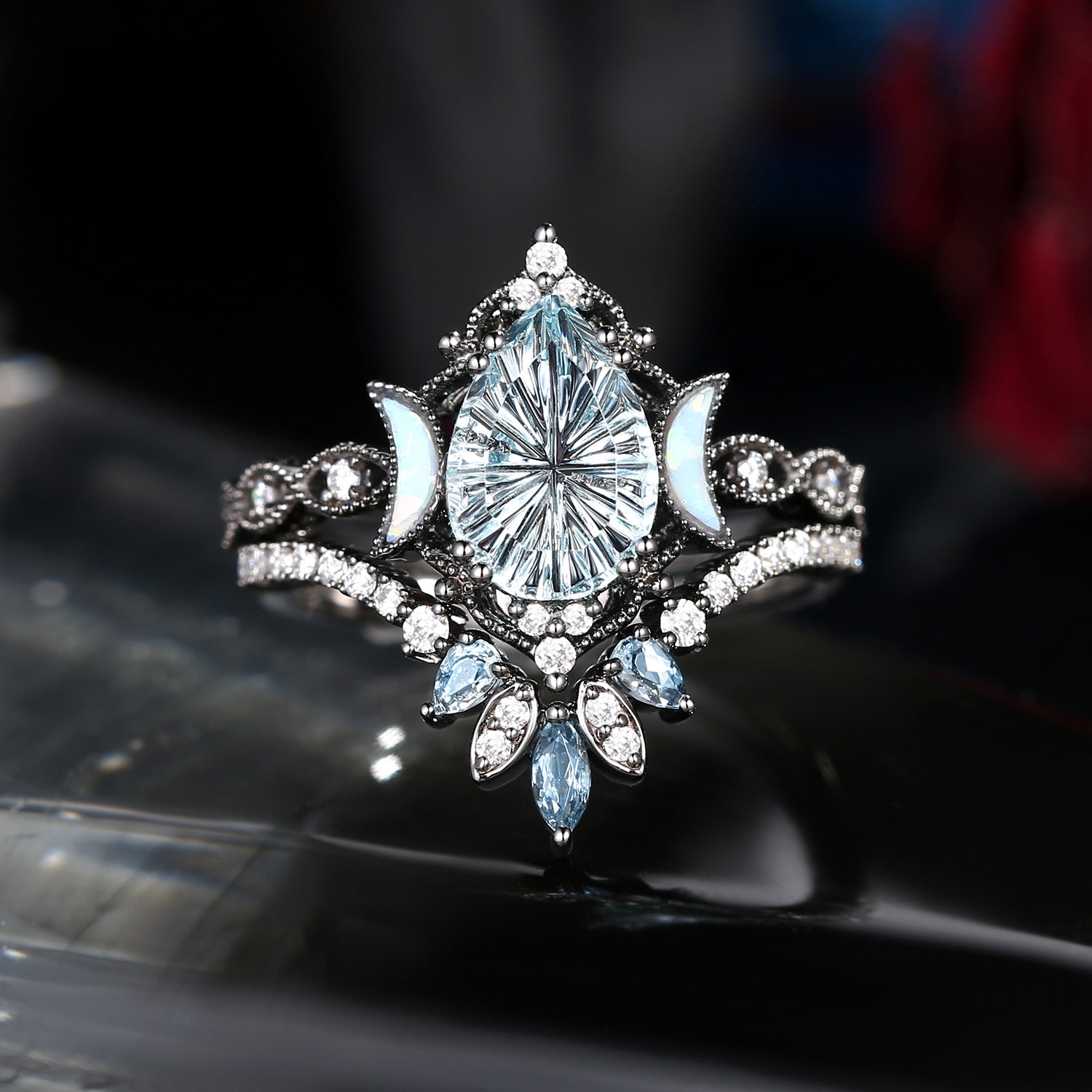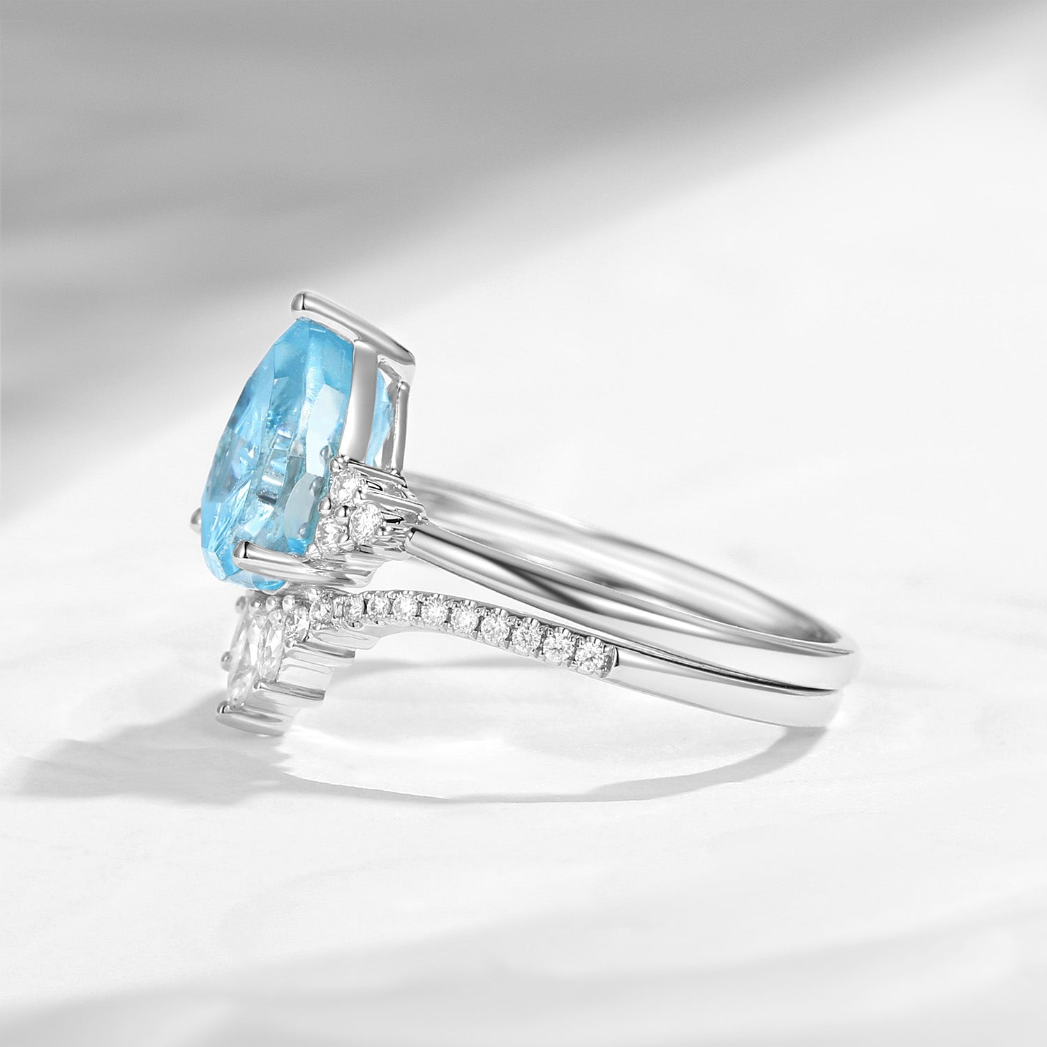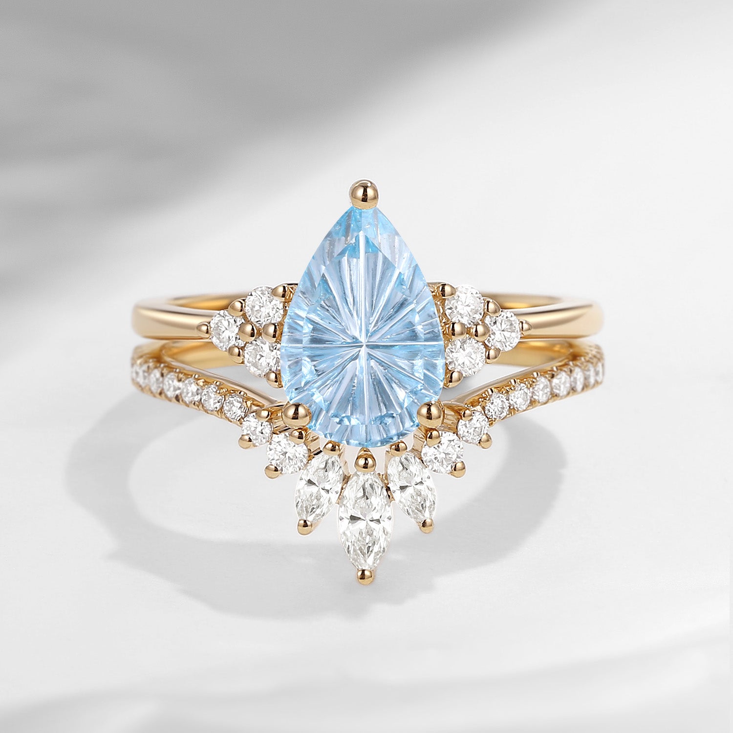 Pear Fantasy Carved Natural Aquamarine Cluster Engagement Ring Set 2pcs - Vivian