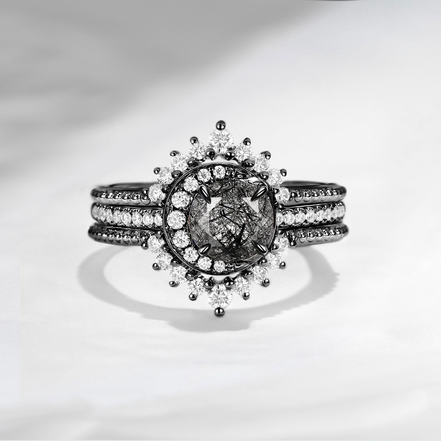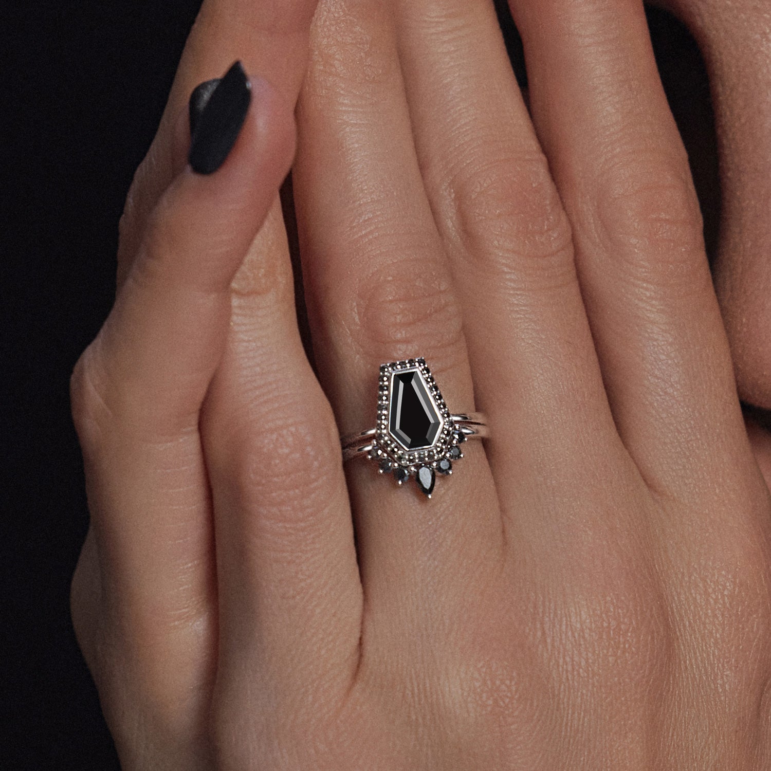 Vintage Coffin Cut Black Moissanite Engagement Ring Set 2pcs - Goth Girl