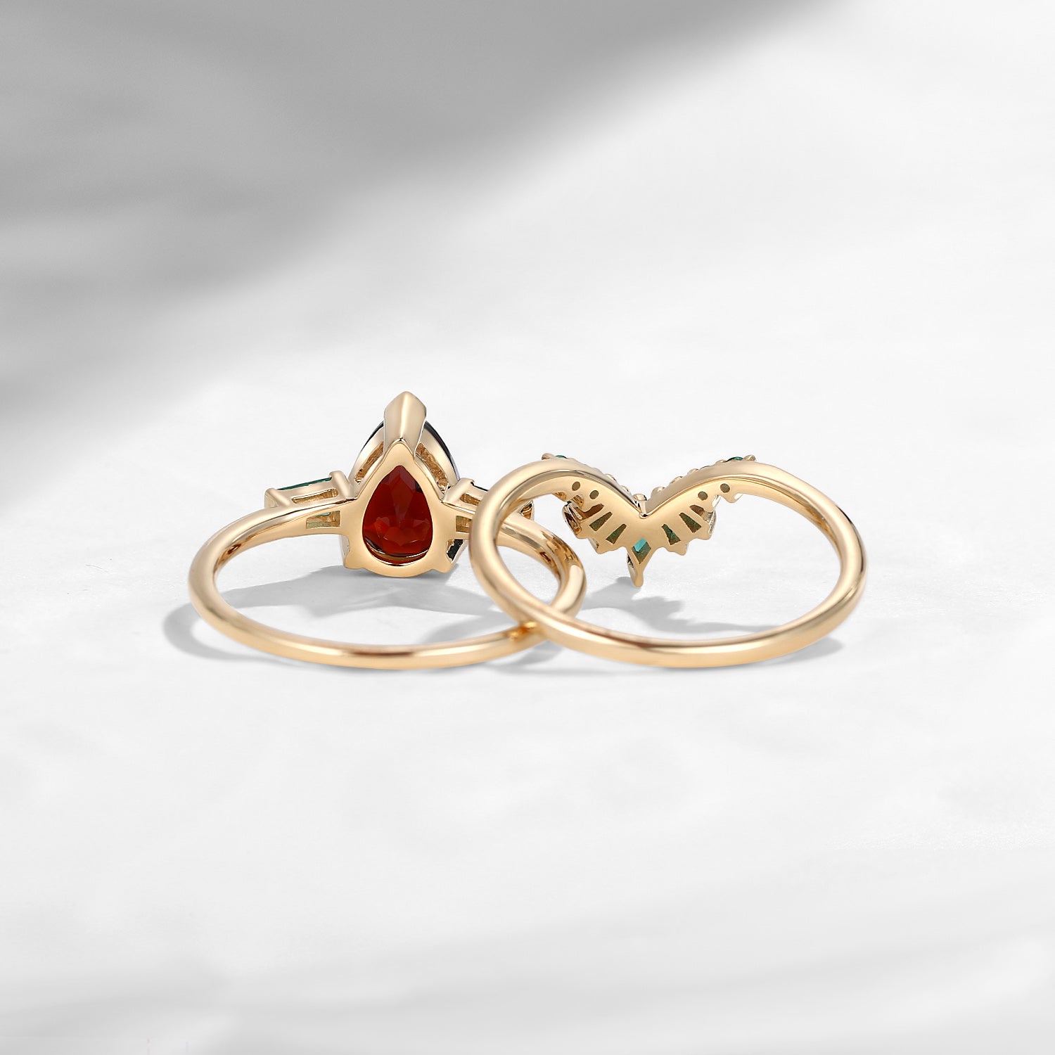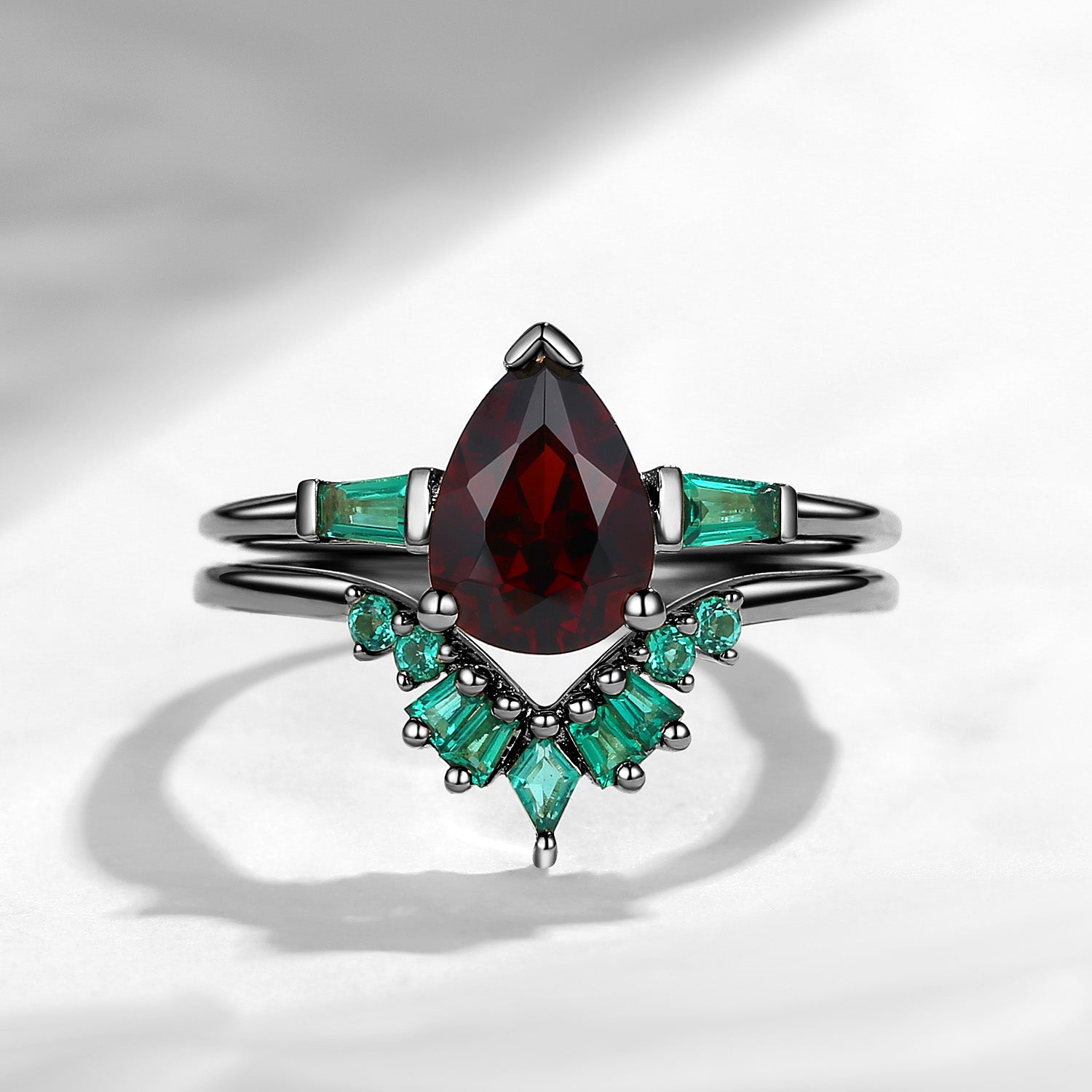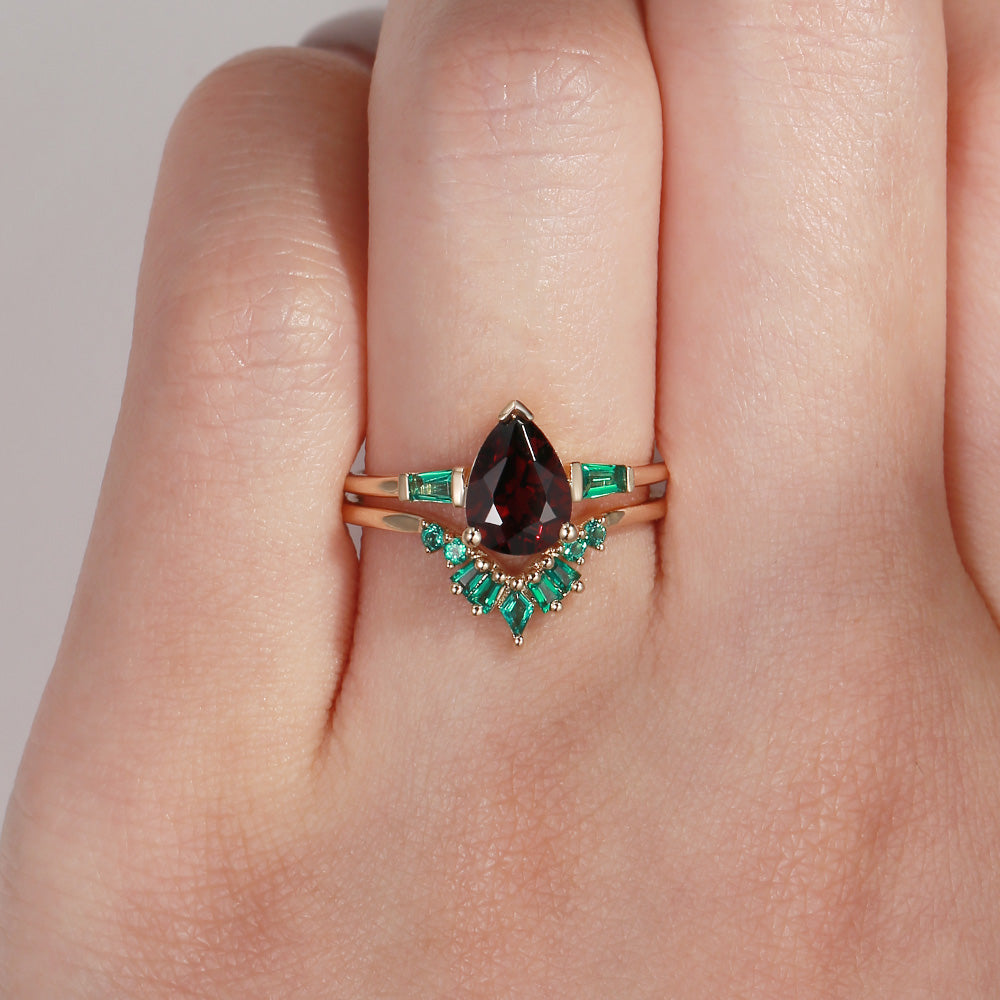 Unique Pear Cut Garnet Art Deco Emerald Stacking Bridal Set 2pcs