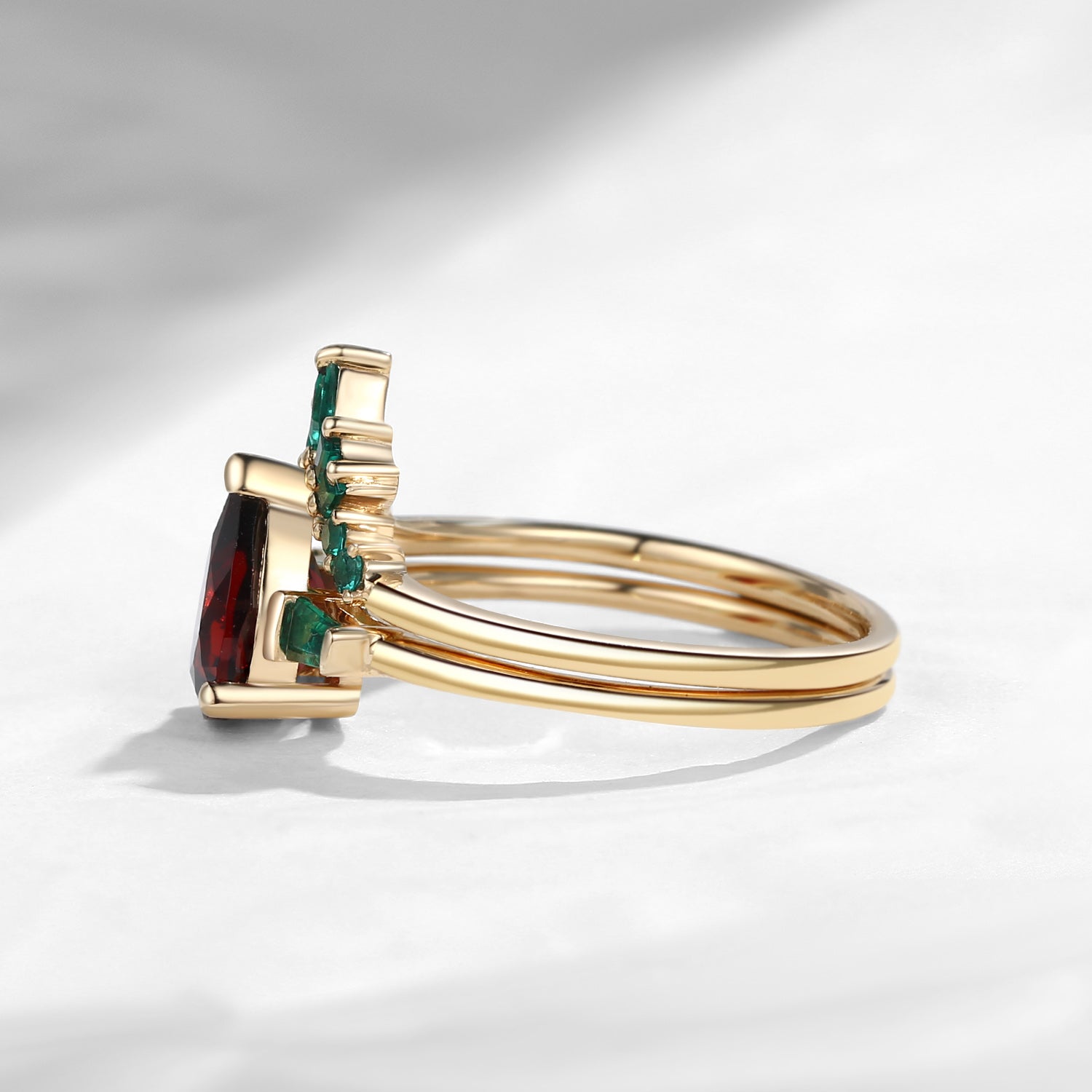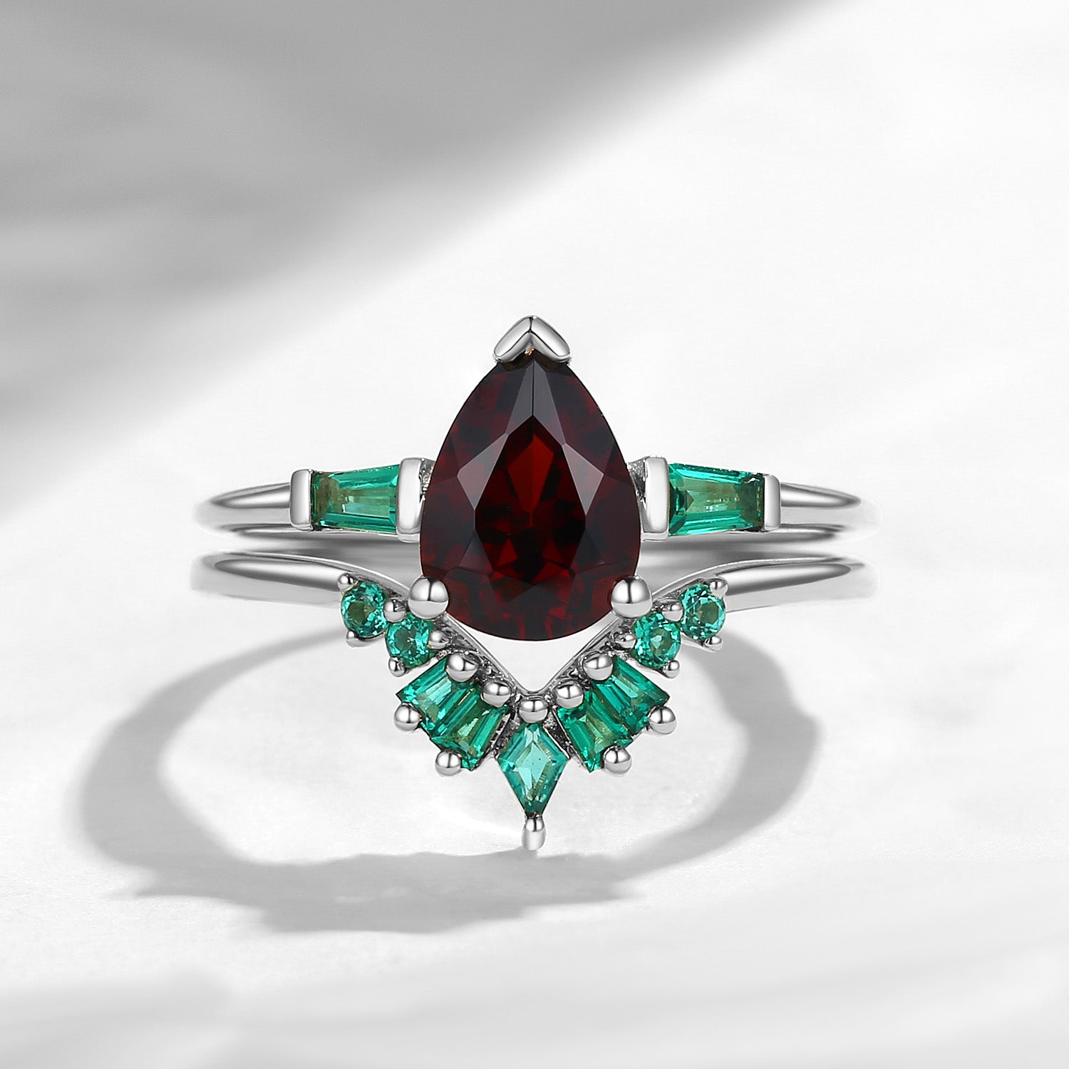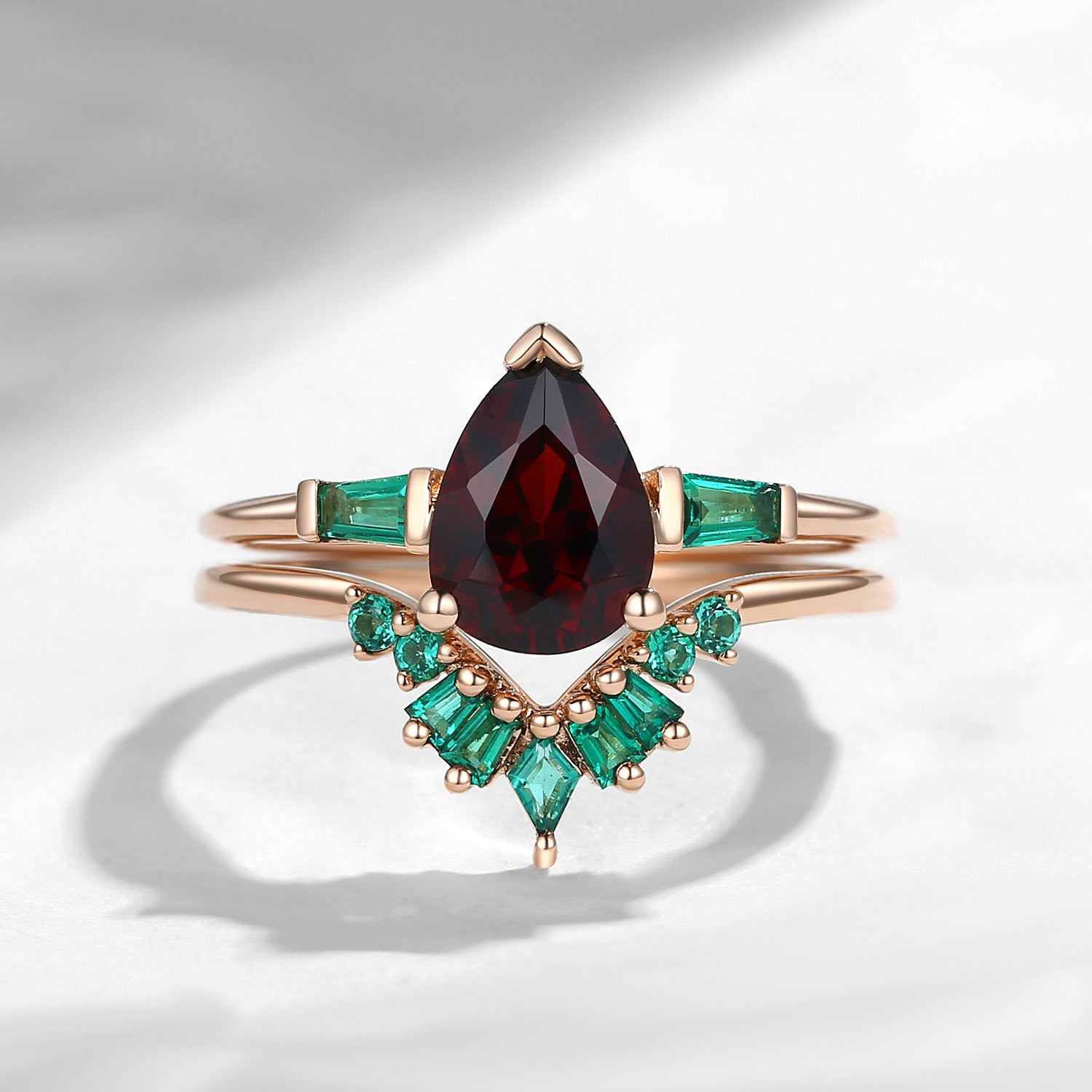 Unique Pear Cut Garnet Art Deco Emerald Stacking Bridal Set 2pcs