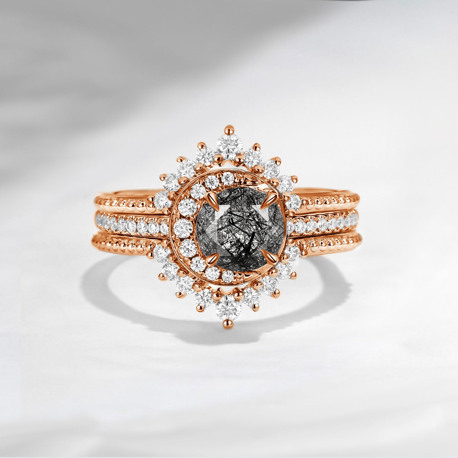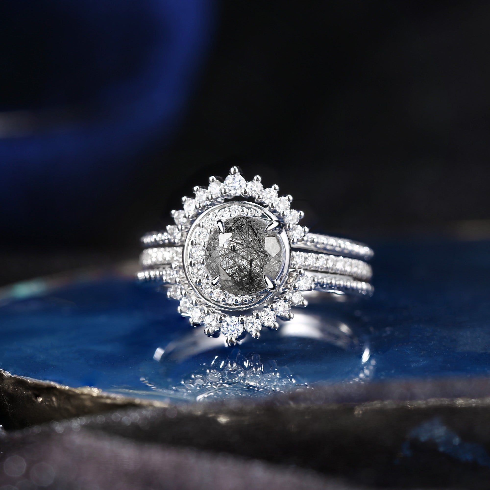Crescent Moon Round Shaped Natural Teal Sapphire Couple Rings - Full Moon