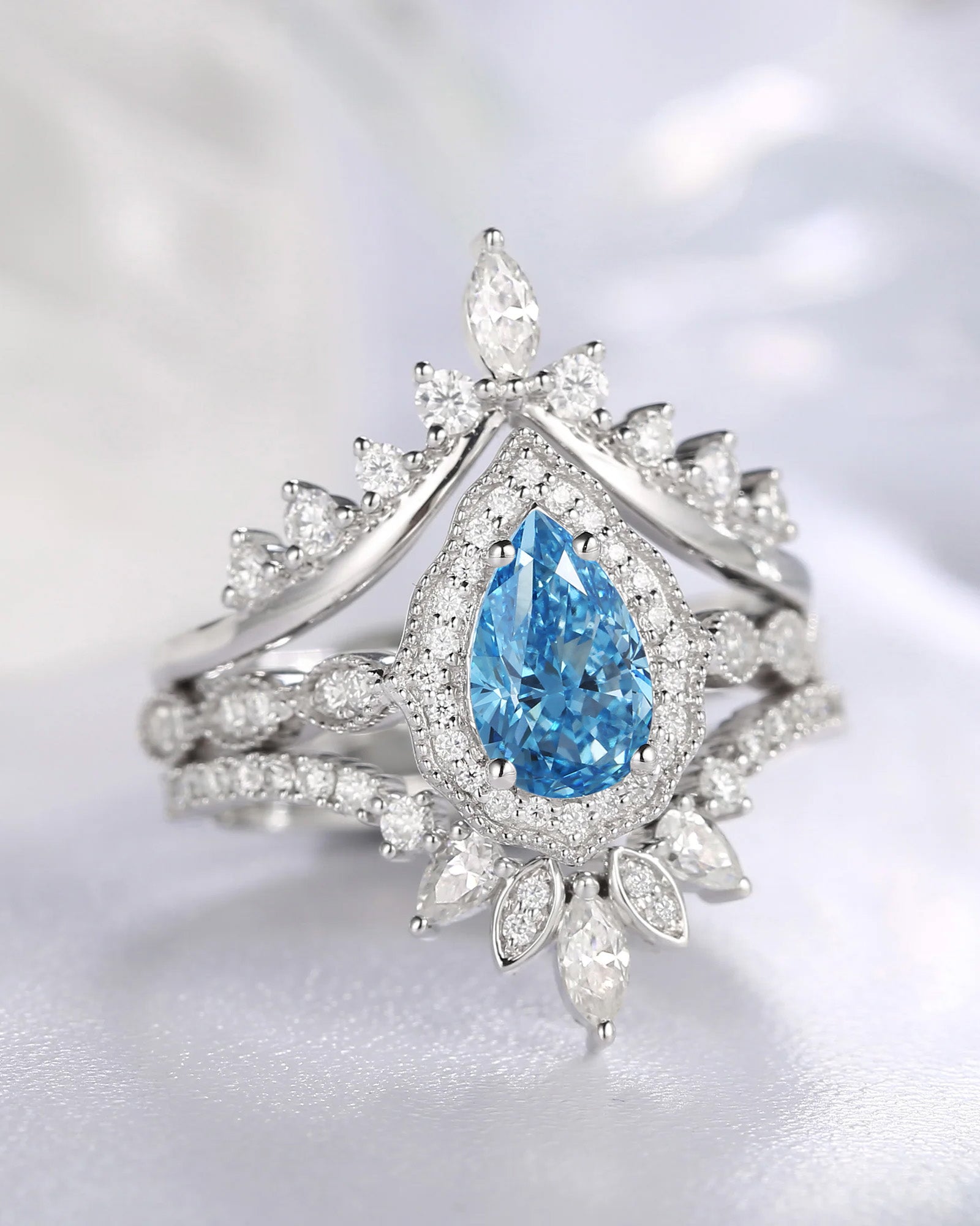Pear Cut Lab Blue Diamond Cluster Engagement Ring Set 2pcs - Vivian