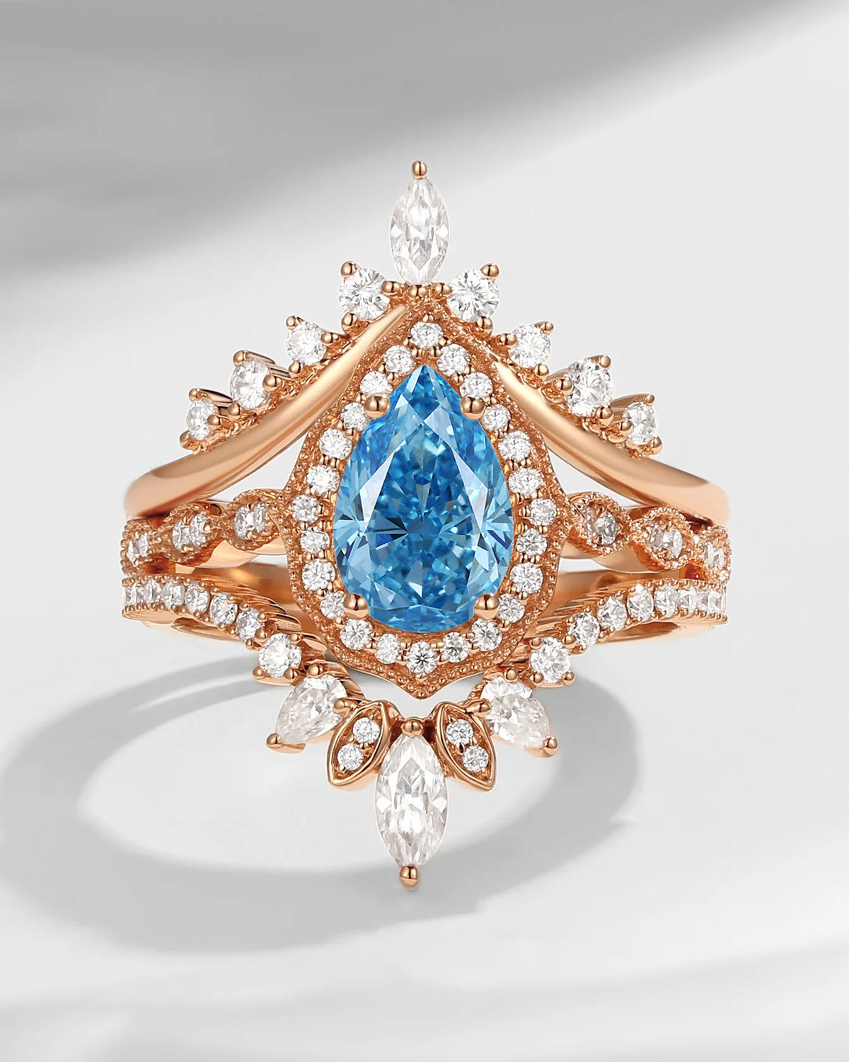 Pear Shaped Lab Blue Diamond Antique Stacking Engagement Ring 2pcs - Evelyn