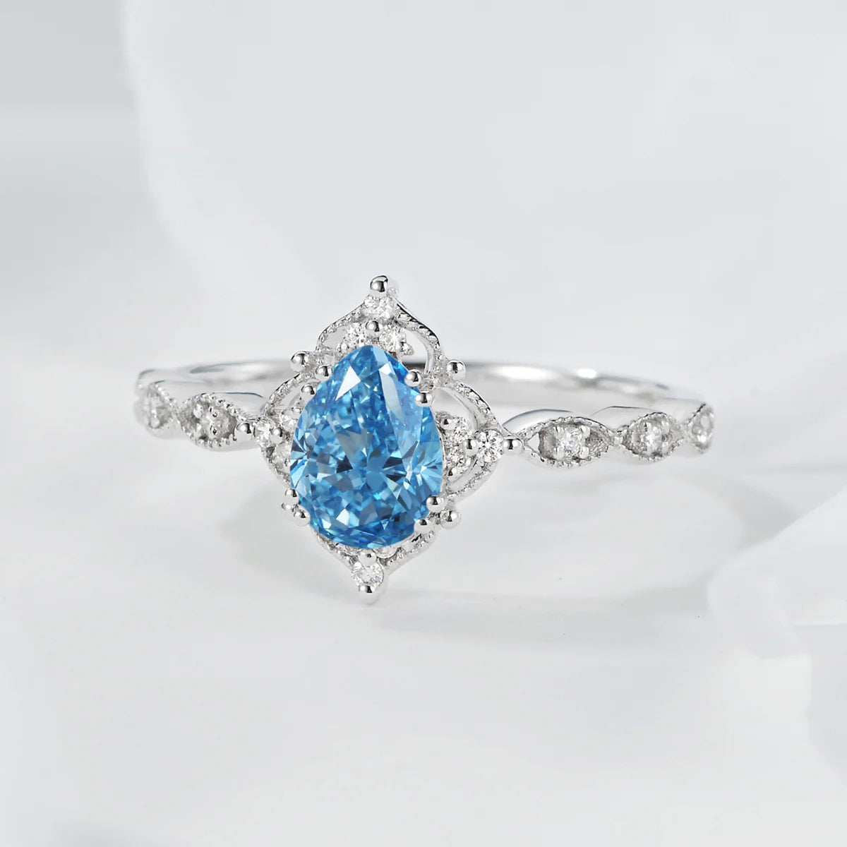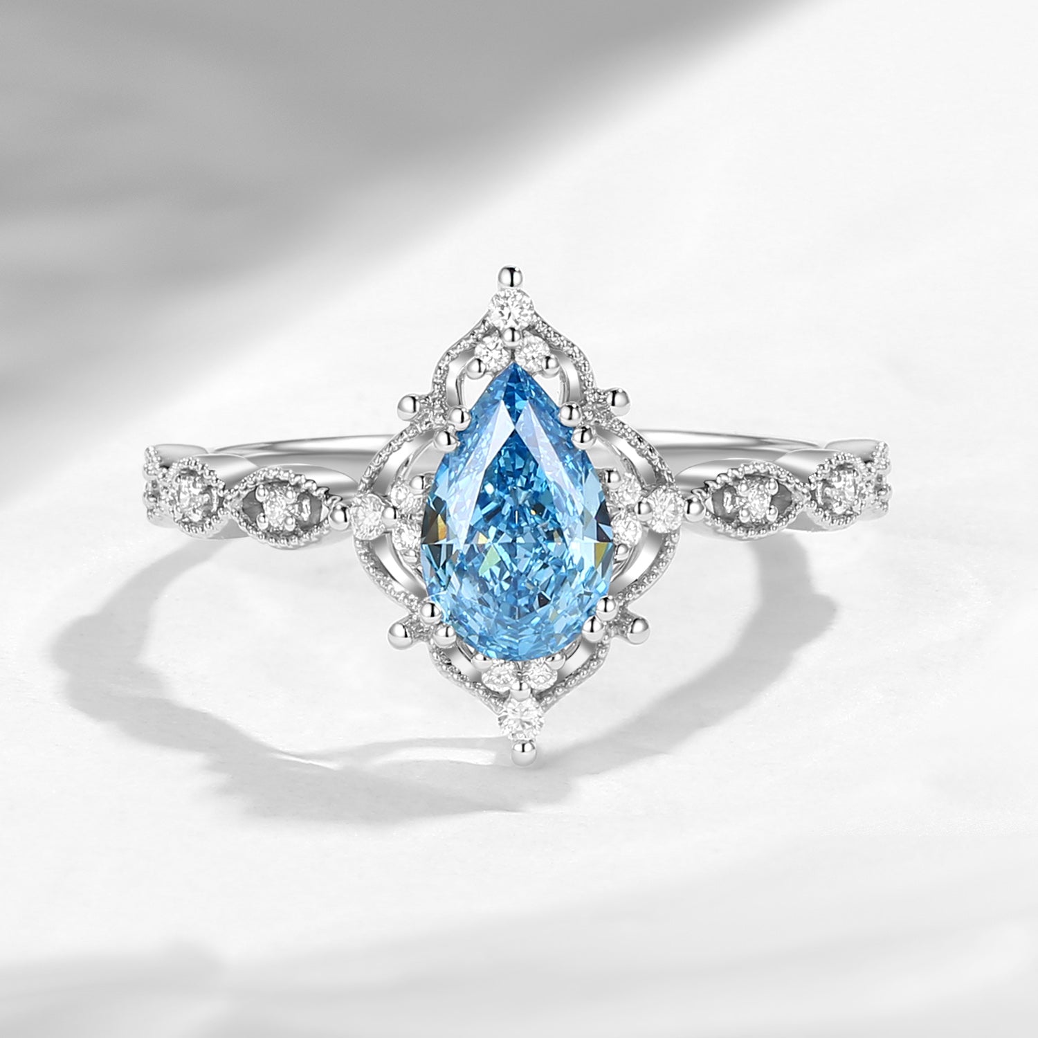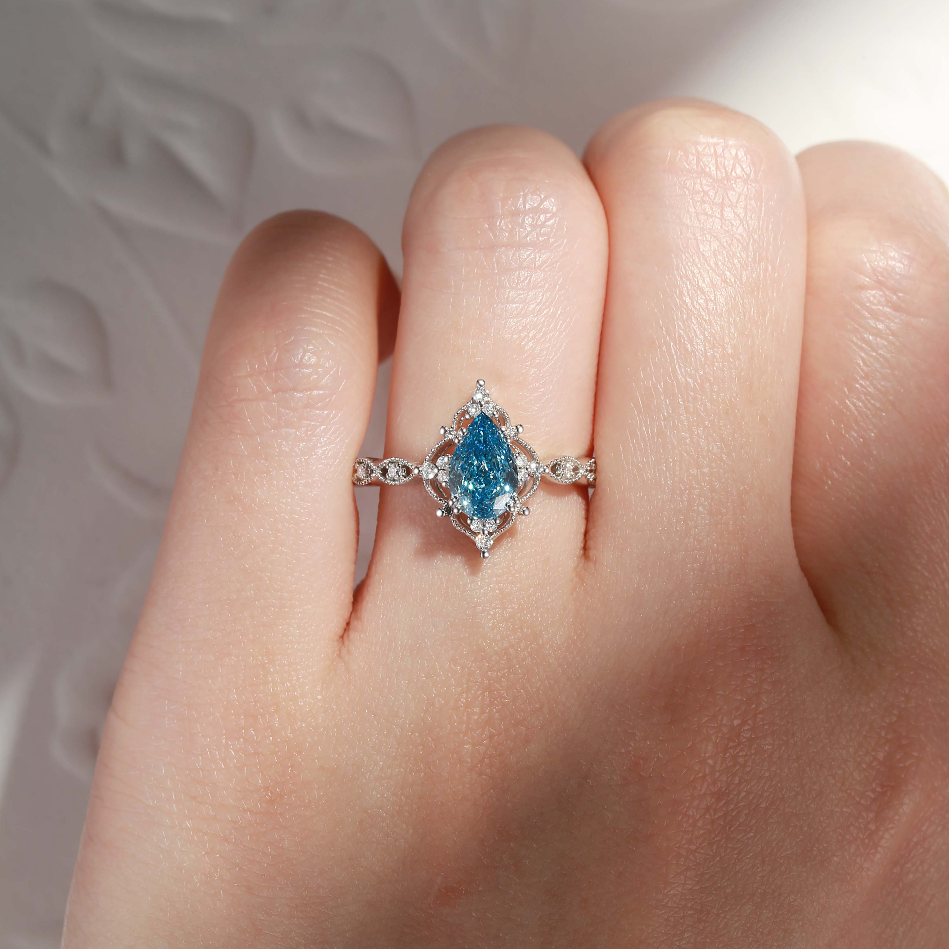 Vintage Pear Shaped Blue Lab Diamond Engagement Ring