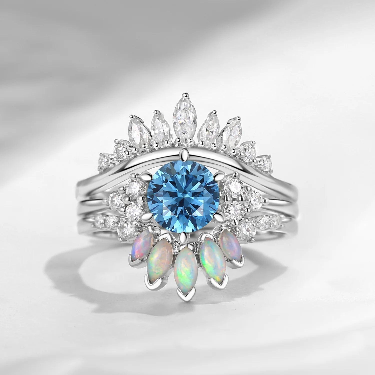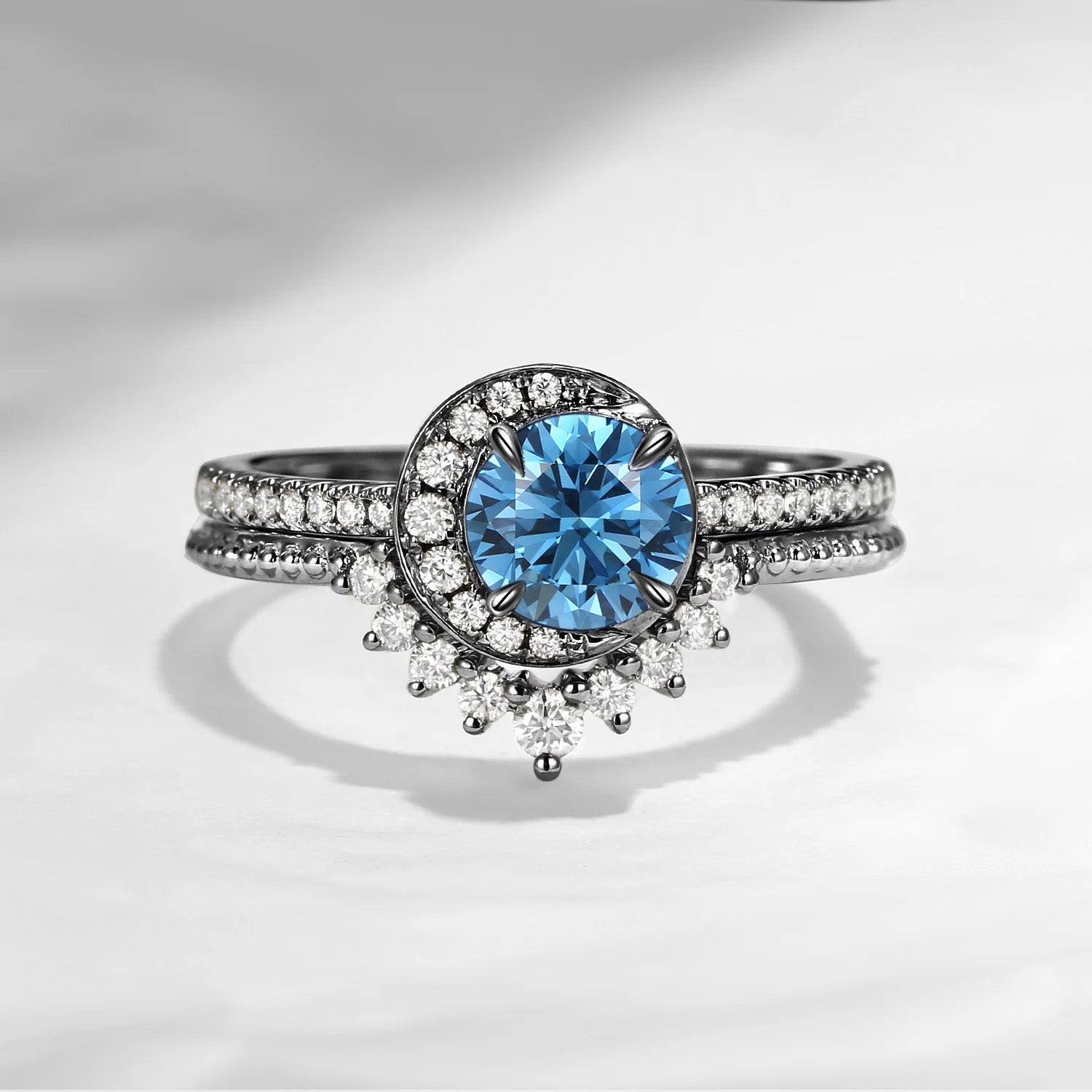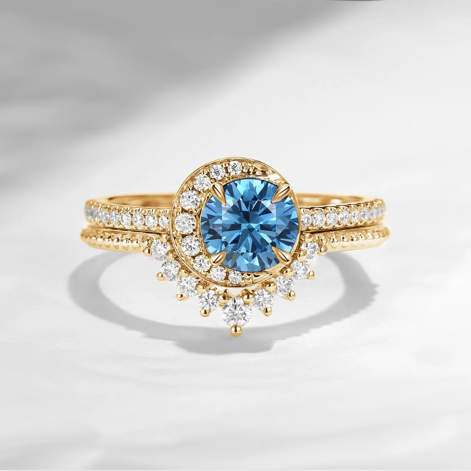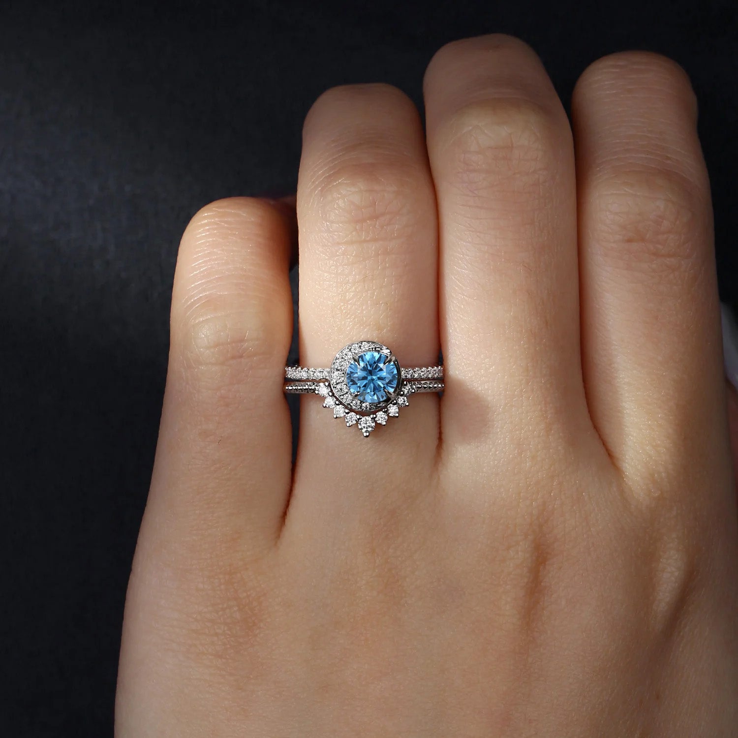 Crescent Moon | Unique Blue Lab Diamond Engagement Ring Set 2pcs - Full Moon