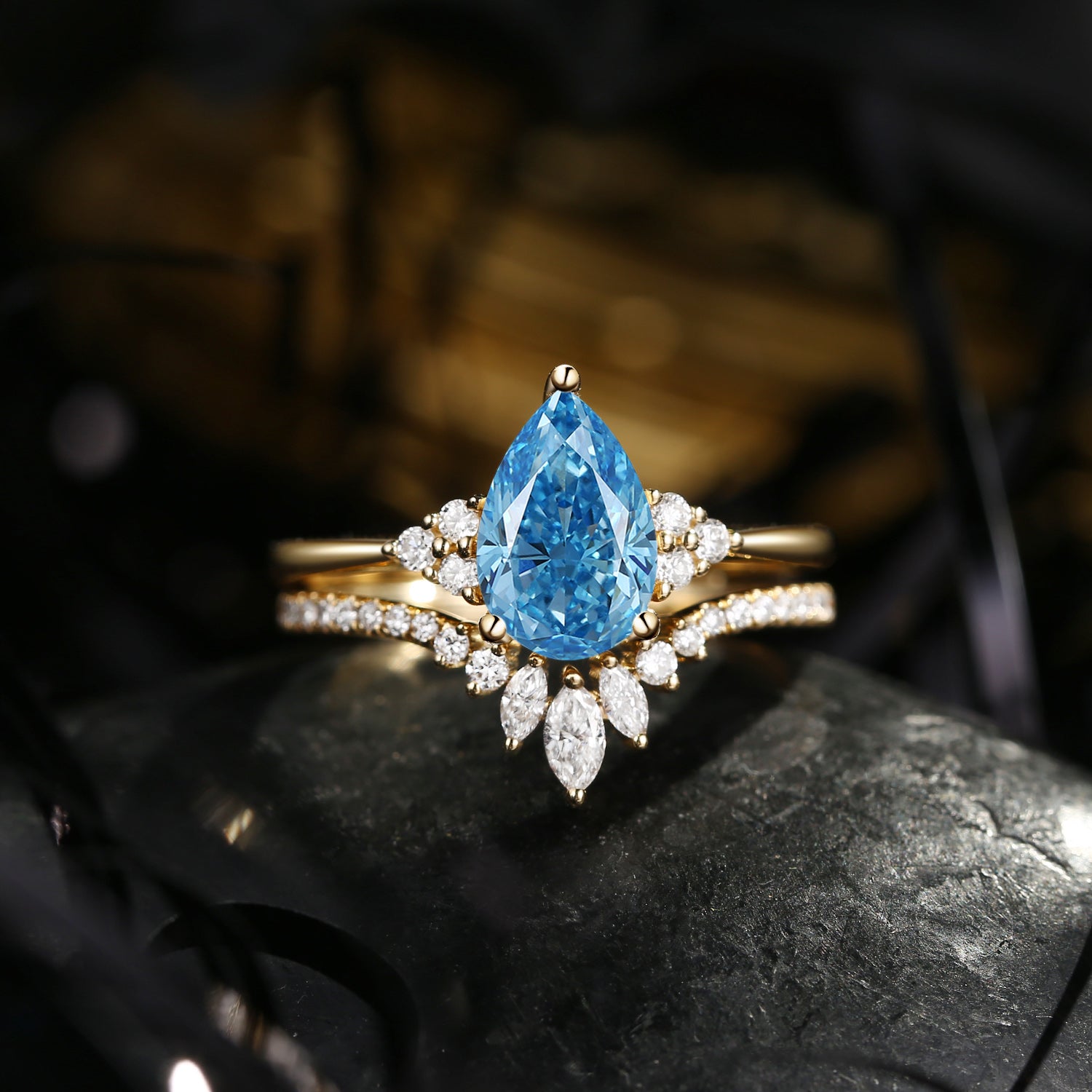 Pear Cut Blue Lab Diamond Cluster Engagement Ring Set 2pcs - Vivian