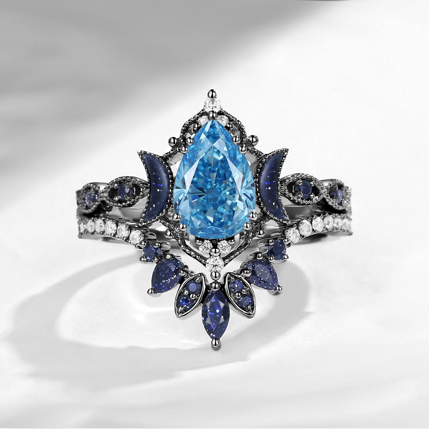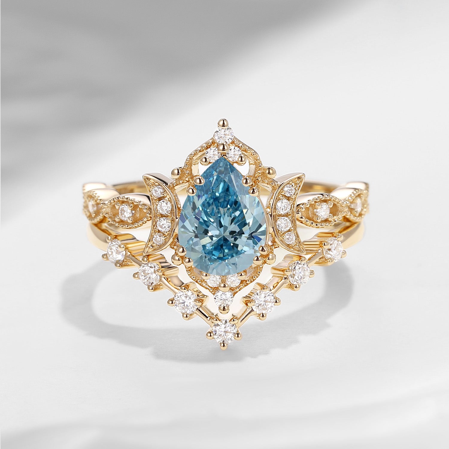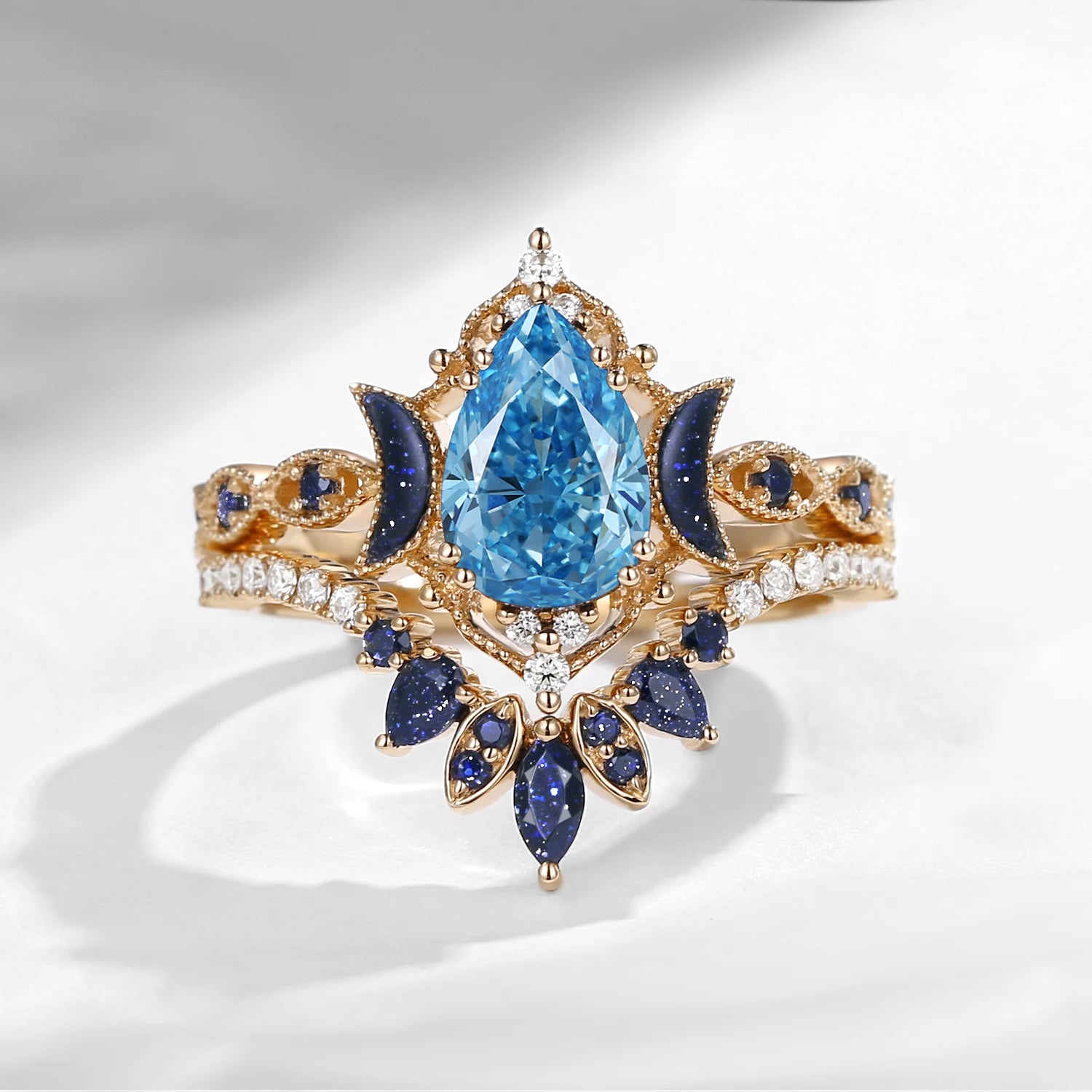 Crescent Moon | Pear Cut Blue Lab Diamond Galaxy Engagement Ring Set 2pcs