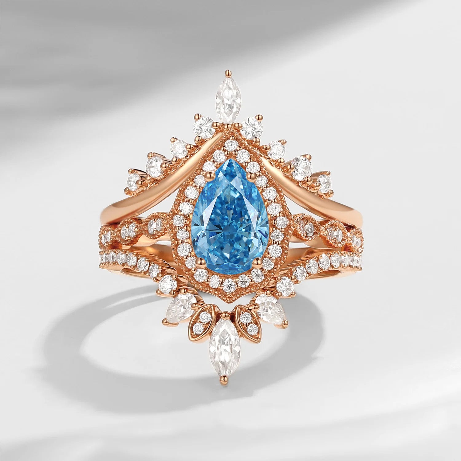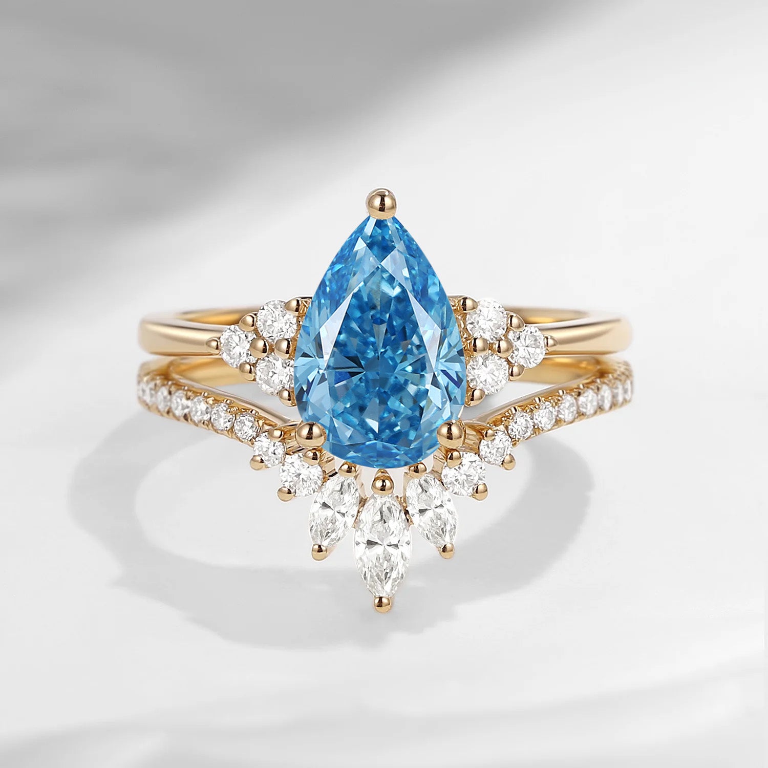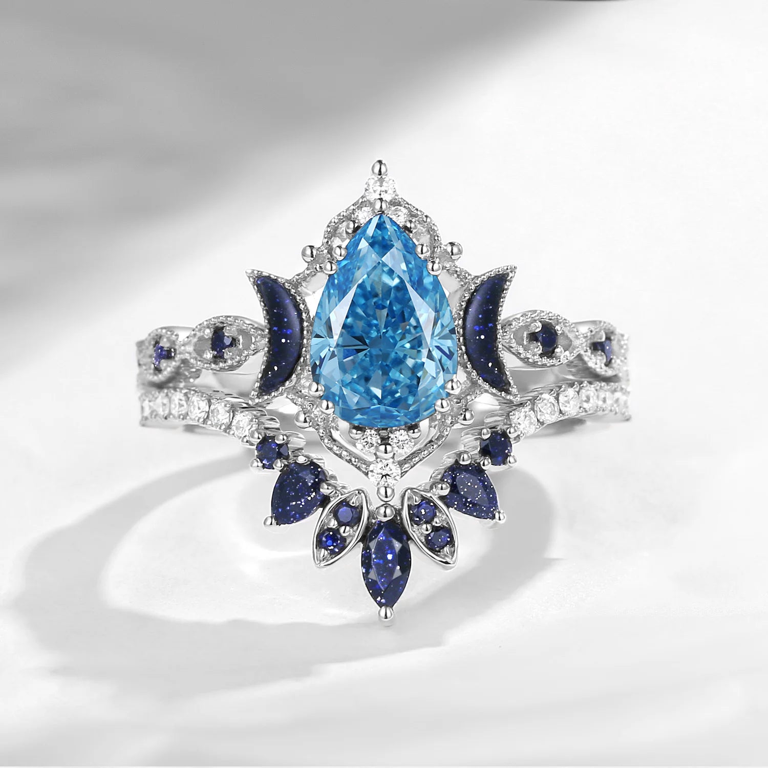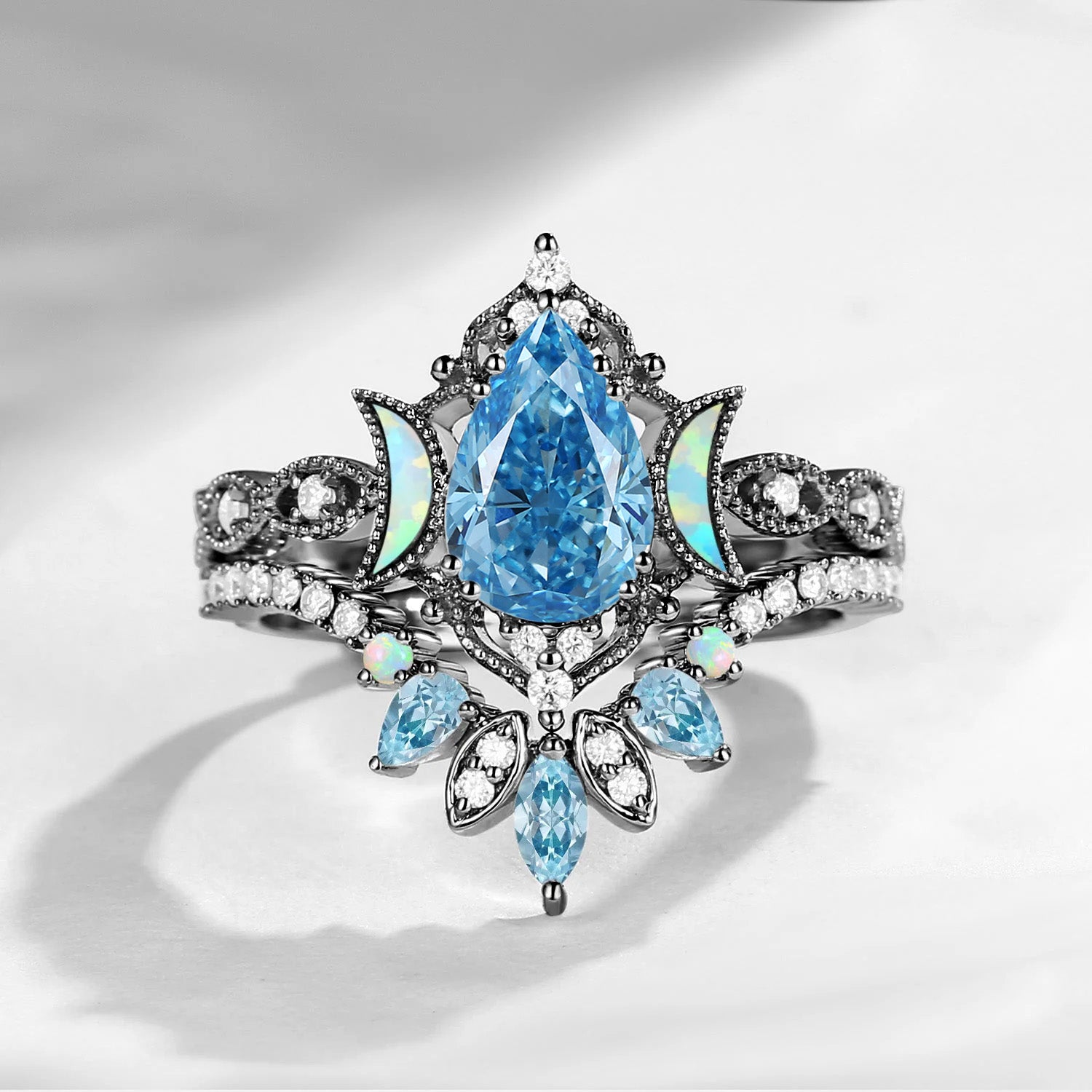 Crescent Moon | Pear Cut Blue Lab Diamond Galaxy Engagement Ring Set 2pcs
