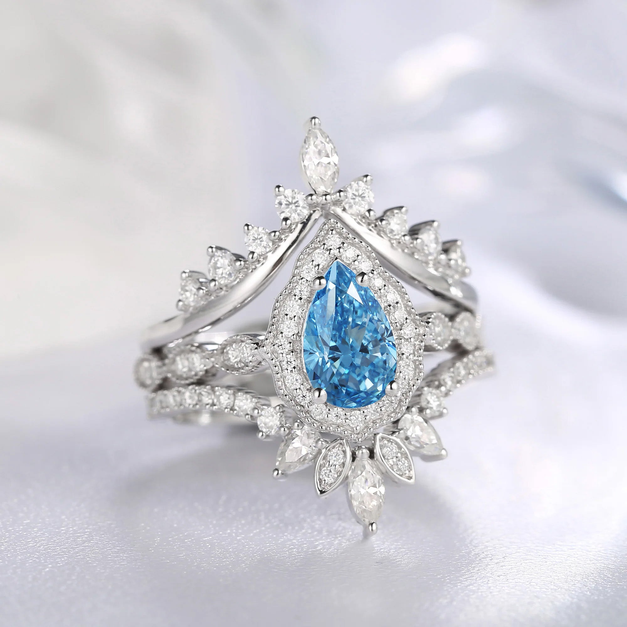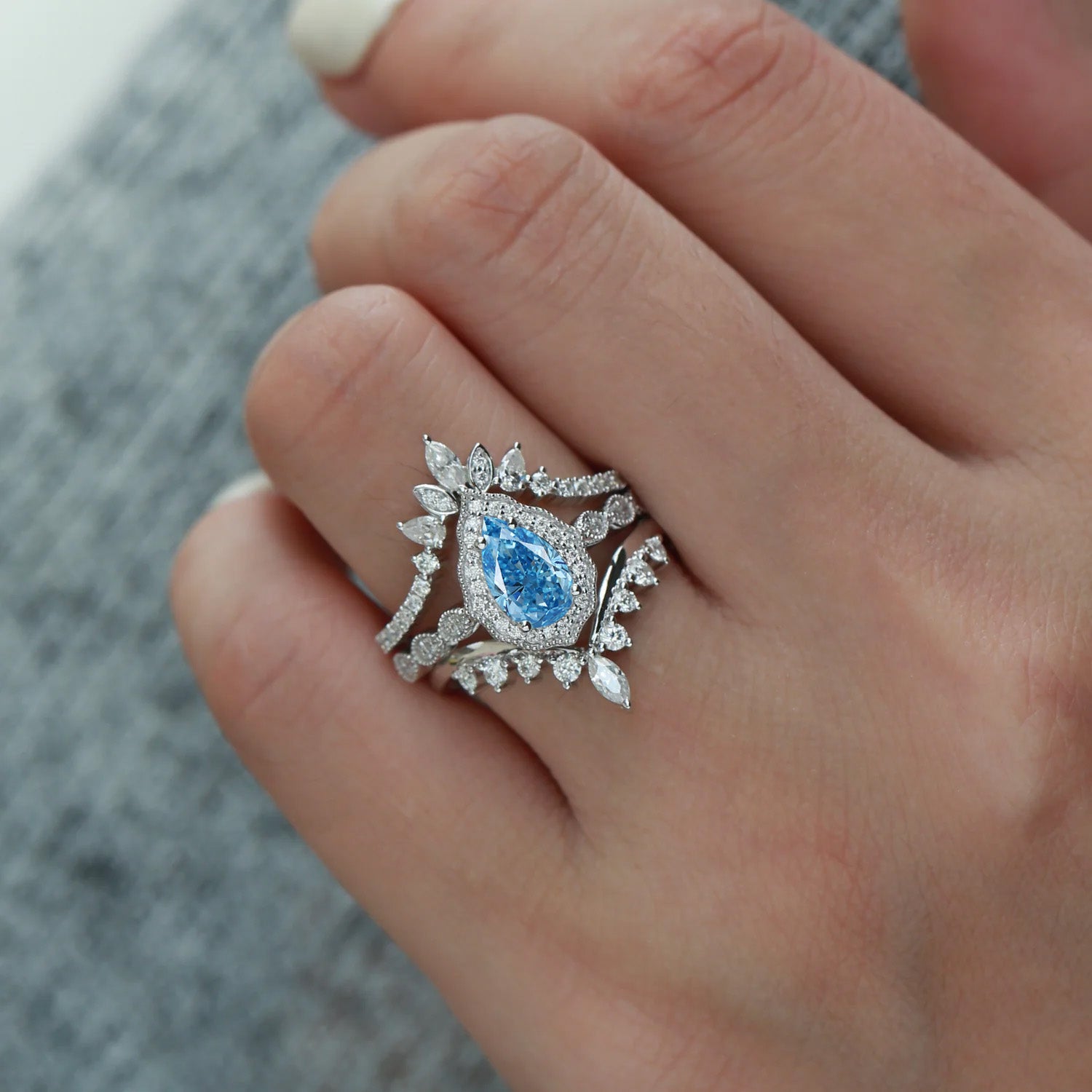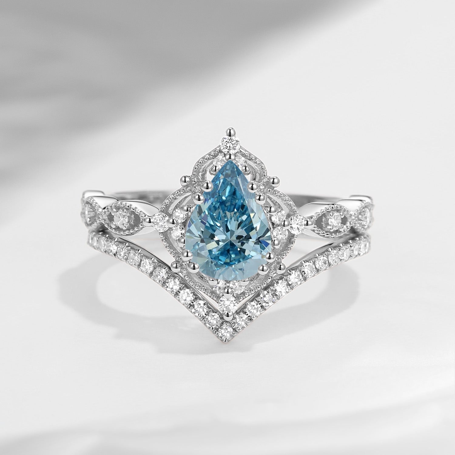 Antique Pear Cut Blue Lab Diamond Engagement Ring 2pcs