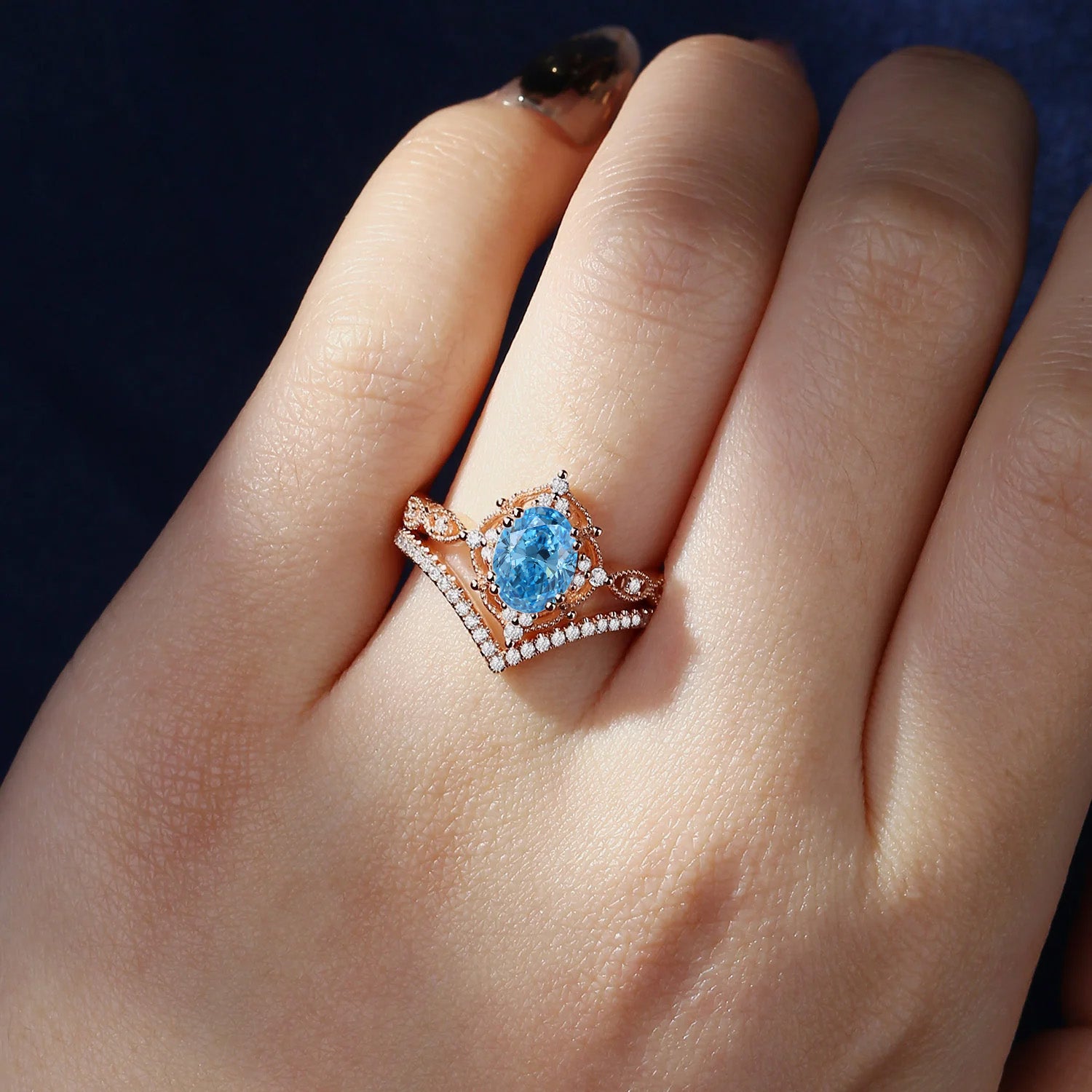 Oval Cut Vintage Inspired Blue Lab Diamond Bridal Set 2pcs